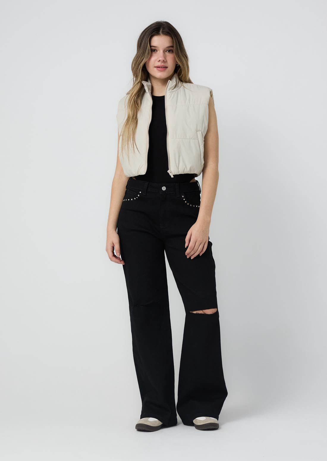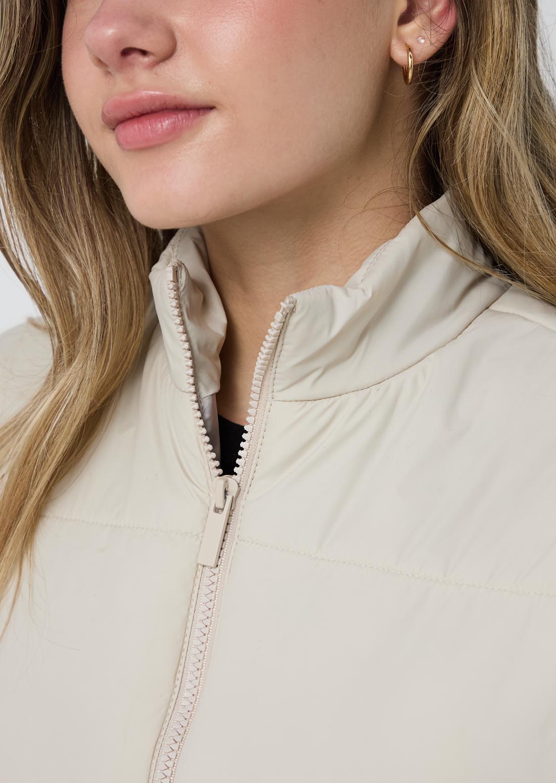 Chaleco puffer, manga sisa, color arena, cremallera en frente, largo crop y fondo entero para jóvenes.