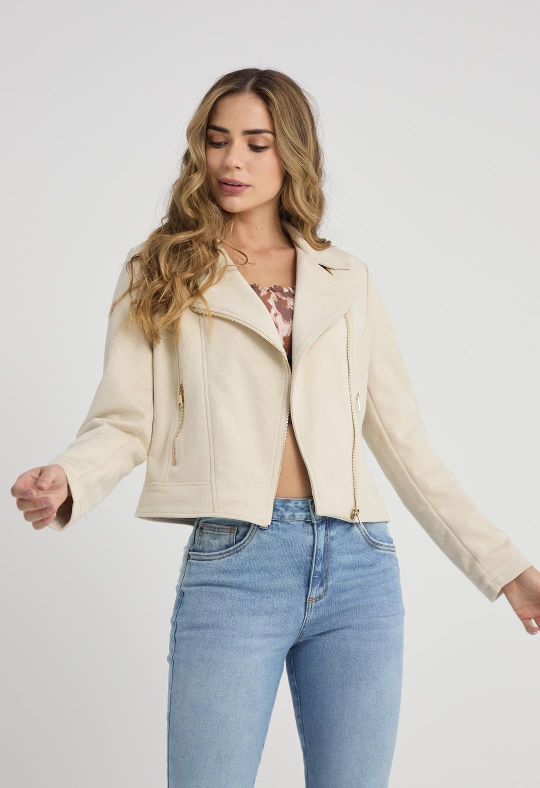 Chaqueta tipo biker, manga larga, color arena, con cierres metálicos y fondo entero para mujer.