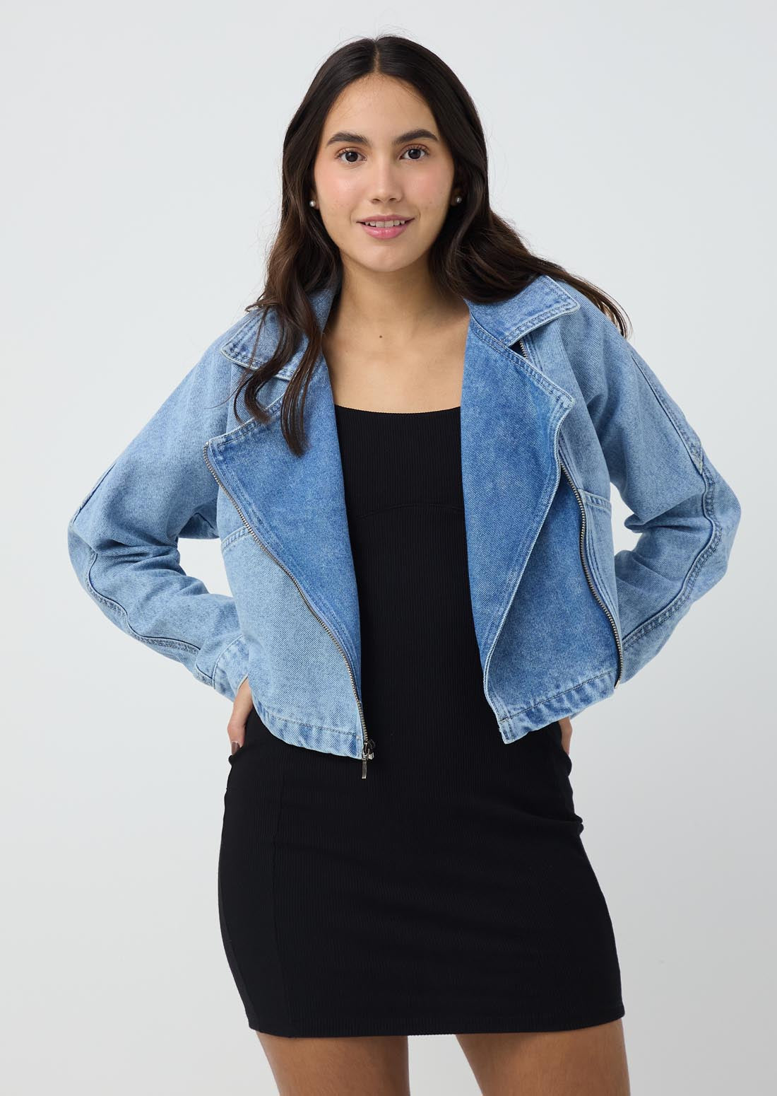 Chaqueta manga larga, lavado claro, tipo biker y fondo entero para jóvenes.