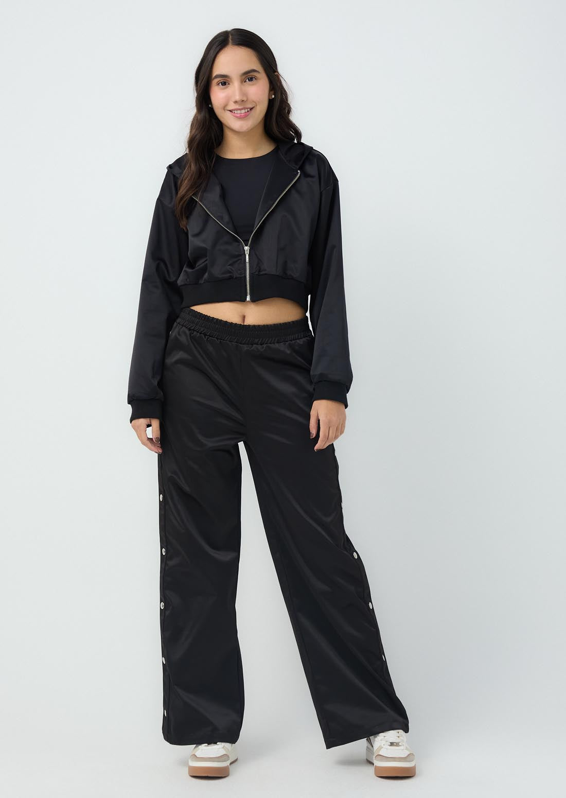 Chaqueta manga larga, color negro, con puños en rectilíneo y fajón para jóvenes.