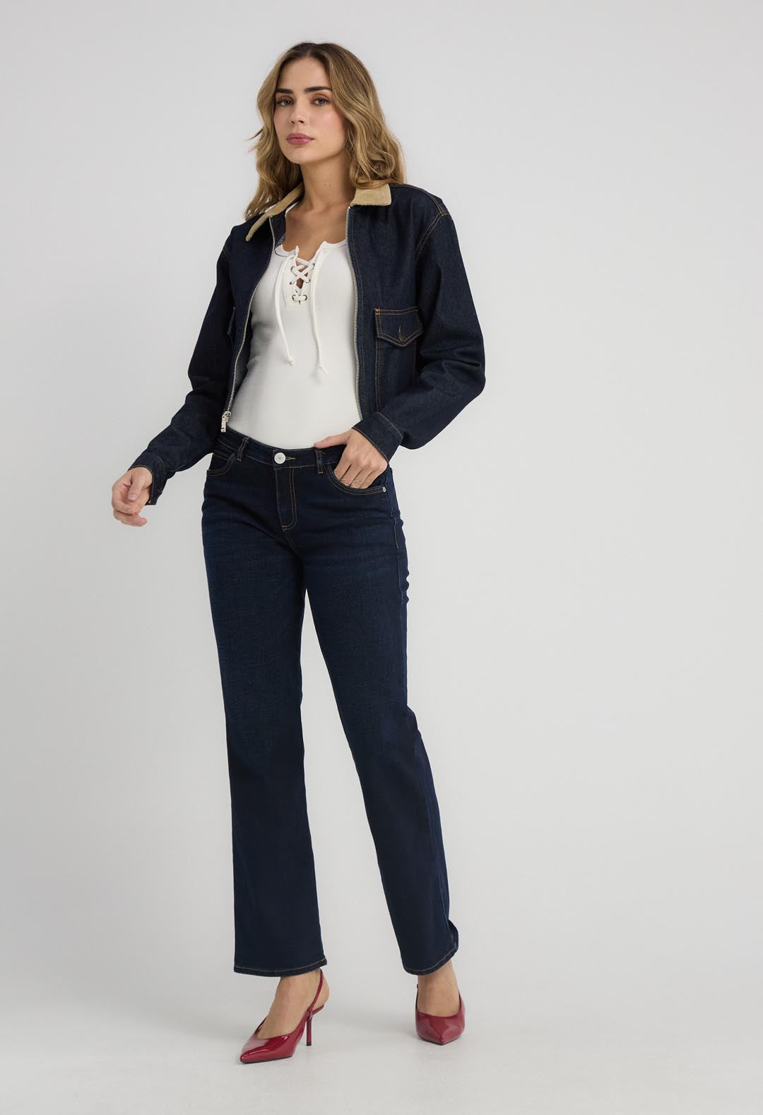 Chaqueta manga larga, lavado oscuro, en denim, cremallera en frente y cuello camisero en corduroy para mujer.