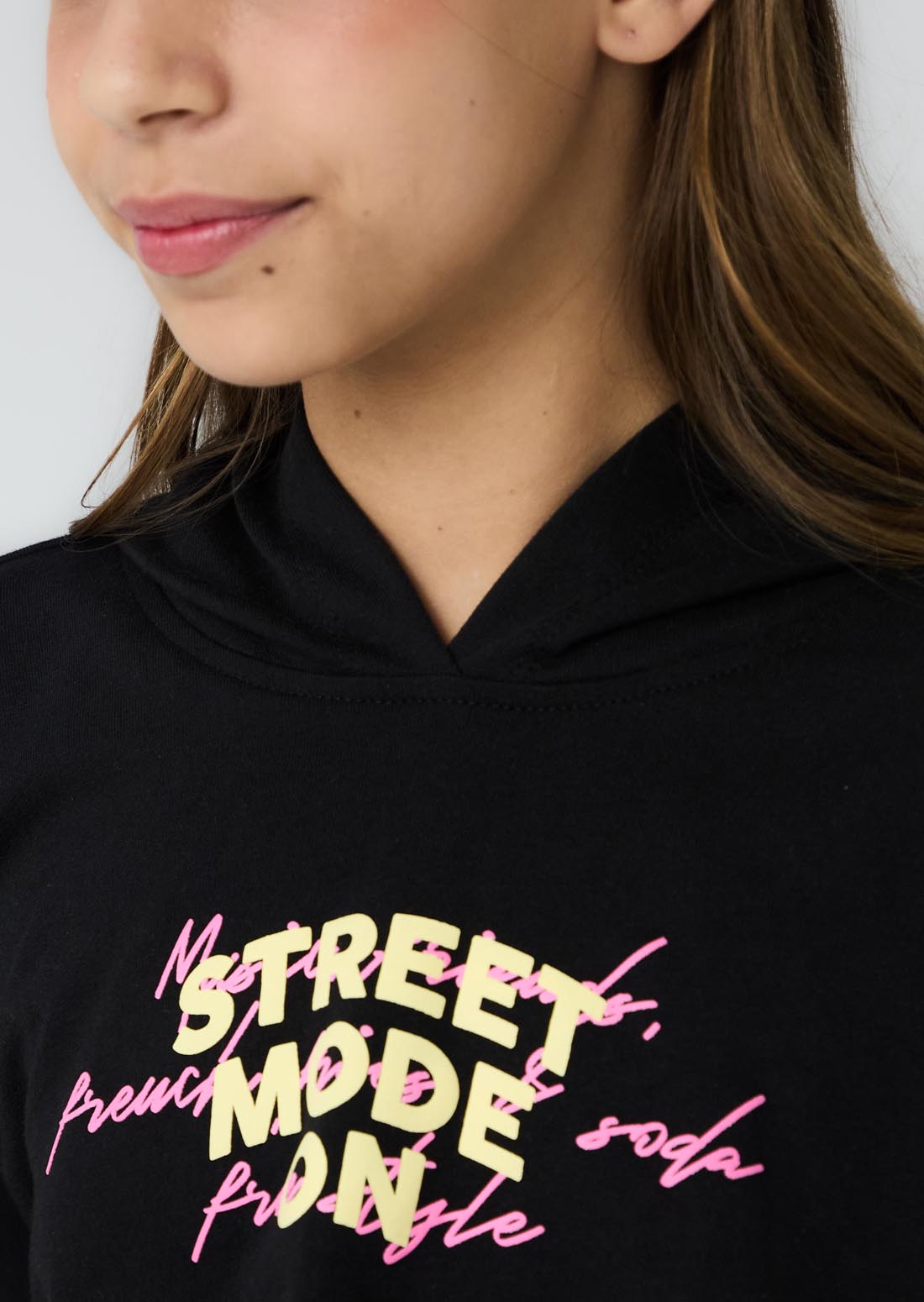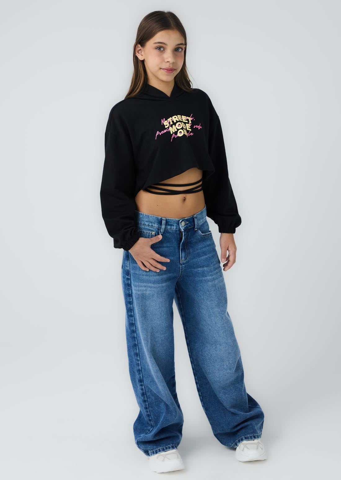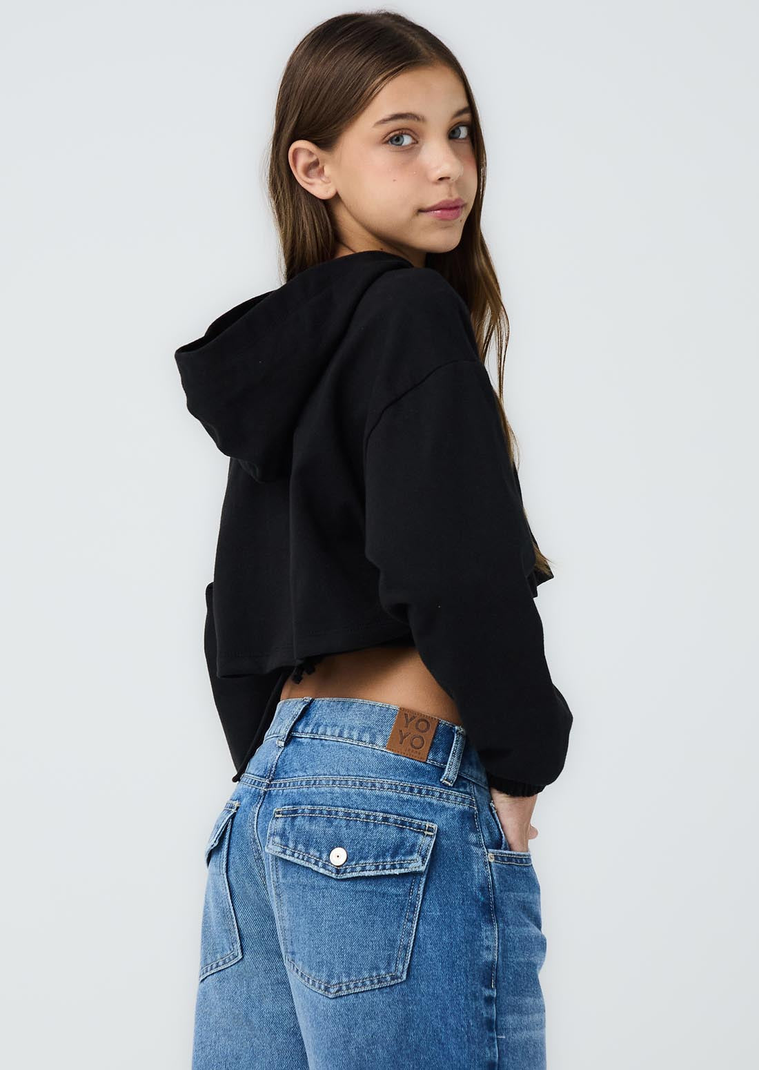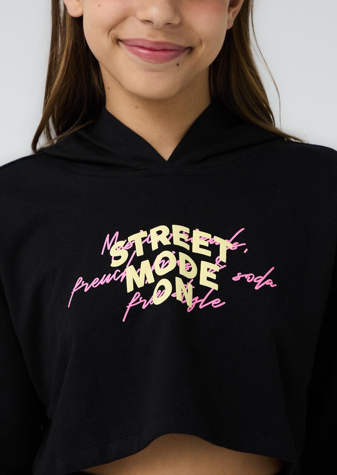 Chompa manga larga, color negro, largo crop, estampada en frente, tiras en cintura y puños en rib para niñas.