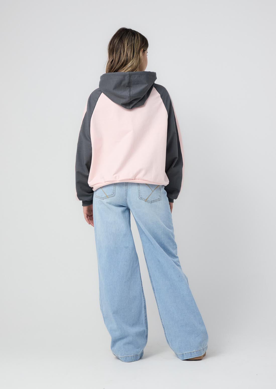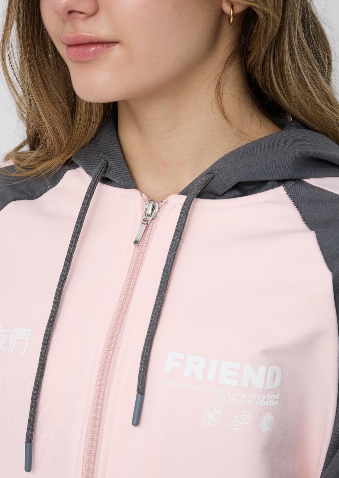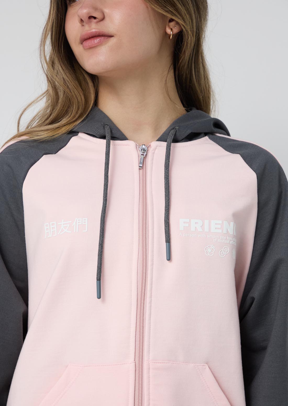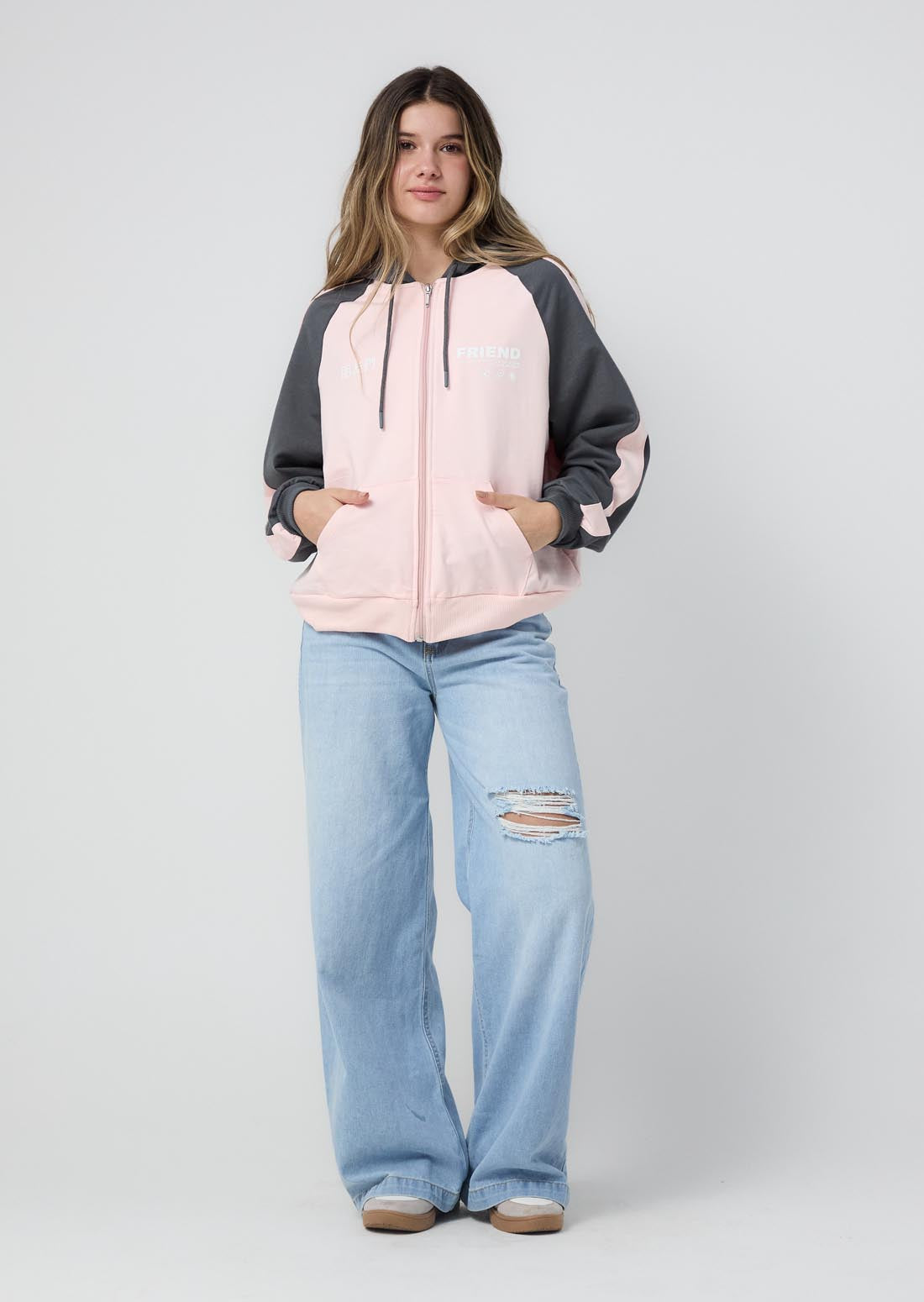 Chompa manga larga, color rosa pastel, piezas en contraste, estampado en frente, cierre funcional, con cordón, puños y fajón en rib para jóvenes.