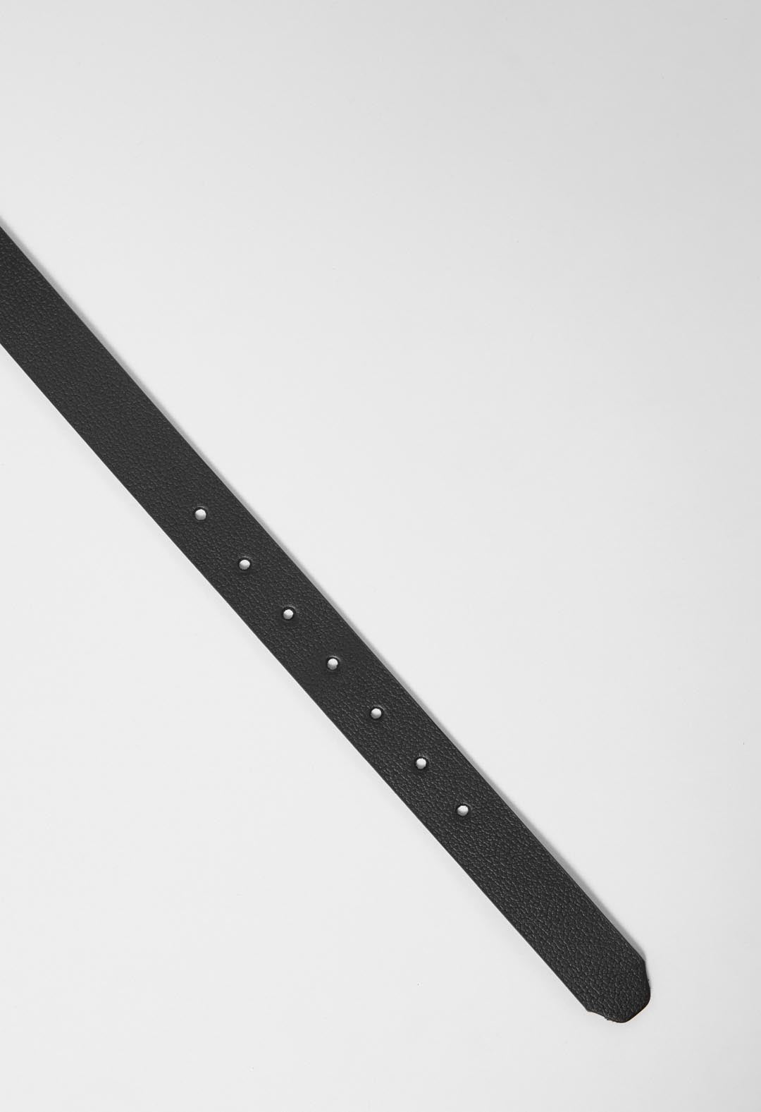 Cinturón en cuero, color negro, hebilla redonda y aplique en pasador.