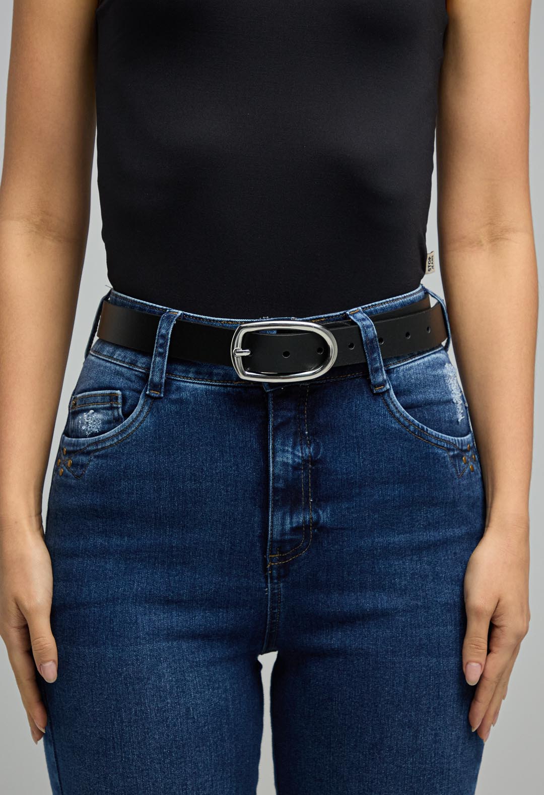 Cinturón color negro y hebilla asimétrica.