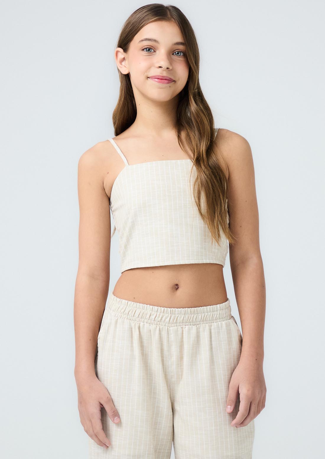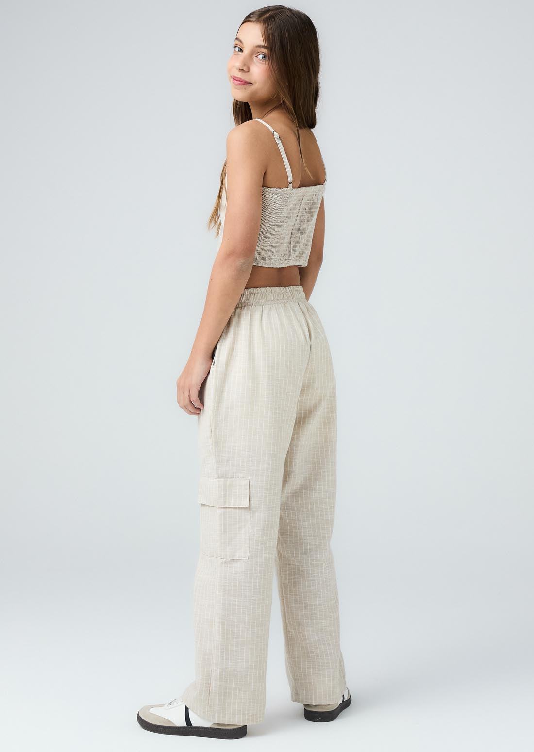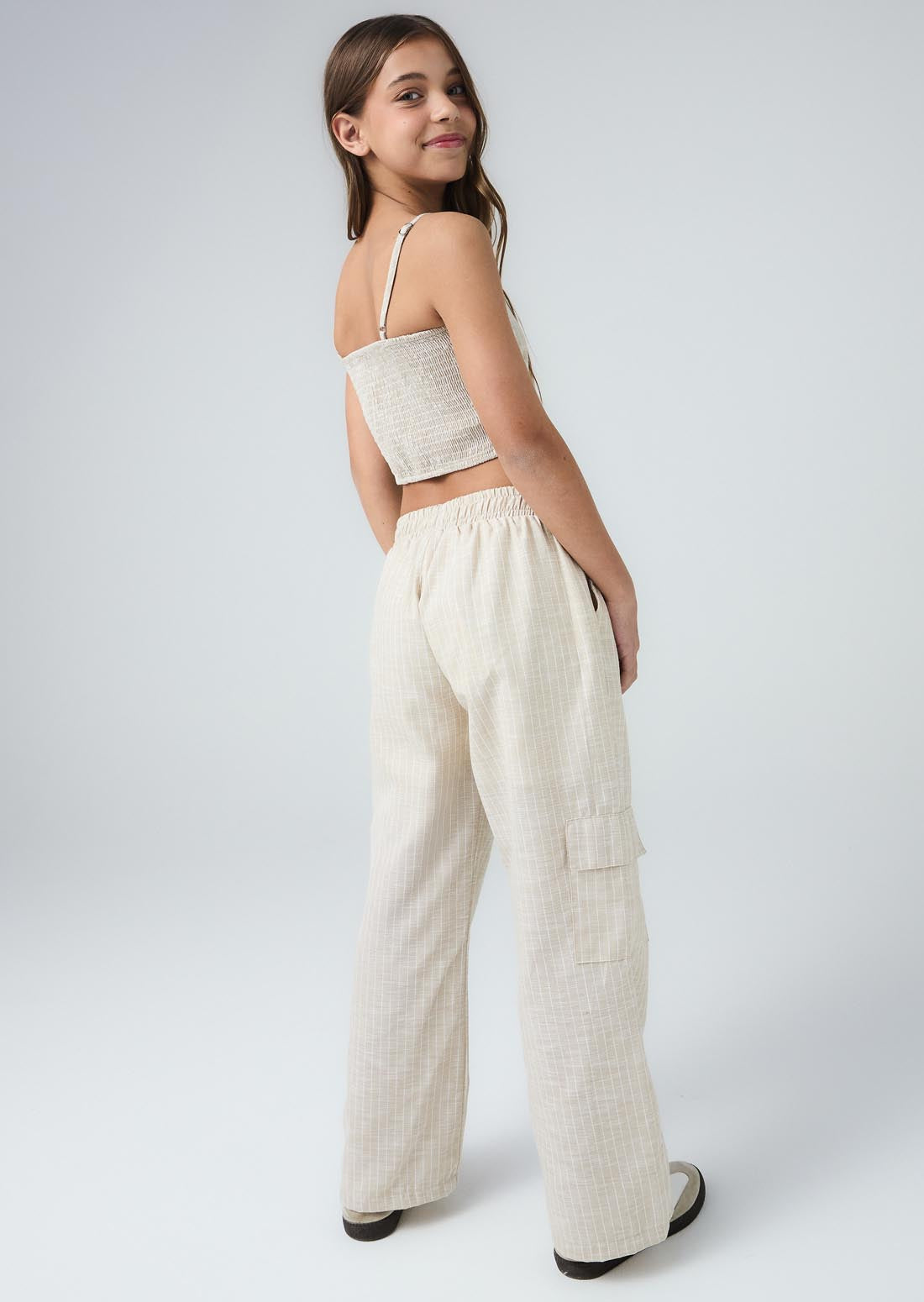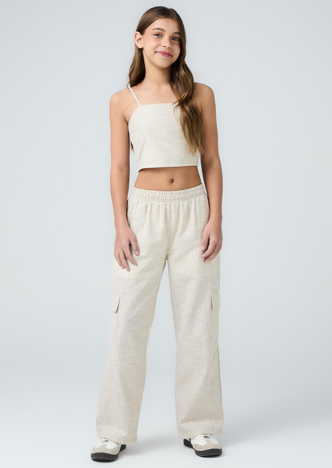 Conjunto color arena, full print de rayas, blusa de tiras y pantalón con bolsillo cargo para niñas.