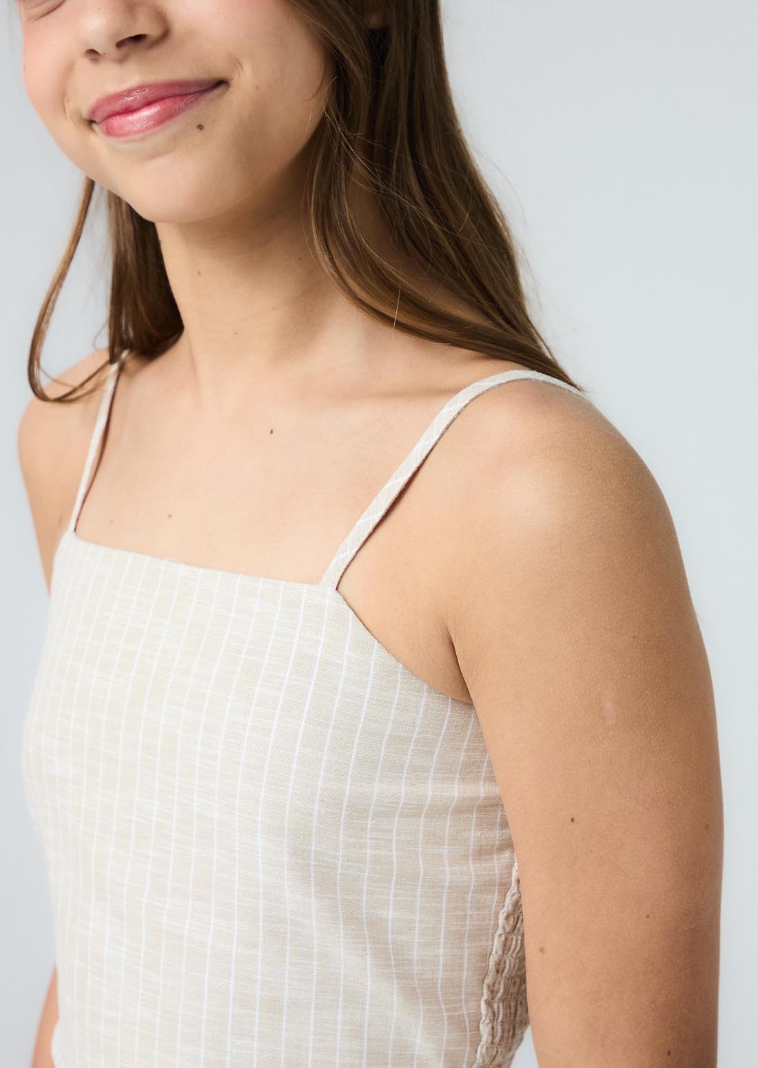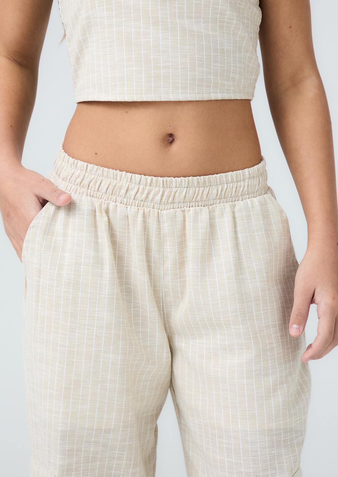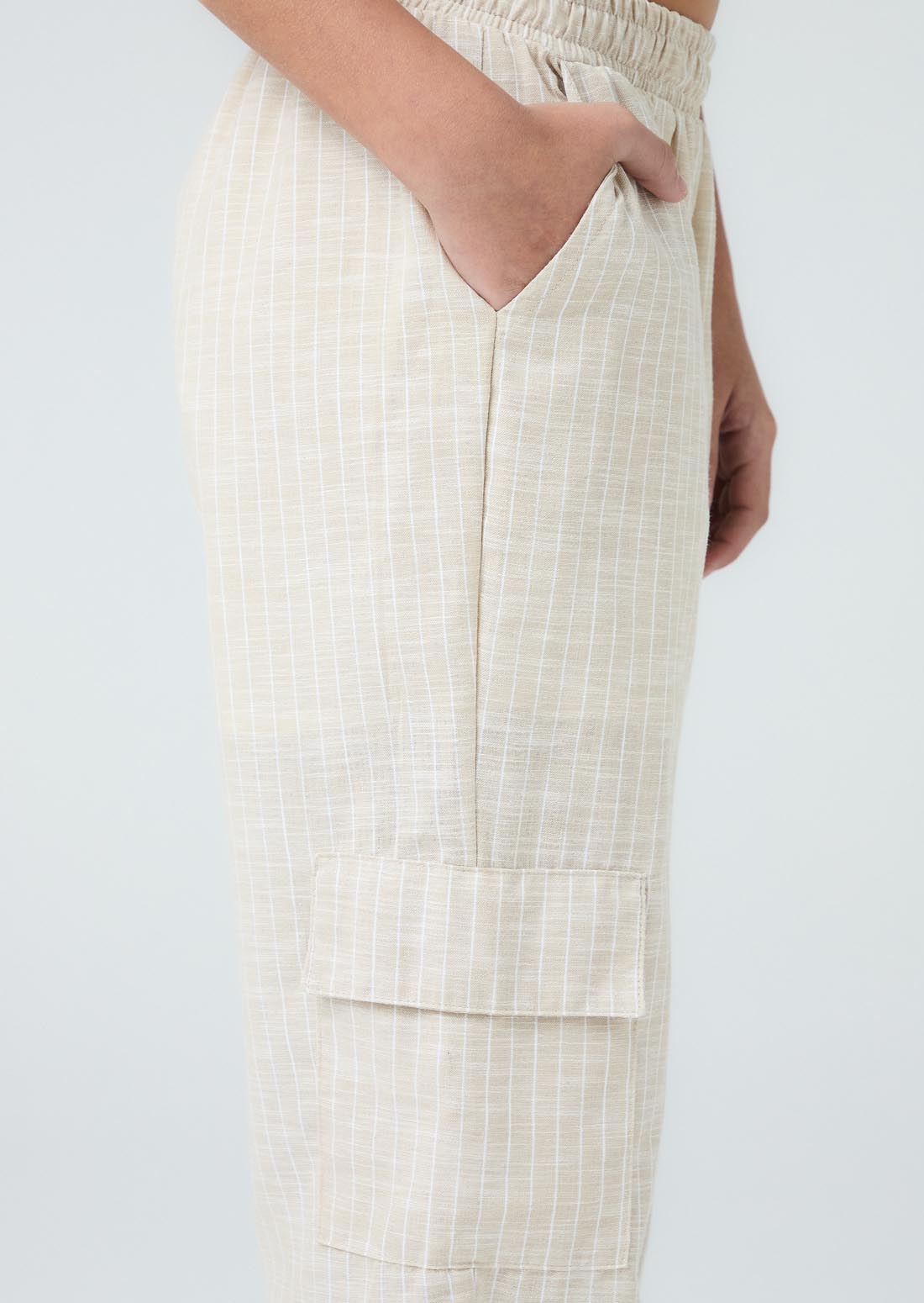 Conjunto color arena, full print de rayas, blusa de tiras y pantalón con bolsillo cargo para niñas.