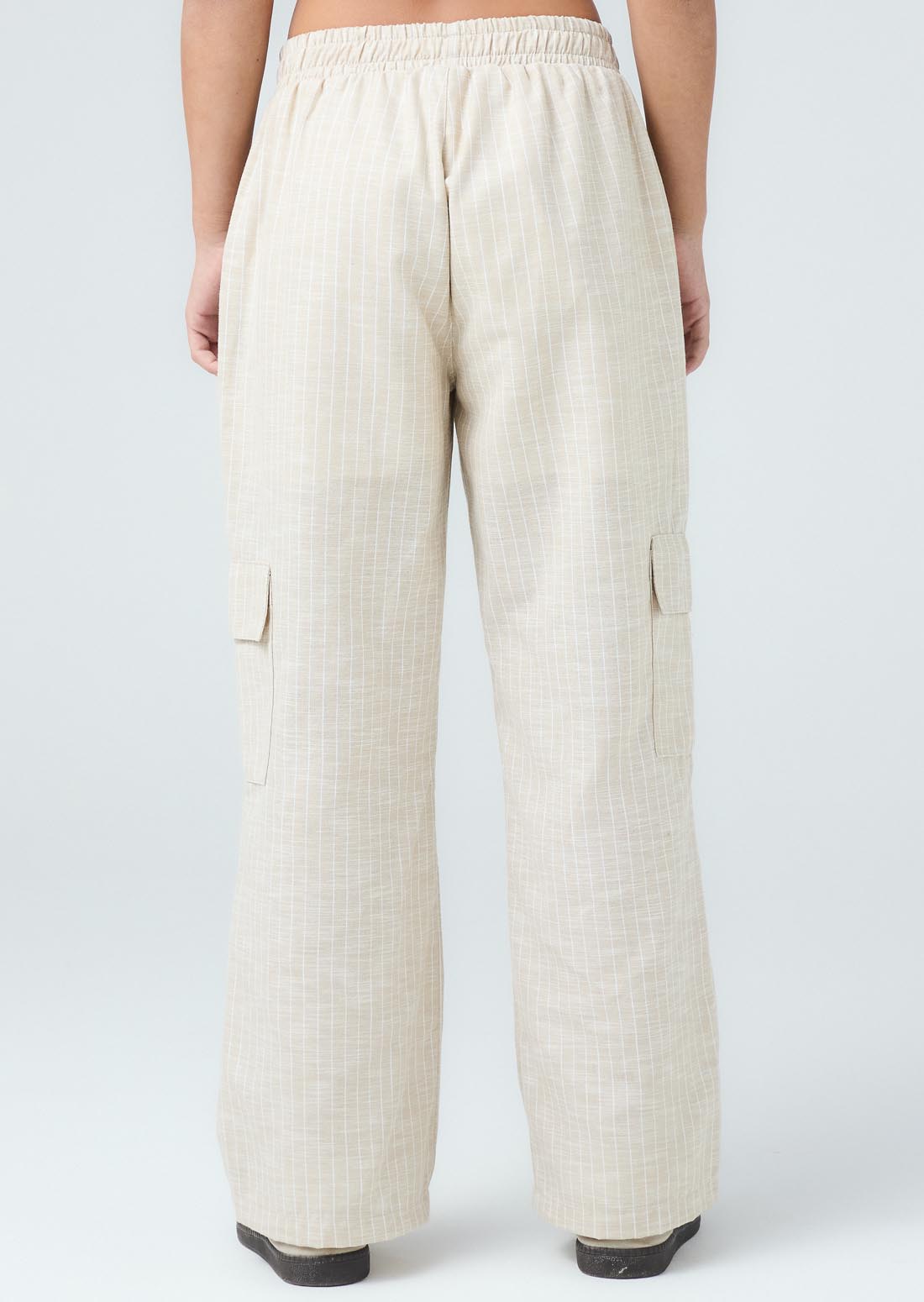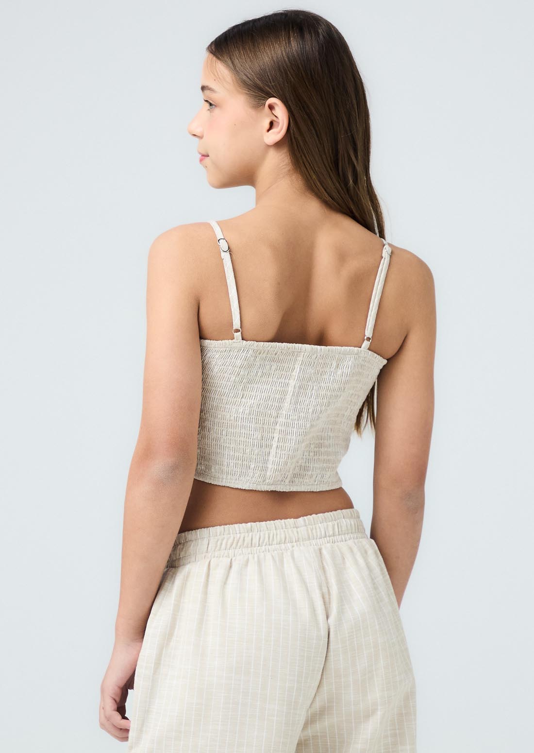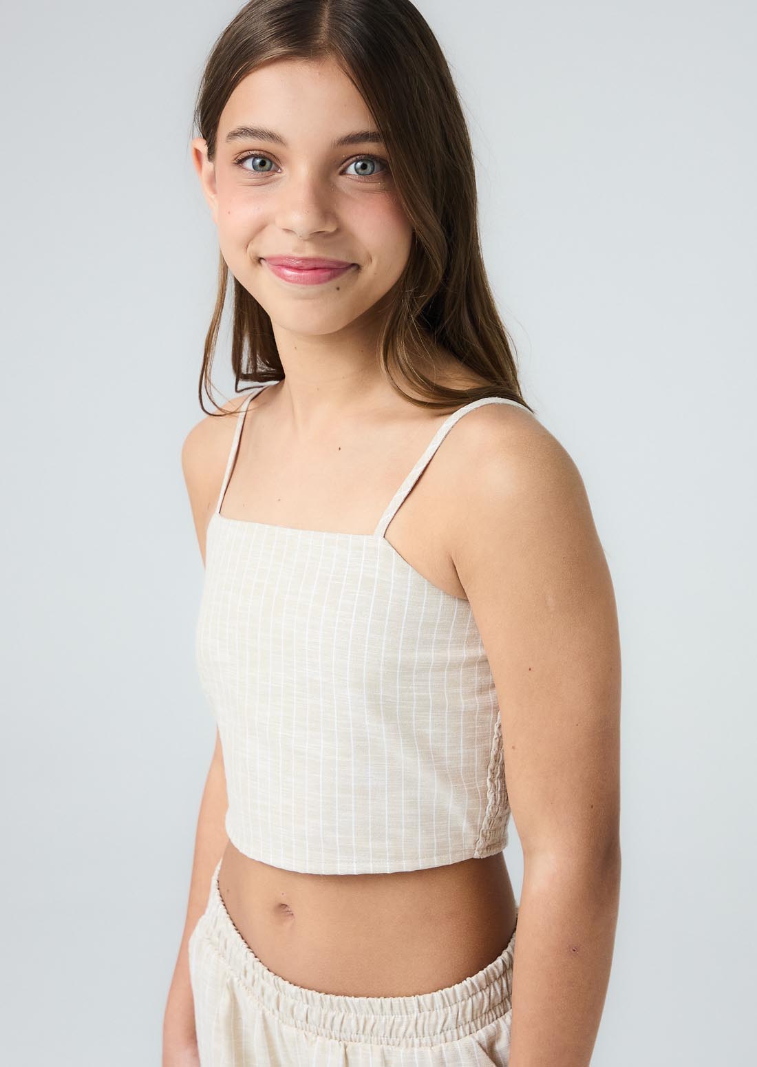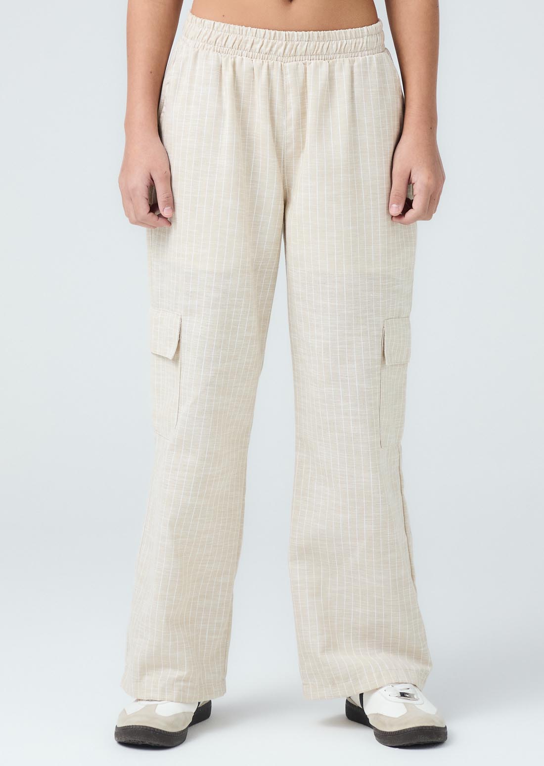 Conjunto color arena, full print de rayas, blusa de tiras y pantalón con bolsillo cargo para niñas.