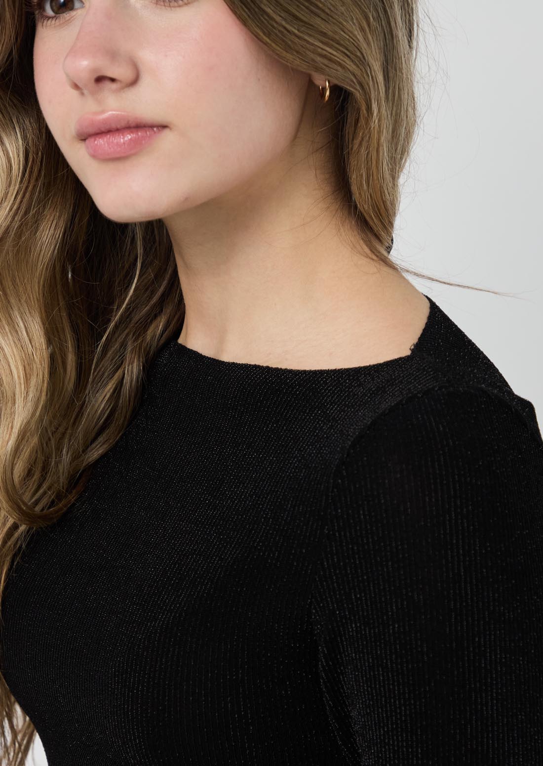 Conjunto negro, camiseta manga sisa y falda con brillos para jóvenes.
