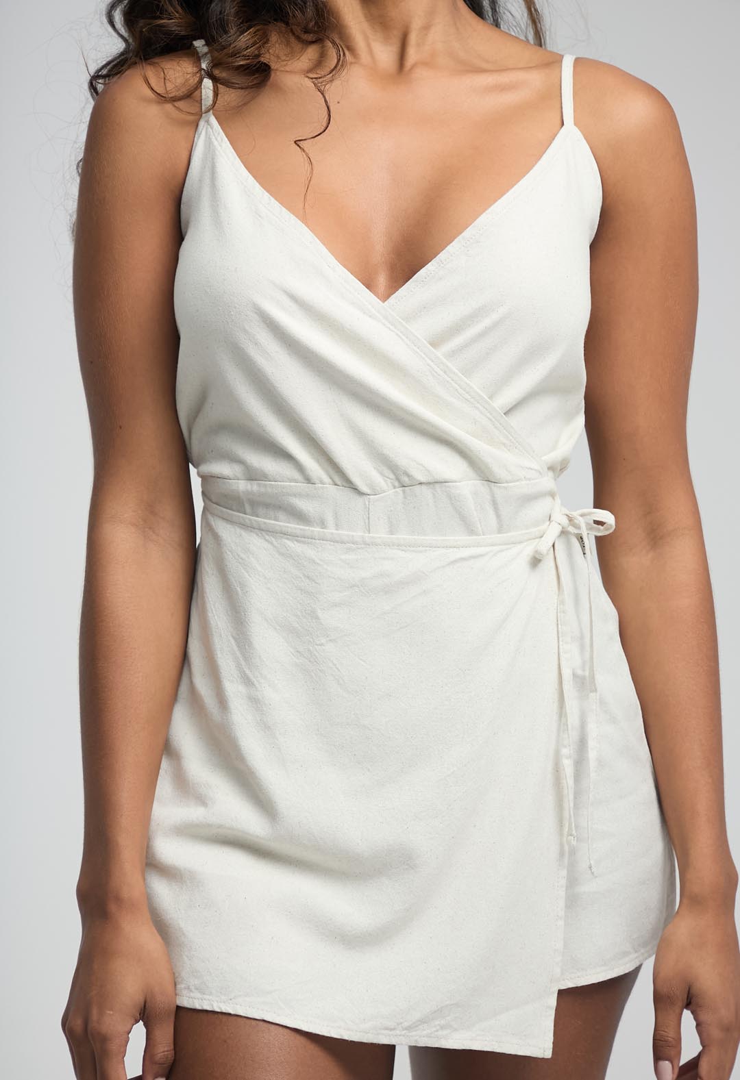 Enterizo corto, tiras, color arena, cruzado en frente y fondo entero para mujeres.