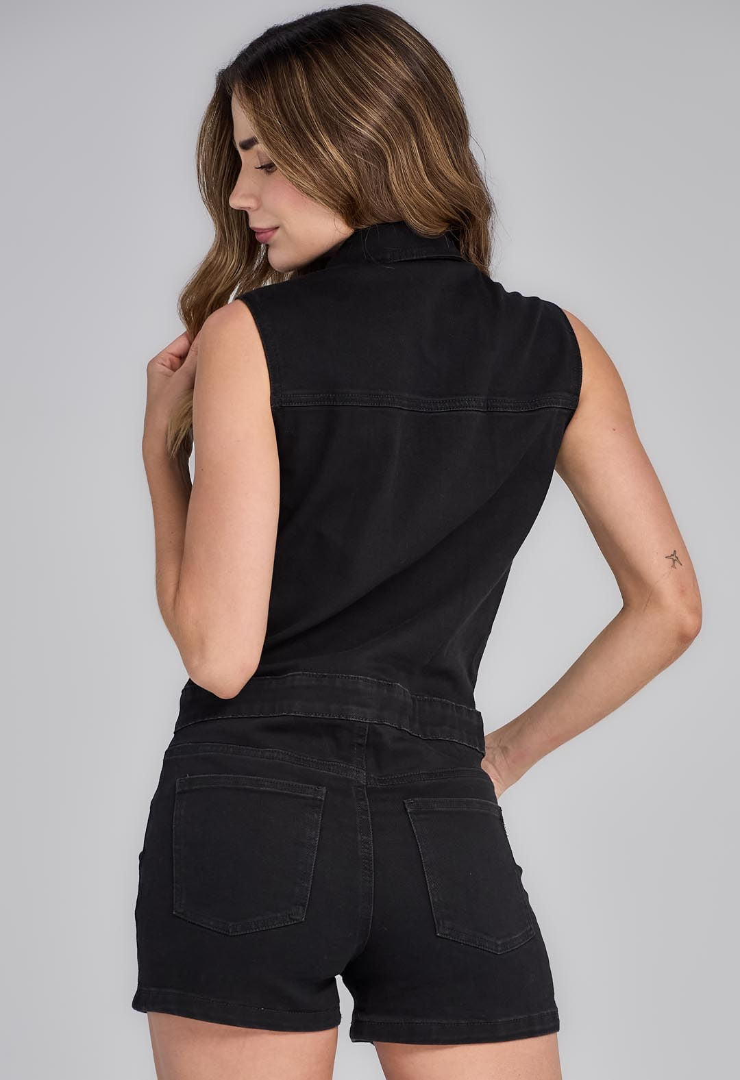 Enterizo corto, color negro, cortes en parte superior y bolsillos funcionales para mujeres.