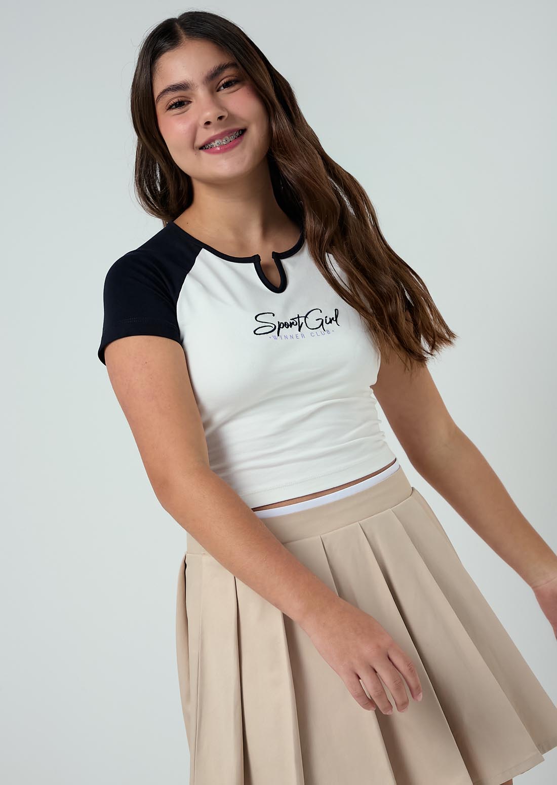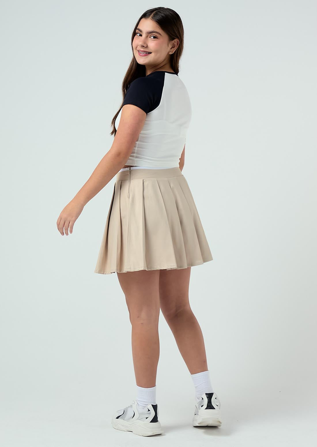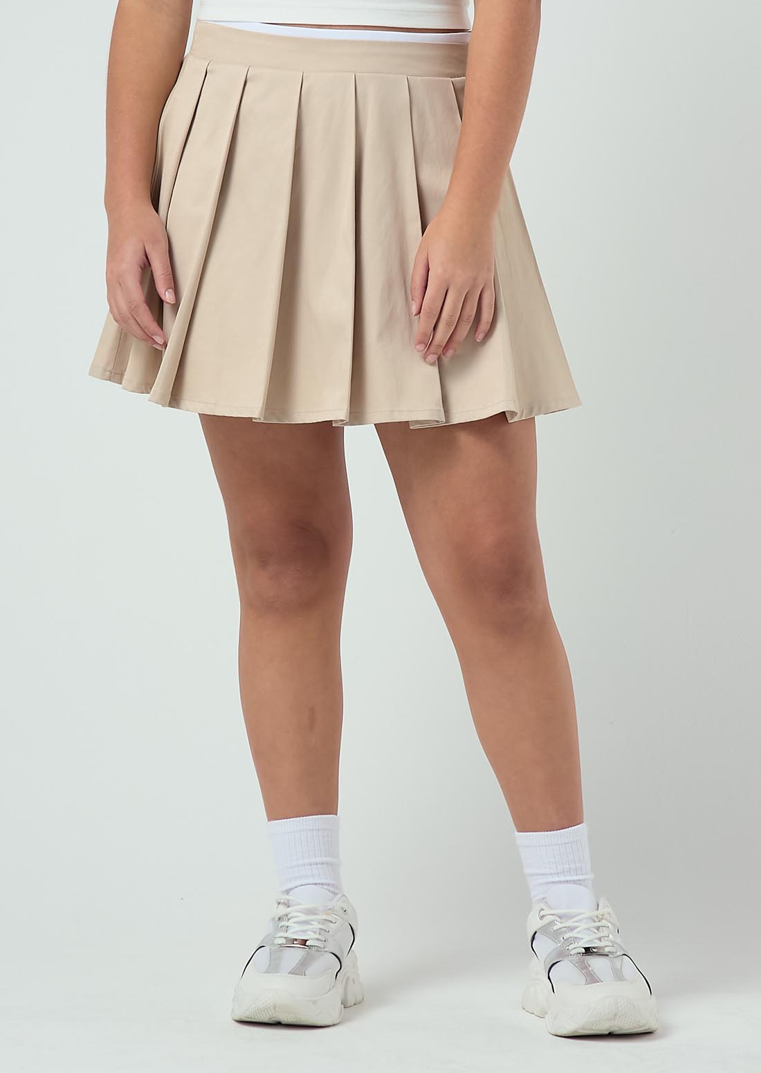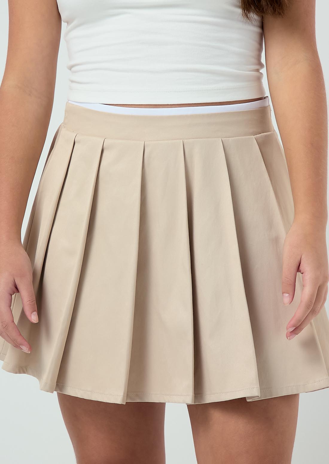 Falda tiro alto, color arena, fondo entero y tableada para adolescentes.