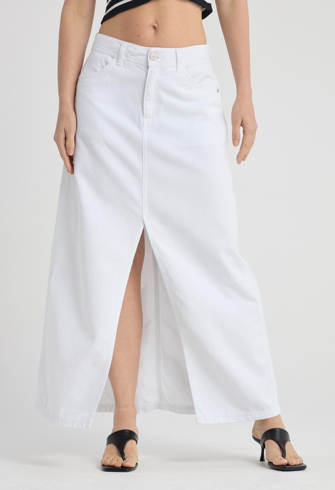 Falda tiro alto, color blanco, fondo entero y con abertura para mujer.