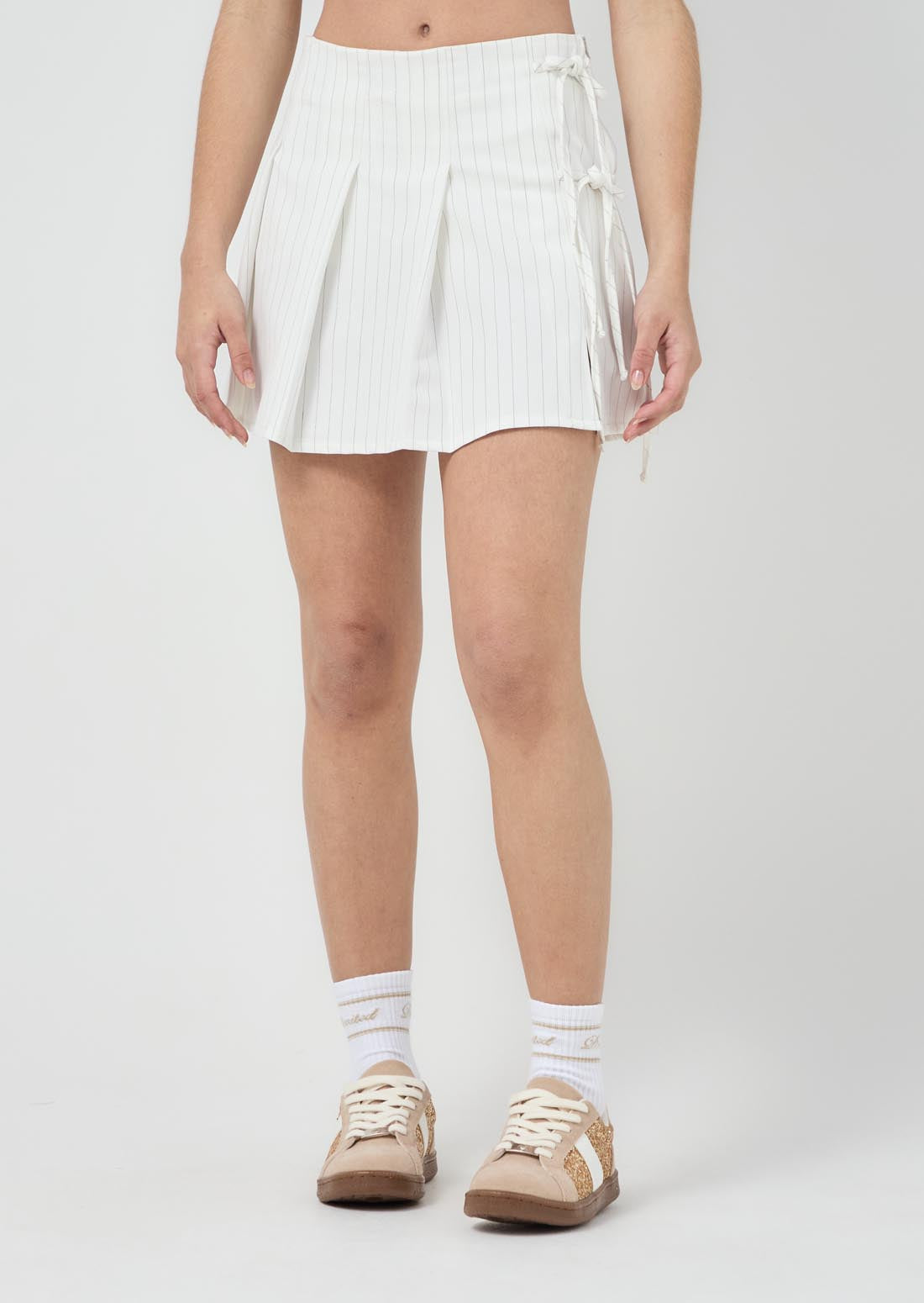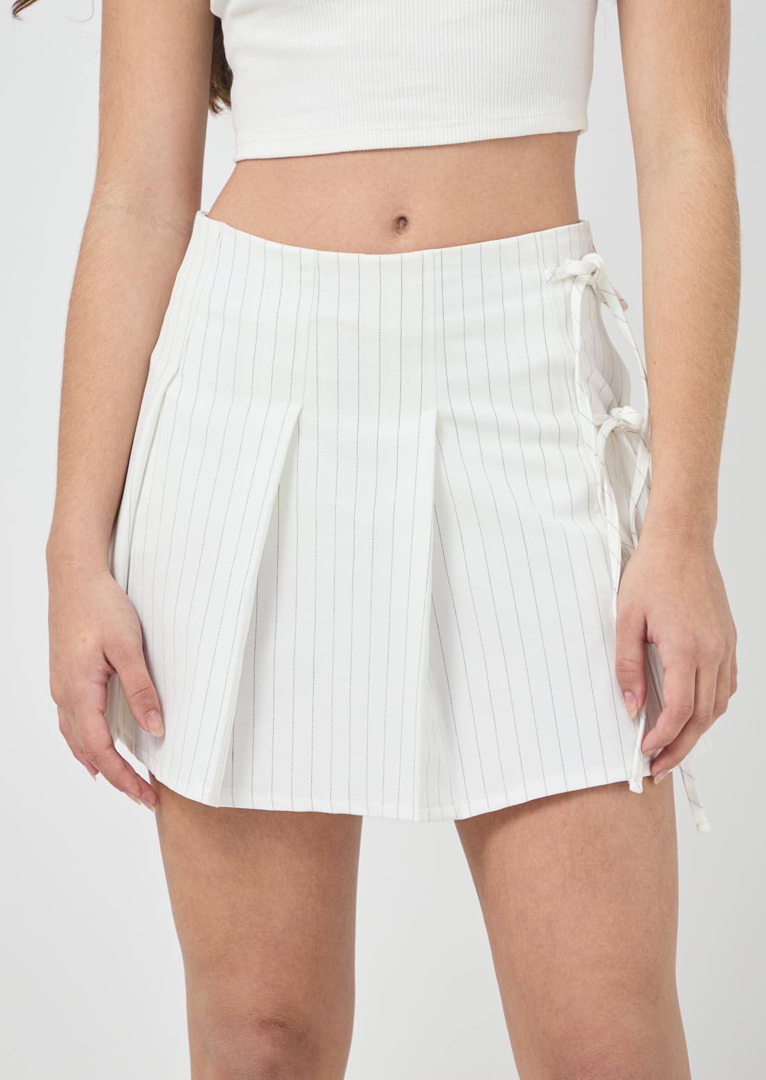 Falda corta, color marfil, de tablas, con short interno y fondo entero para jóvenes.
