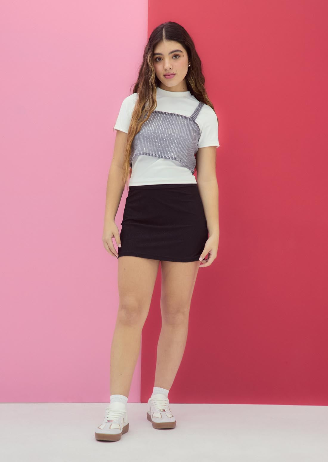 Falda corta negra con brillos para jóvenes