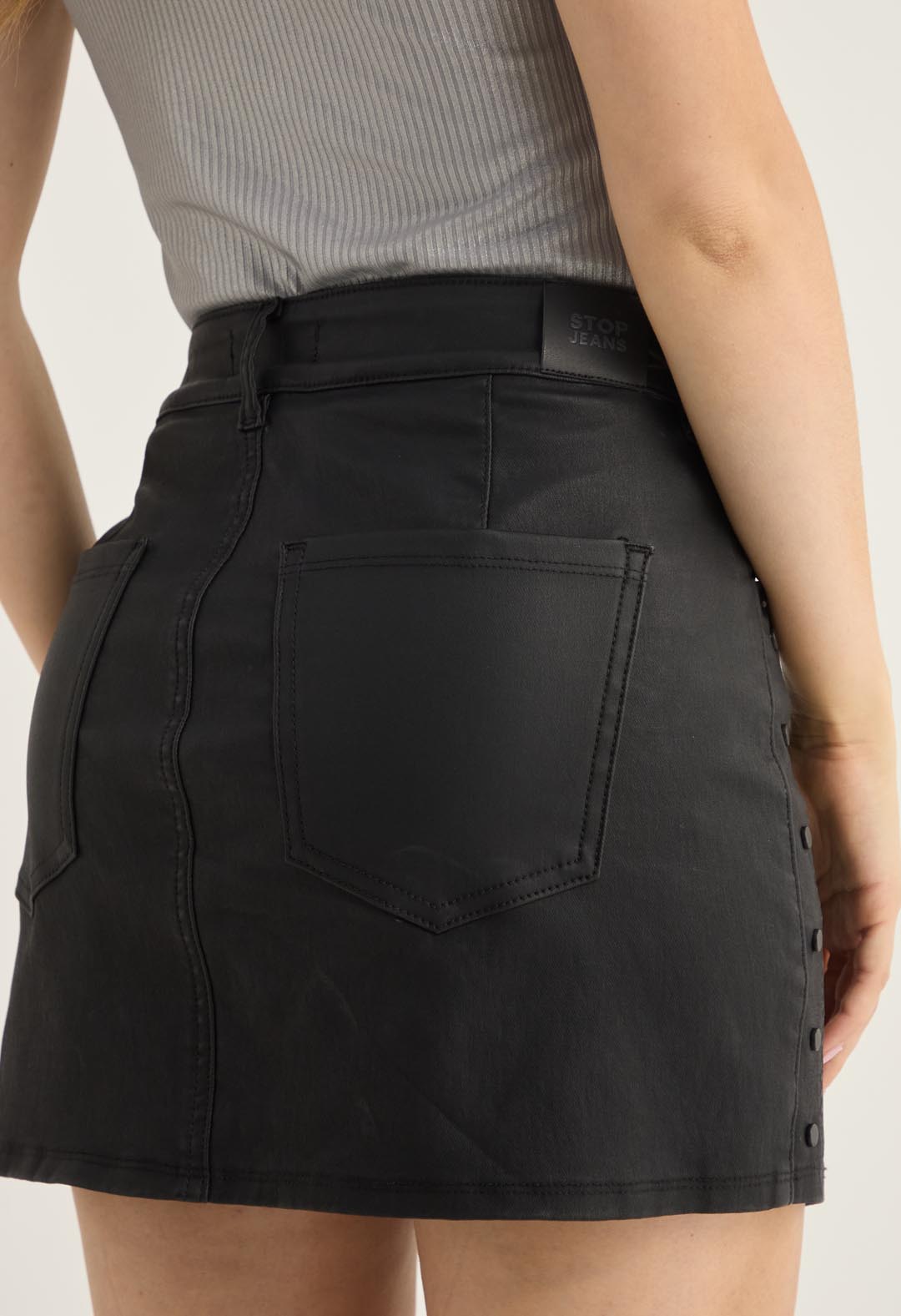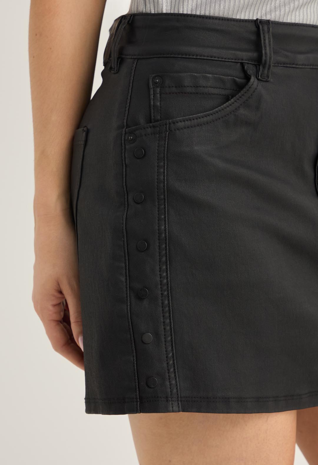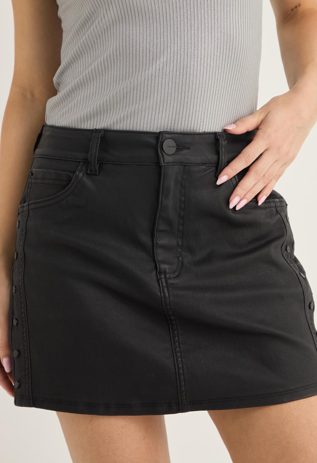 Falda tiro alto, color negro, corta y con remaches en costados para mujer.