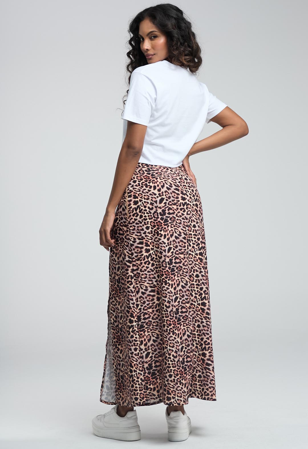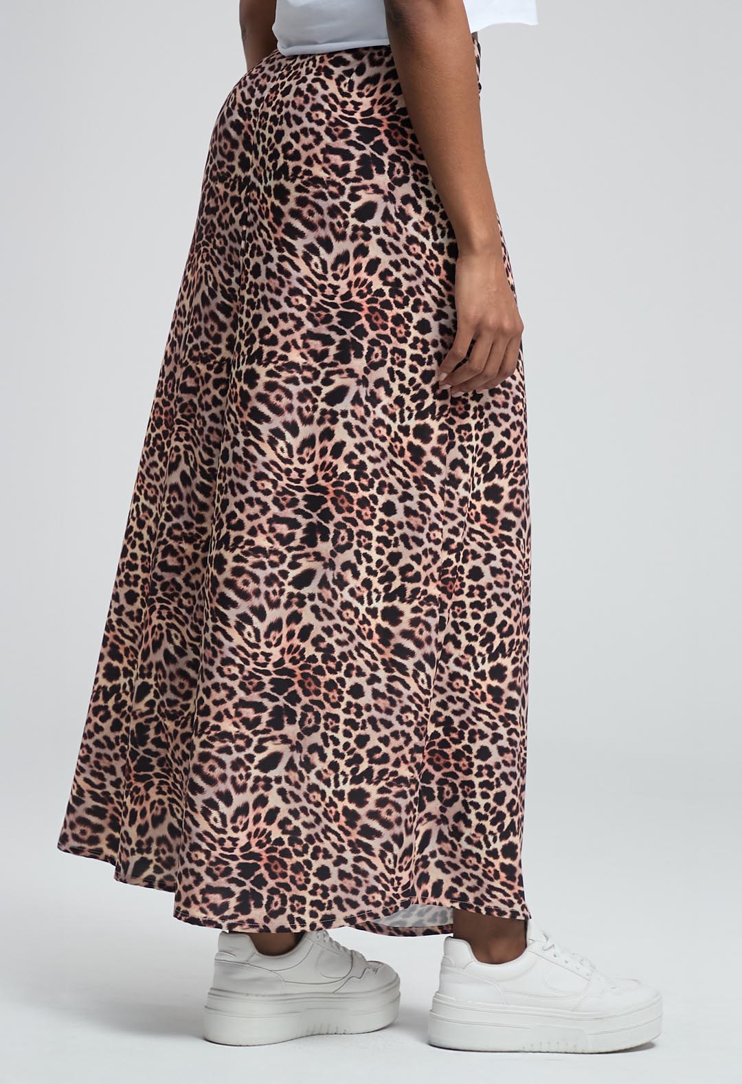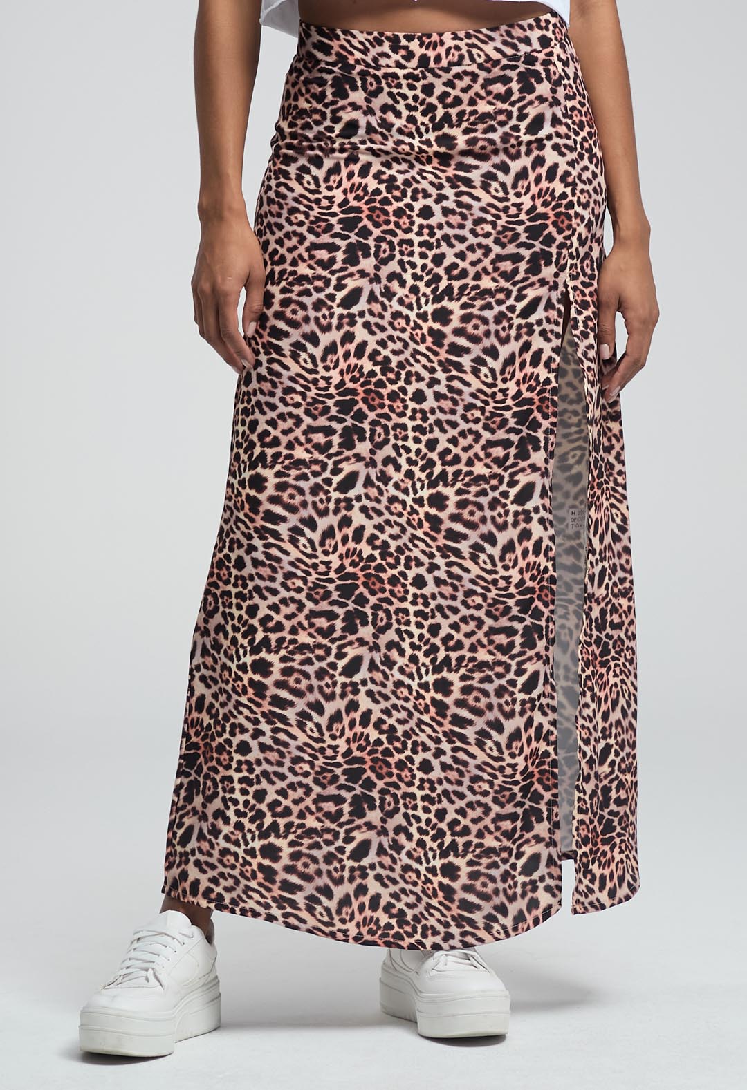 Falda larga, tiro alto, color arena, full print y abertura en costado para mujeres.