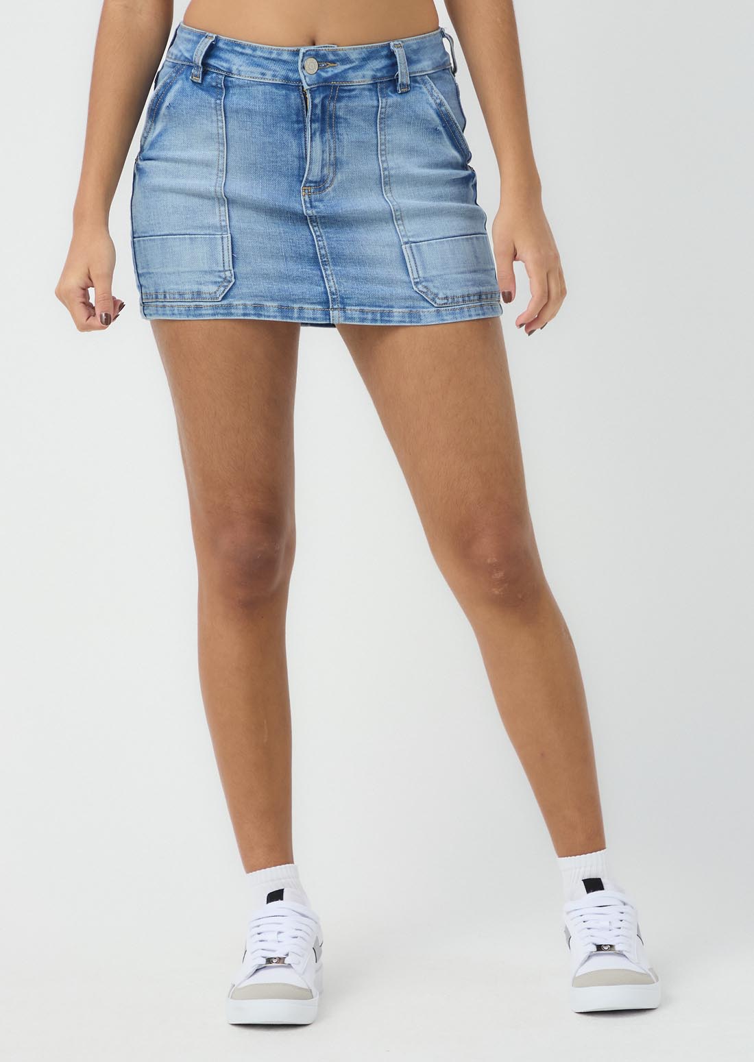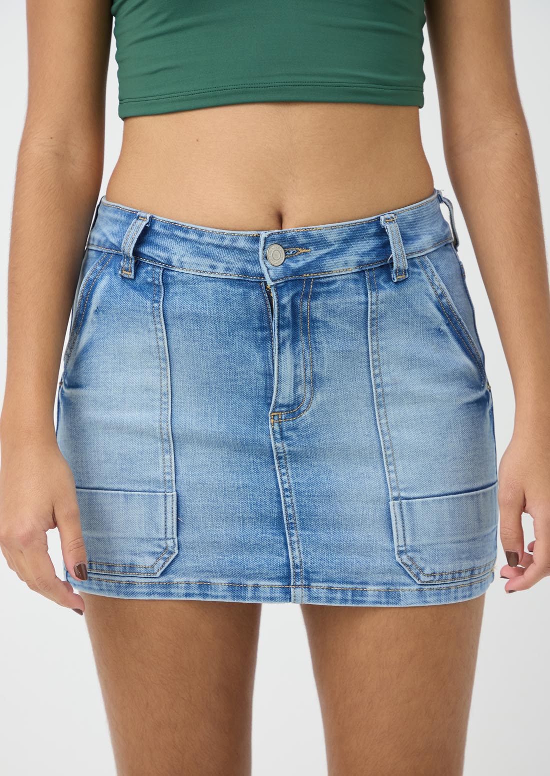 Falda tiro alto, lavado medio, en denim, con short interno y bolsillos tipo parche para jóvenes.