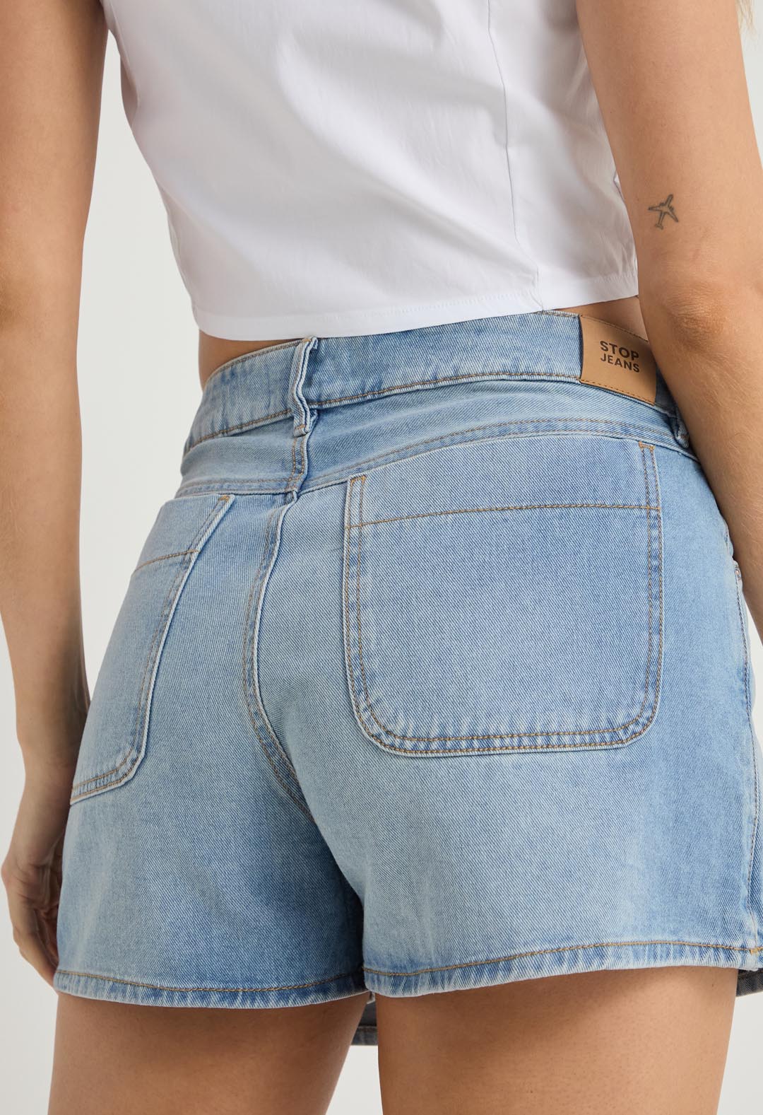 Falda short tiro alto, lavado claro, fondo entero y bolsillo matera para mujeres.