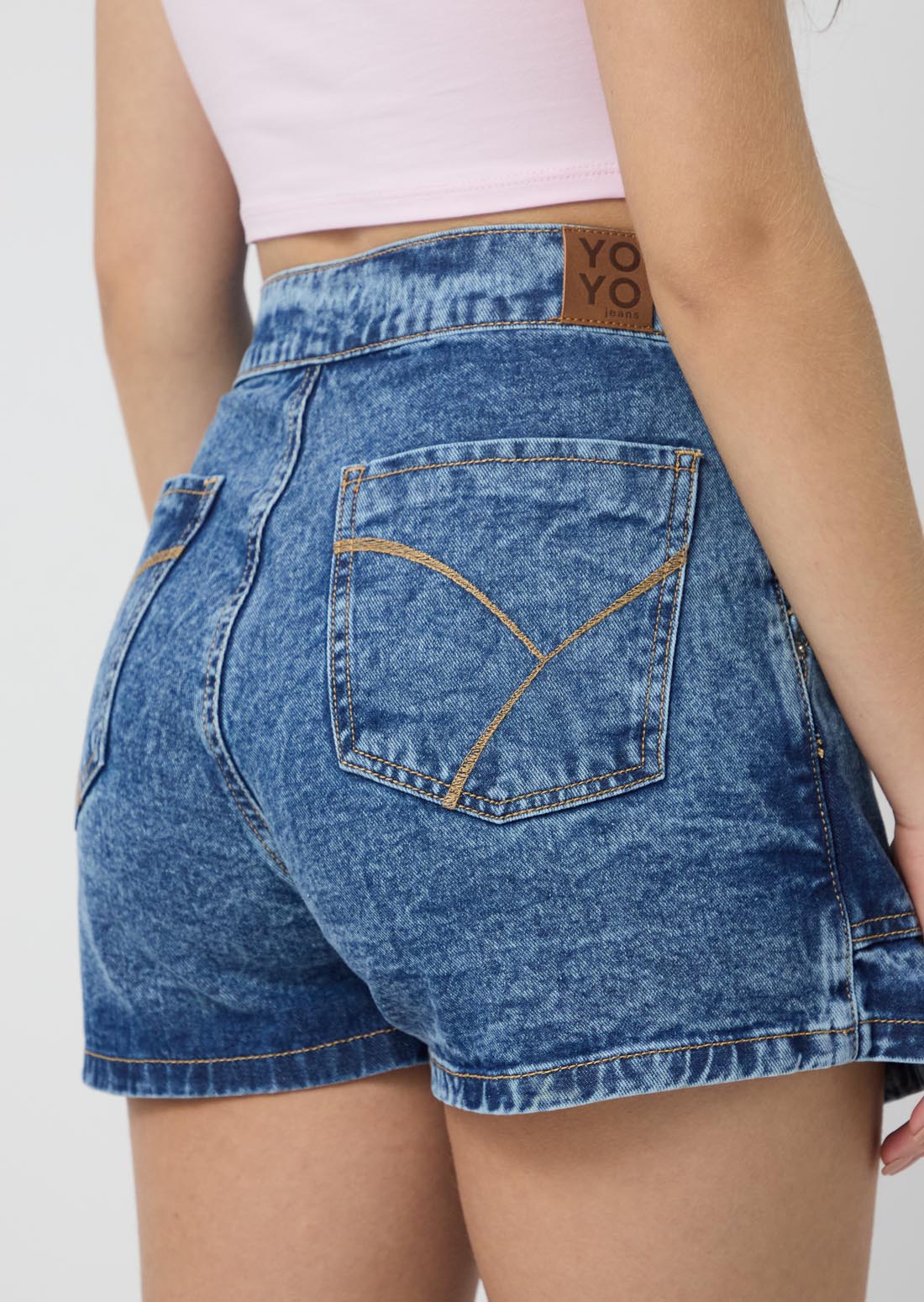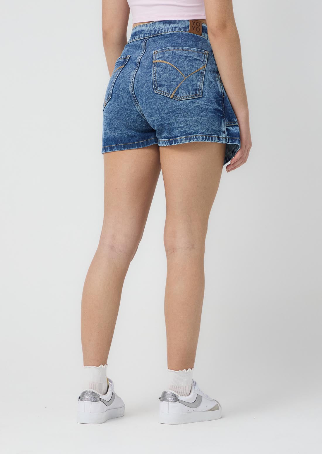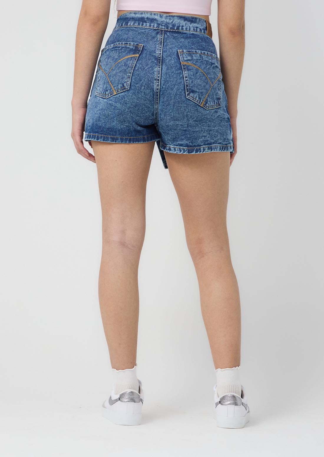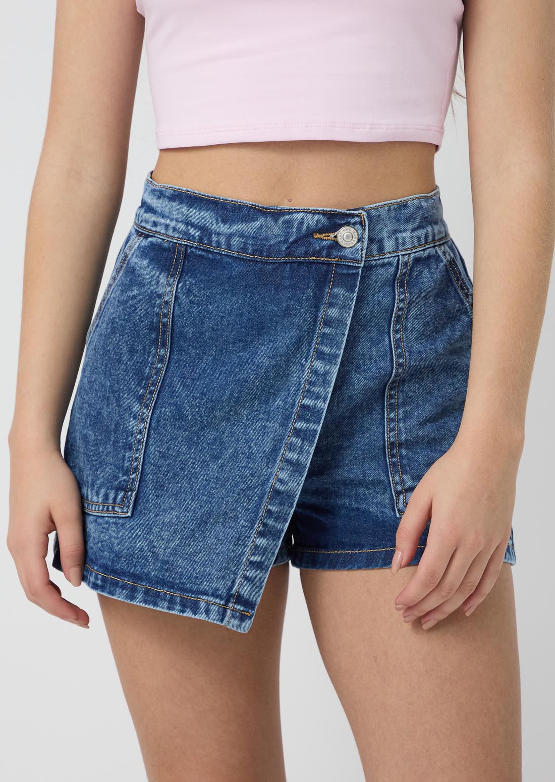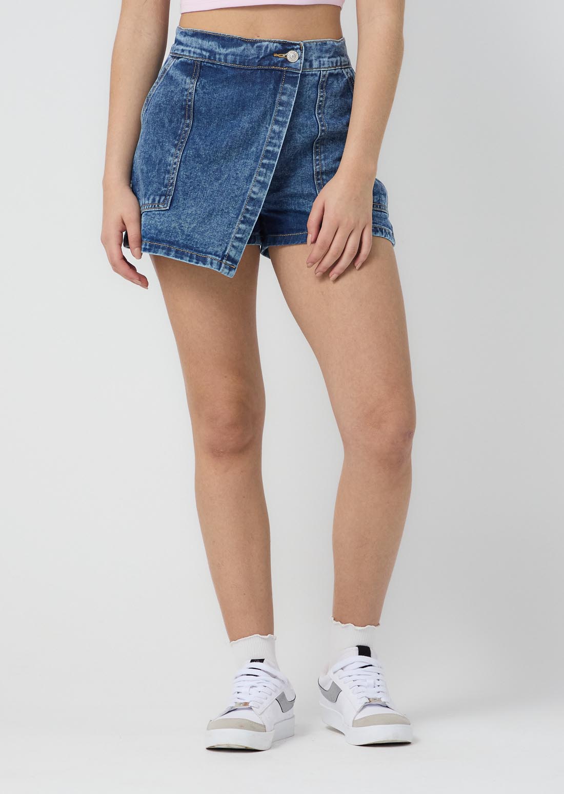 Falda short, corto, tiro alto, lavado medio oscuro, en denim y fondo entero para jóvenes.