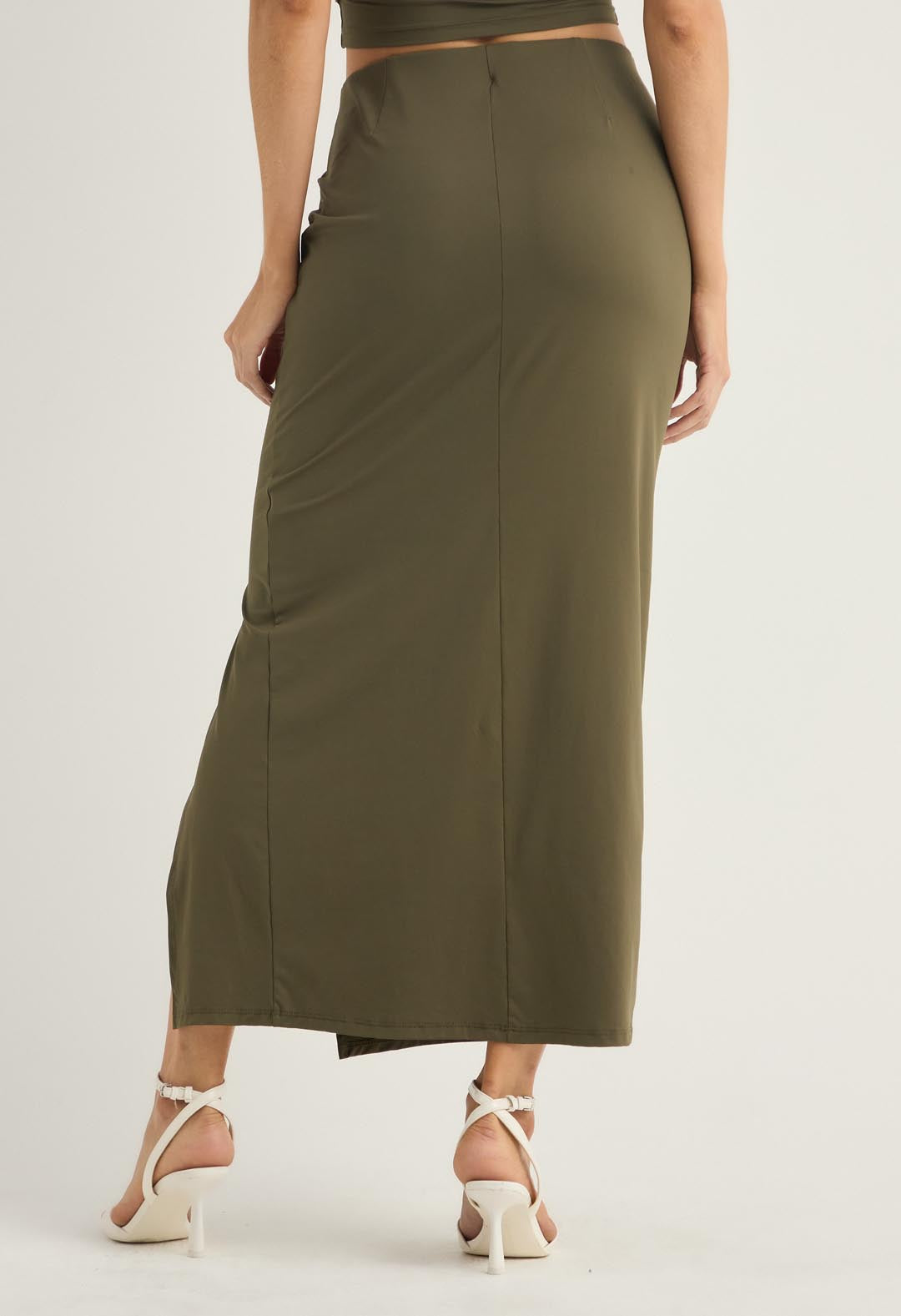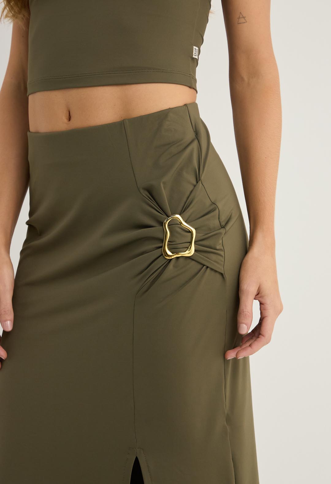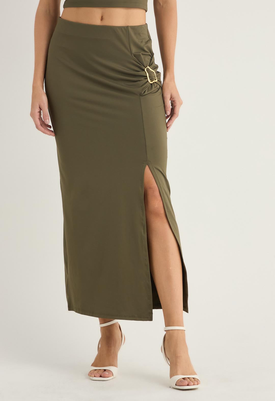 Falda larga, tiro alto, color verde militar, silueta ajustada y fondo entero para mujer.