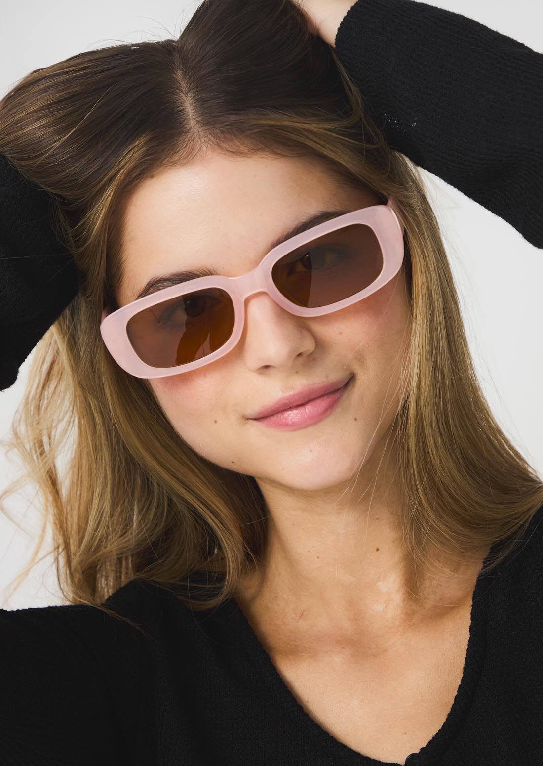 Gafas con marco grueso, color rosa y lente rectangular.