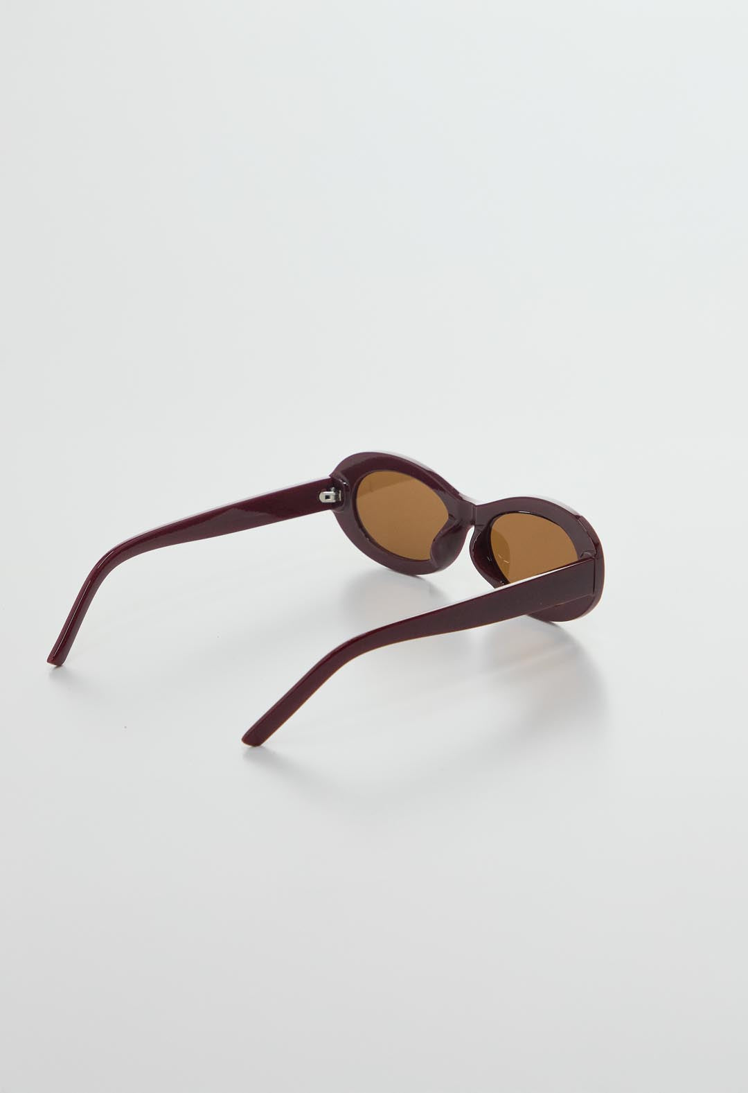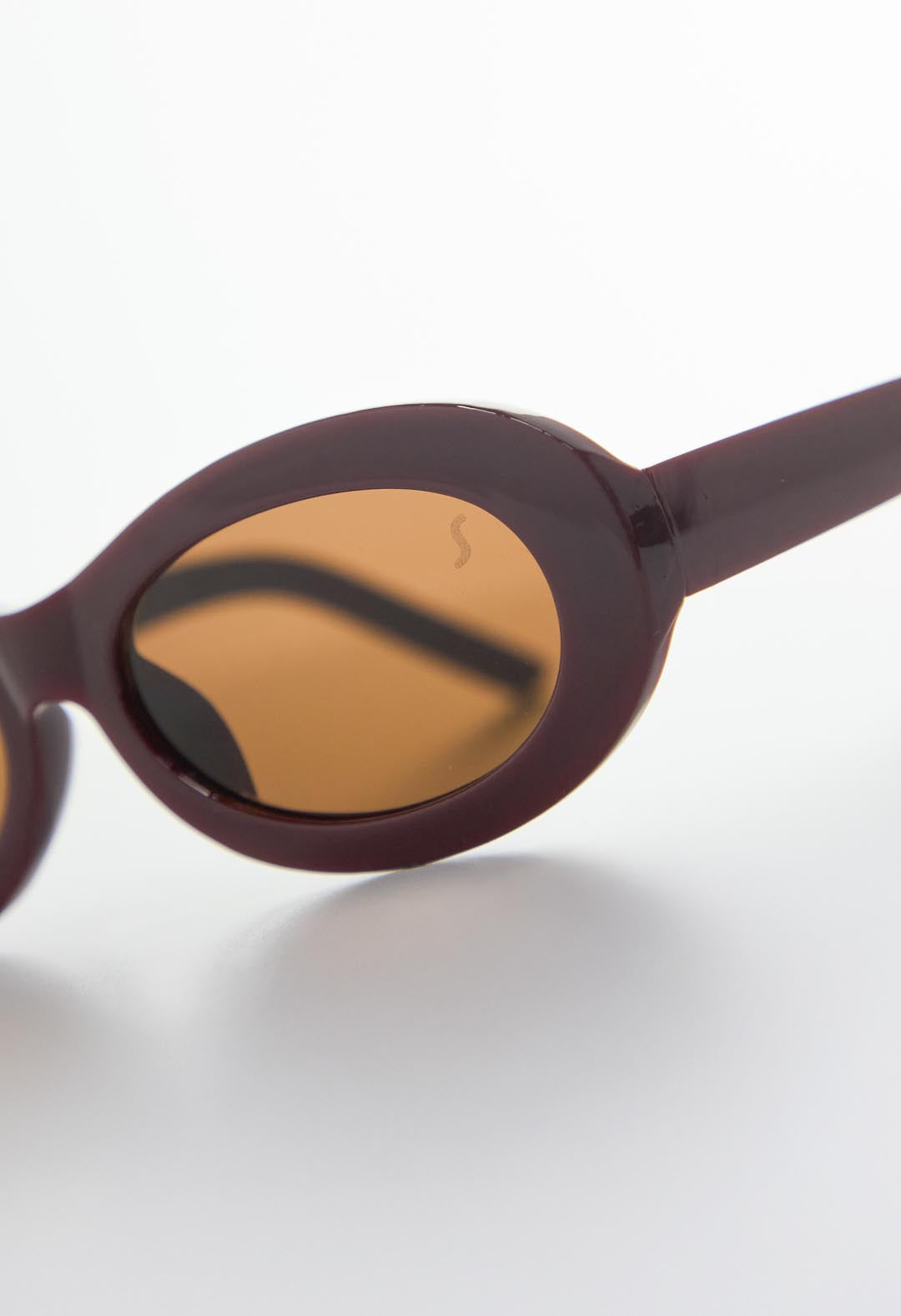 Gafas con marco grueso, color vino y lentes ovalados.