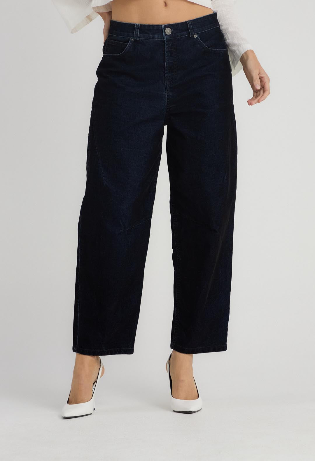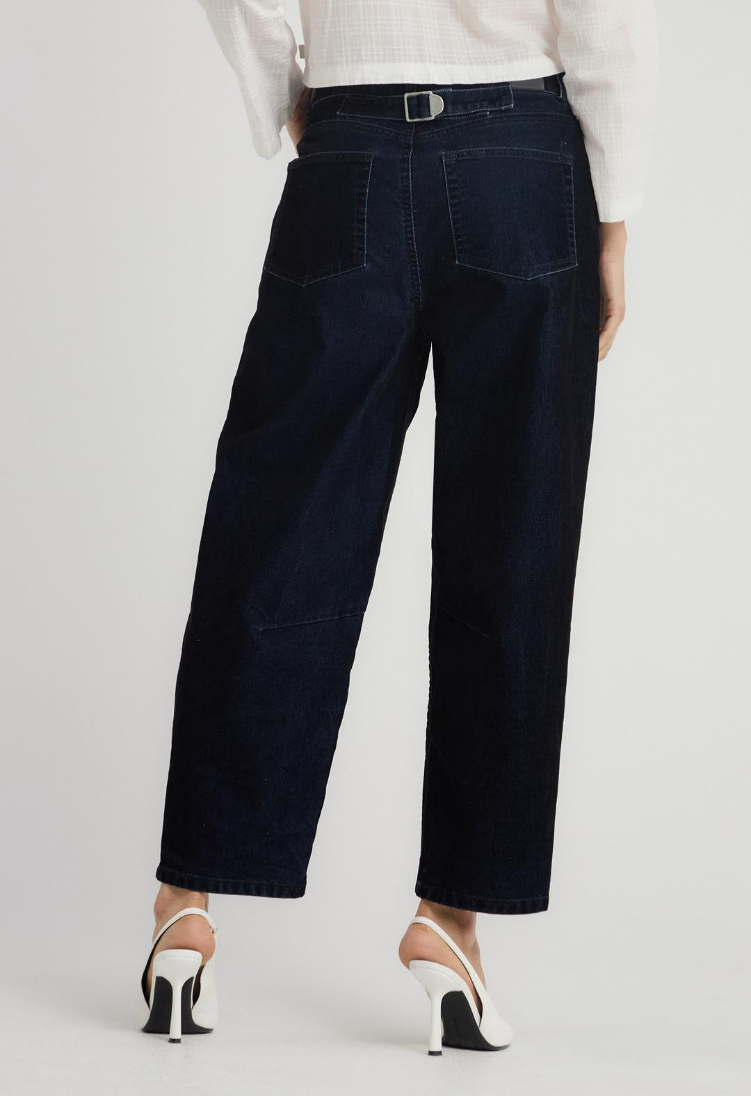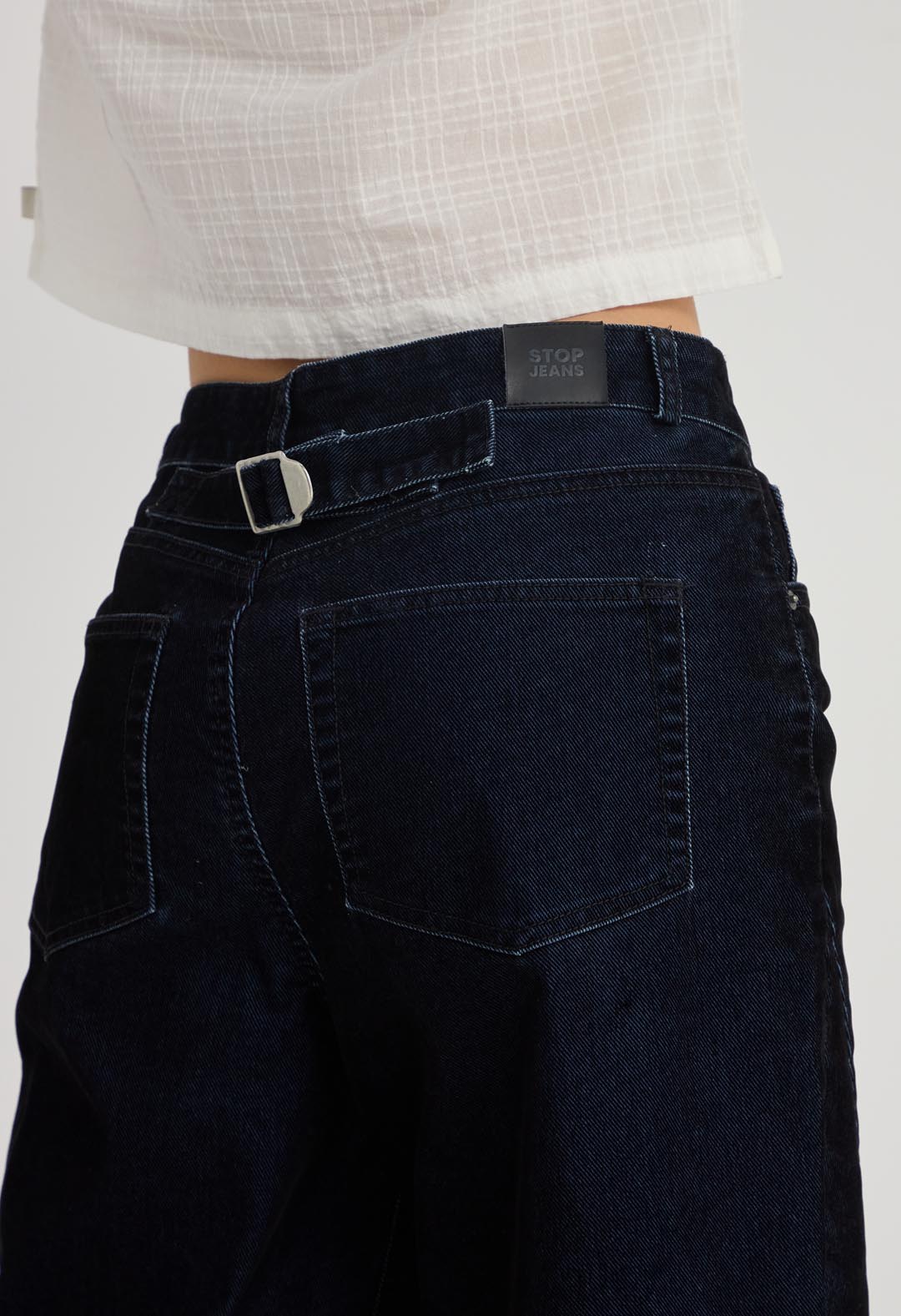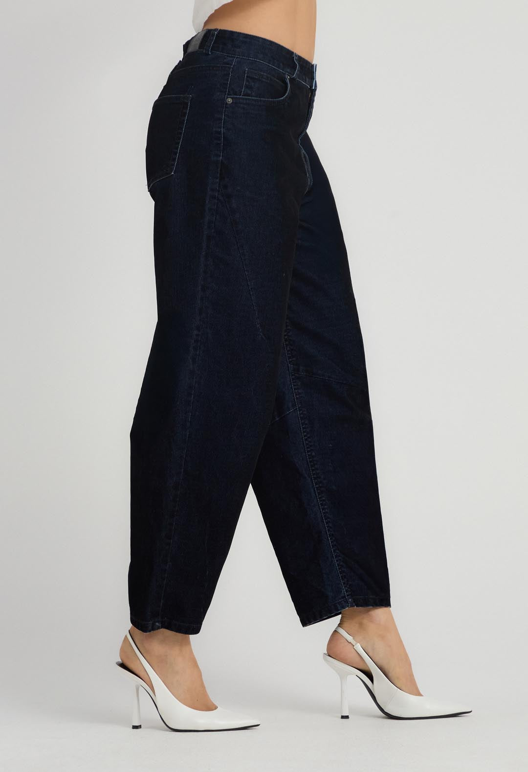 Jean baggy, tiro alto, lavado oscuro, con pinzas y fondo entero para mujer.