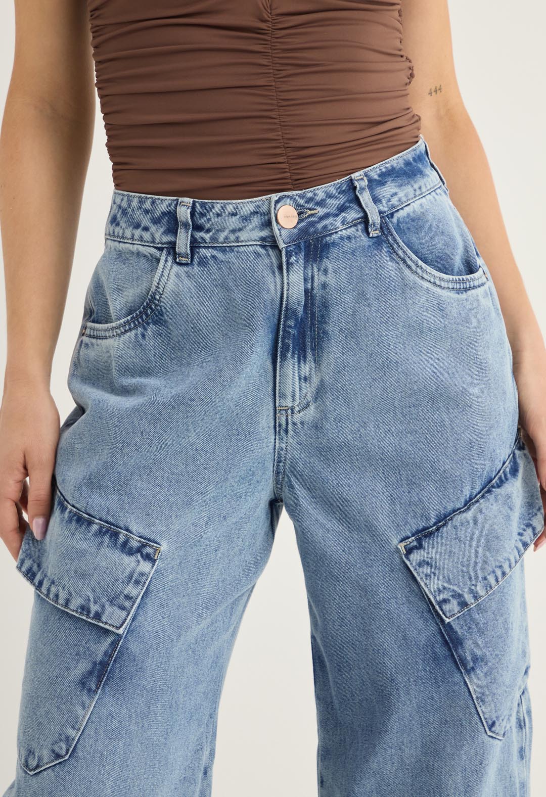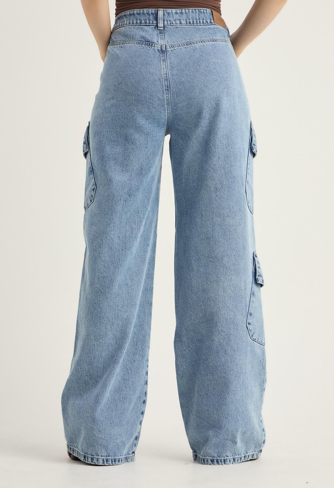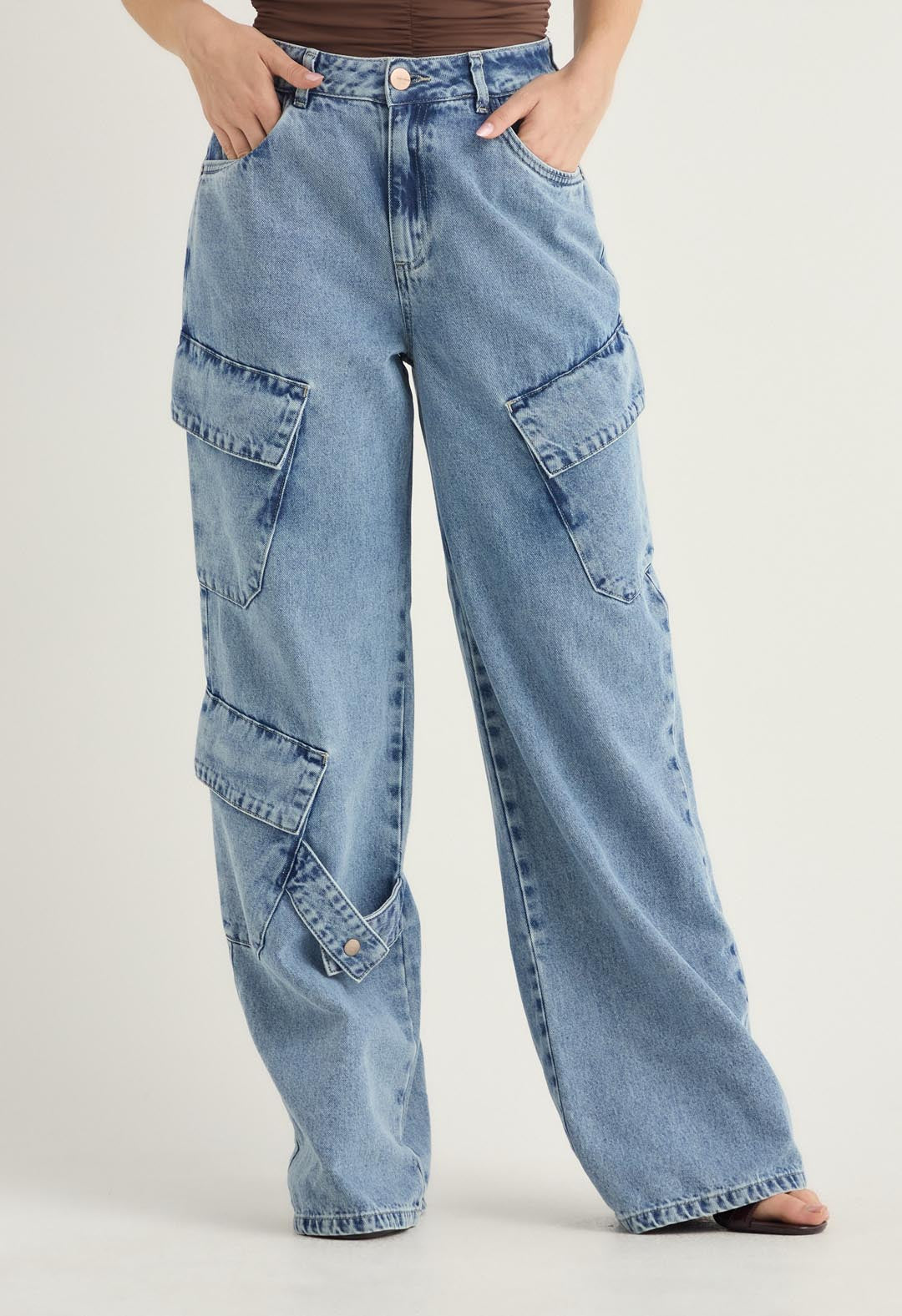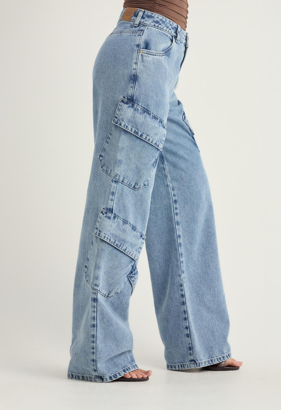 Jean cargo, tiro alto, lavado claro, con bolsillos en costados y fondo entero para mujer.