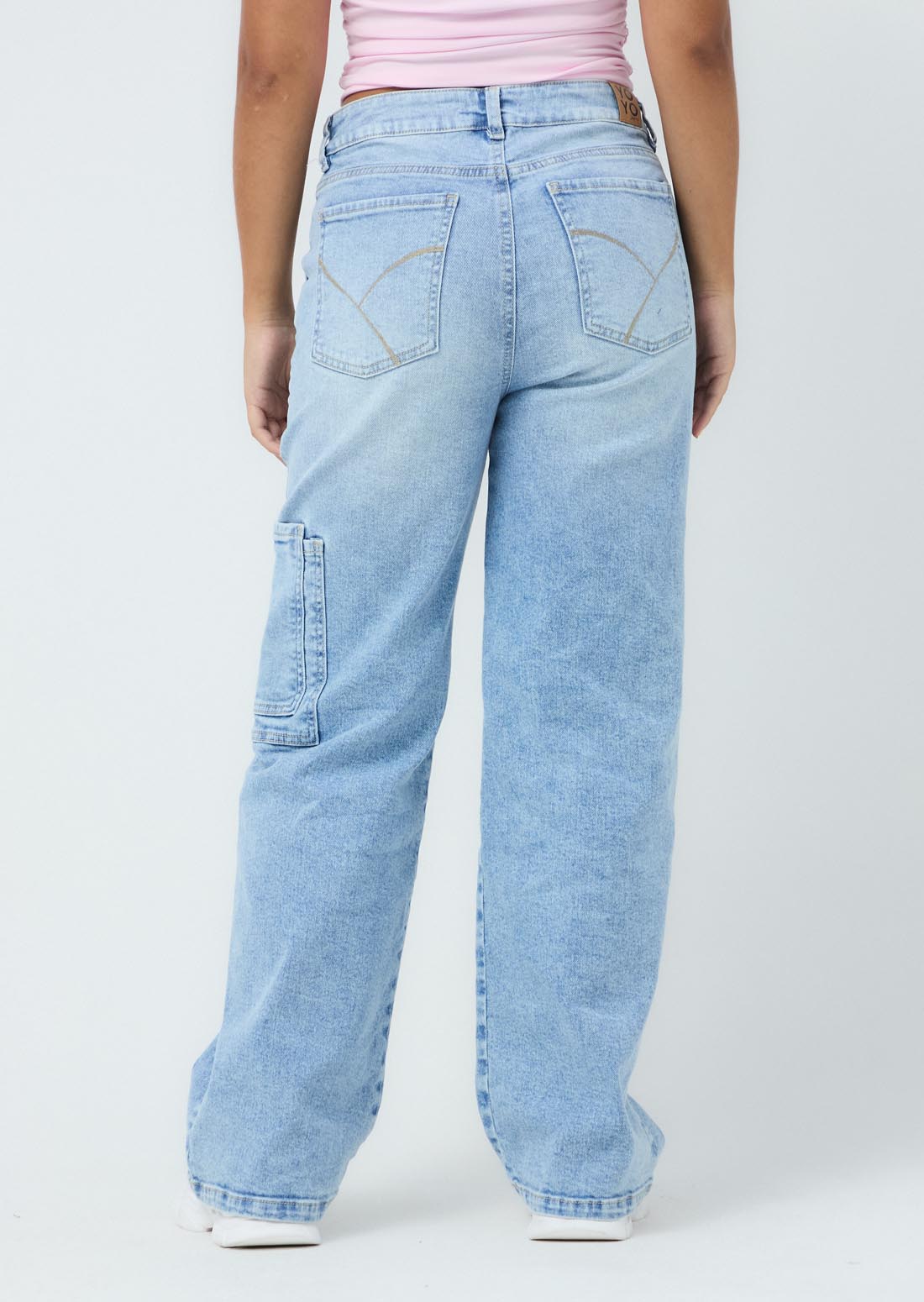 Jean cargo, tiro alto, lavado claro y fondo entero para jóvenes.