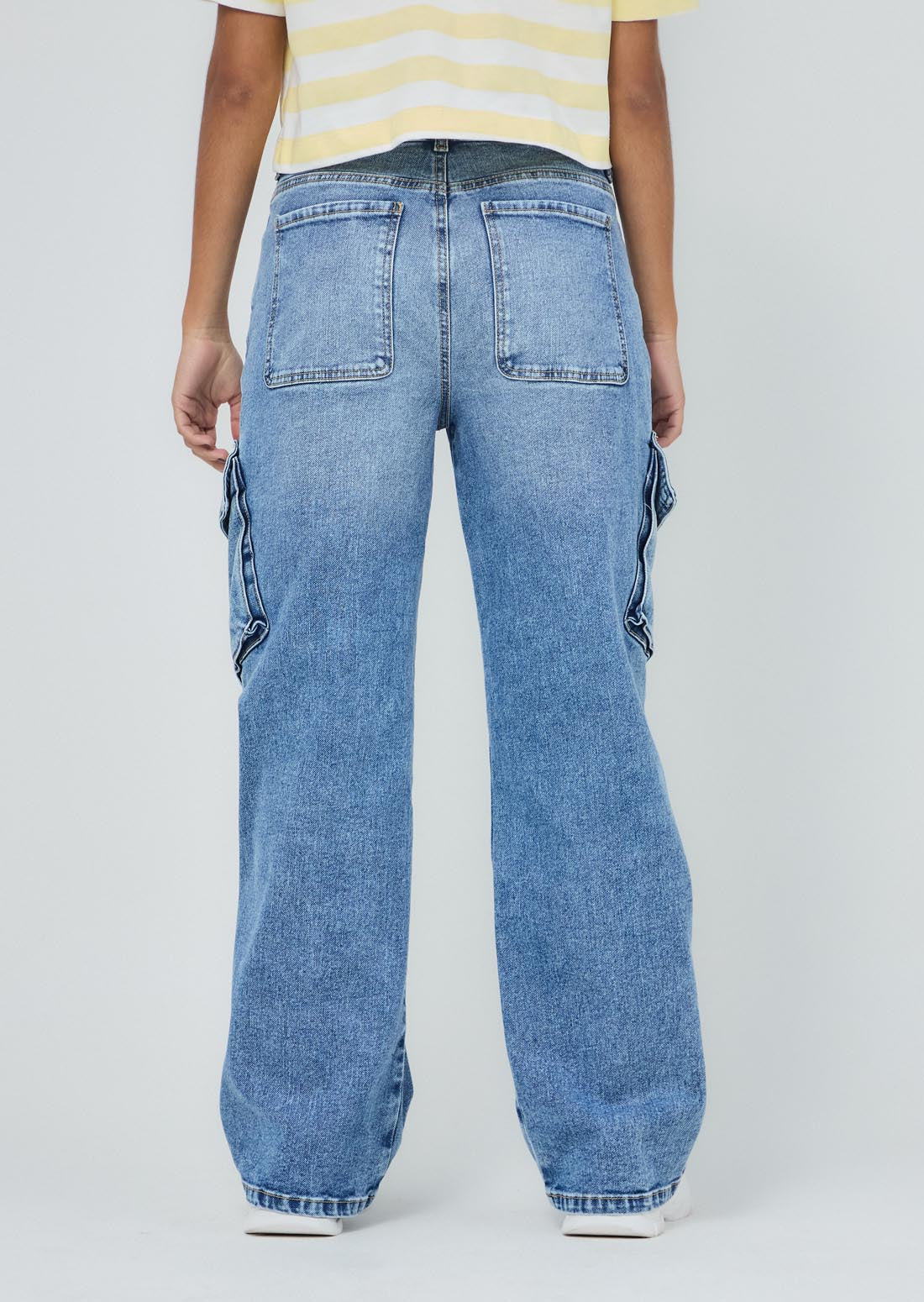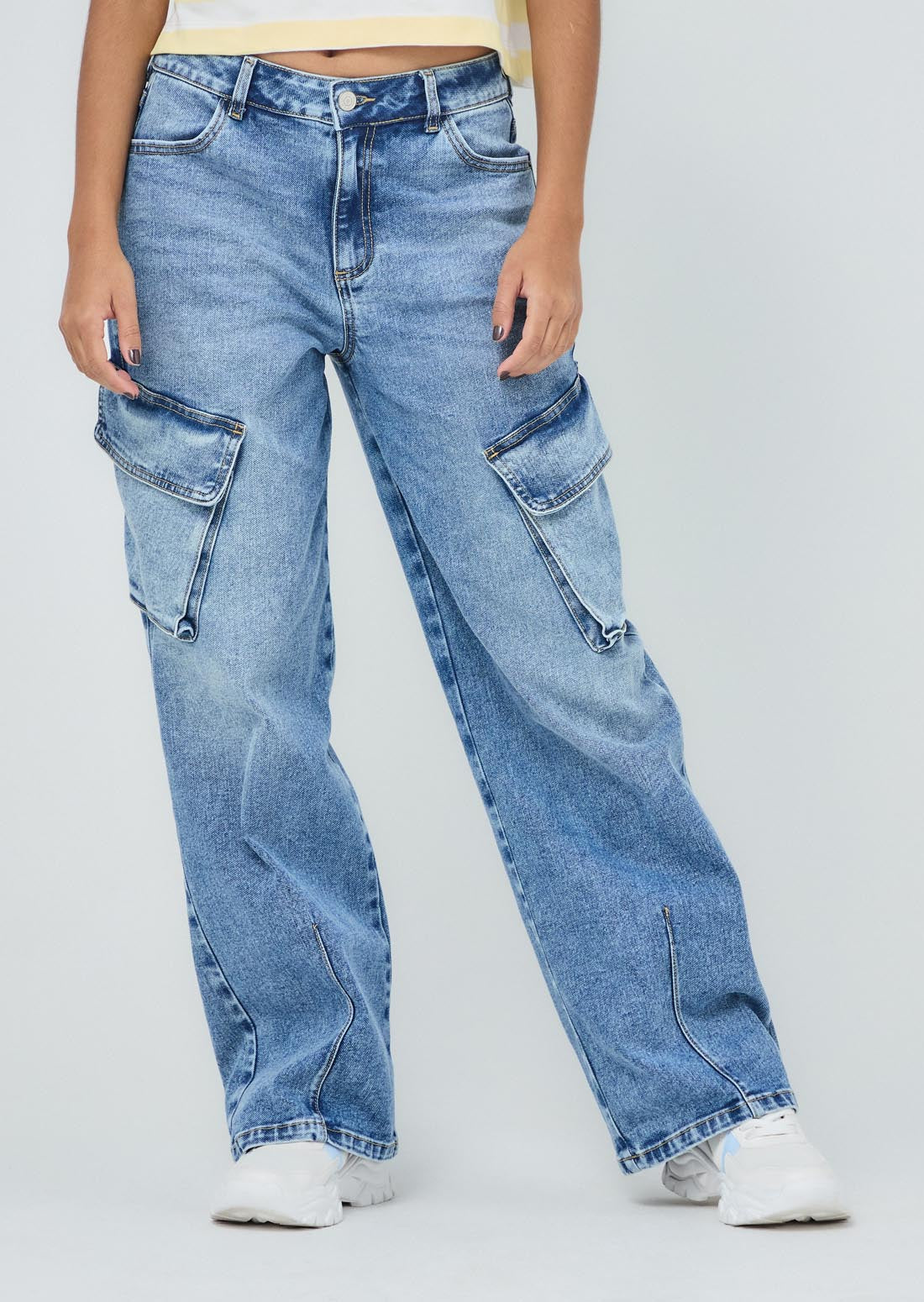 Jean cargo lavado medio y tiro alto para jóvenes.