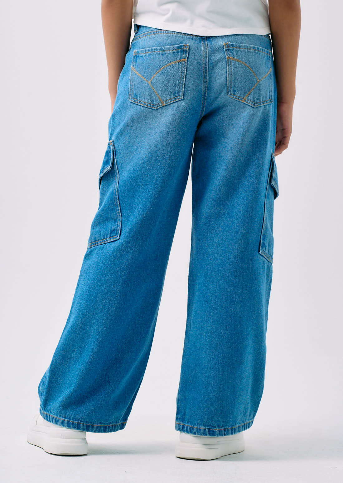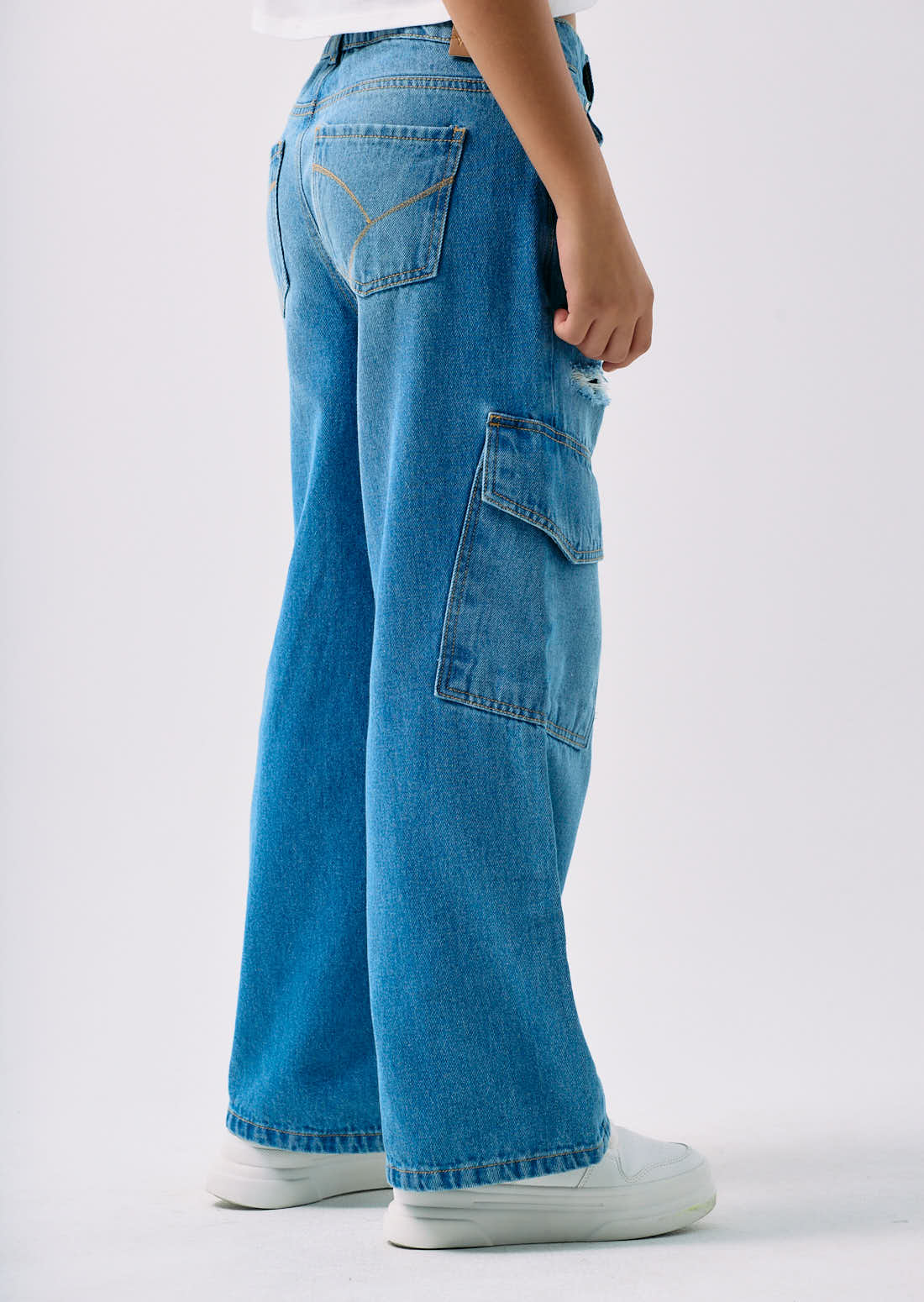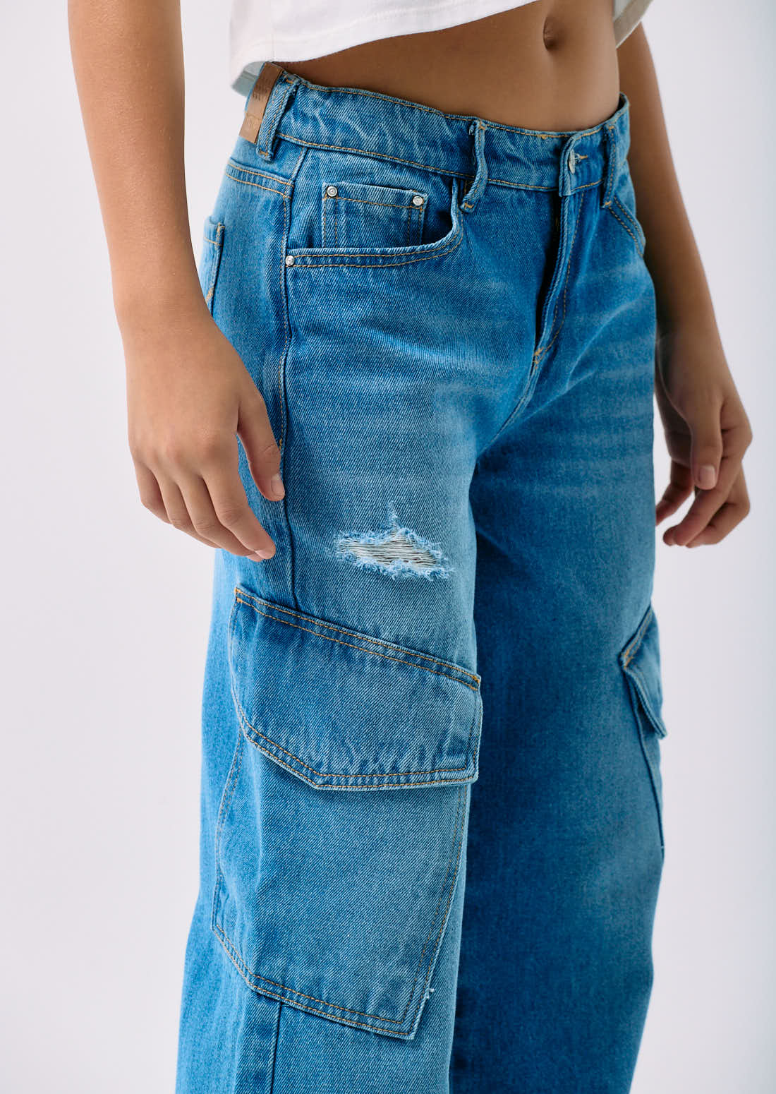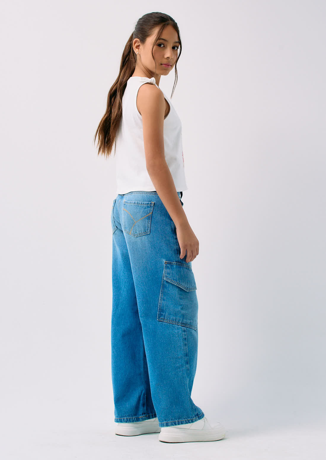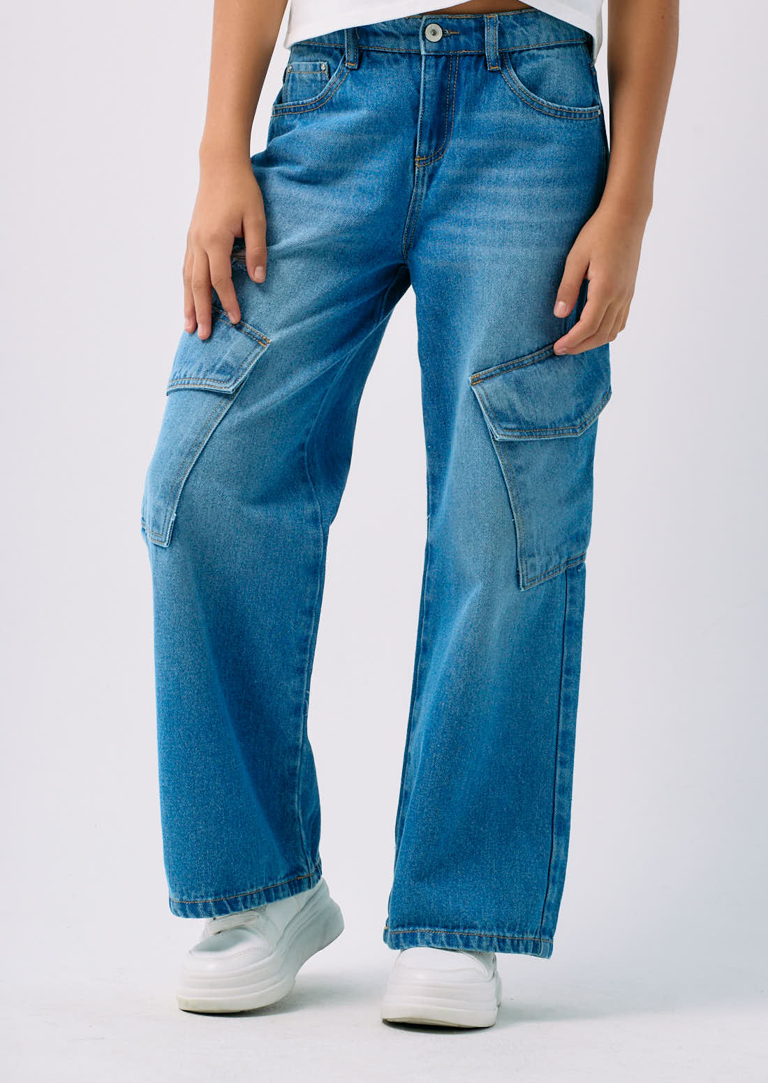 Jean cargo, tiro alto, lavado medio, elástico en cintura y bolsillos en costados con tapas para jóvenes.