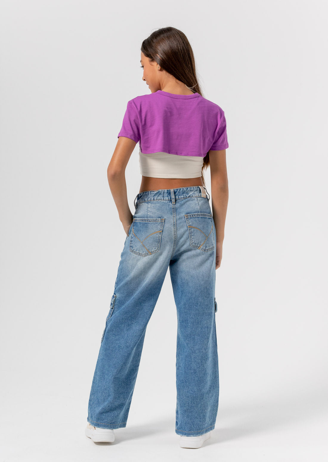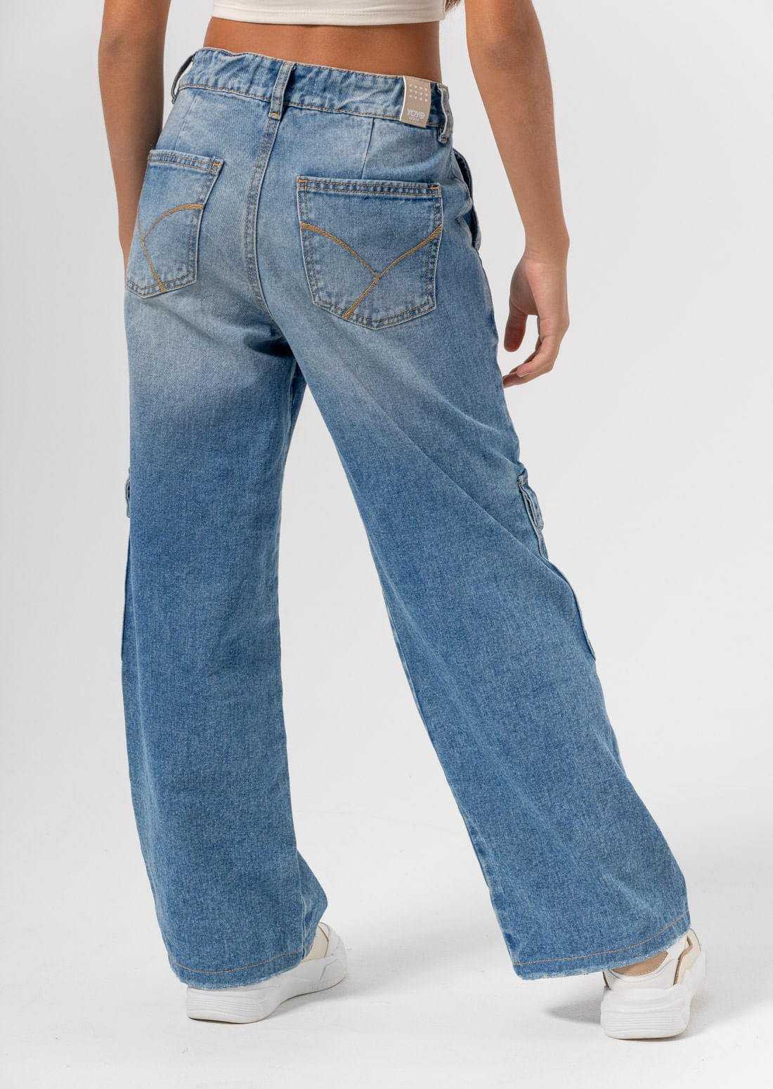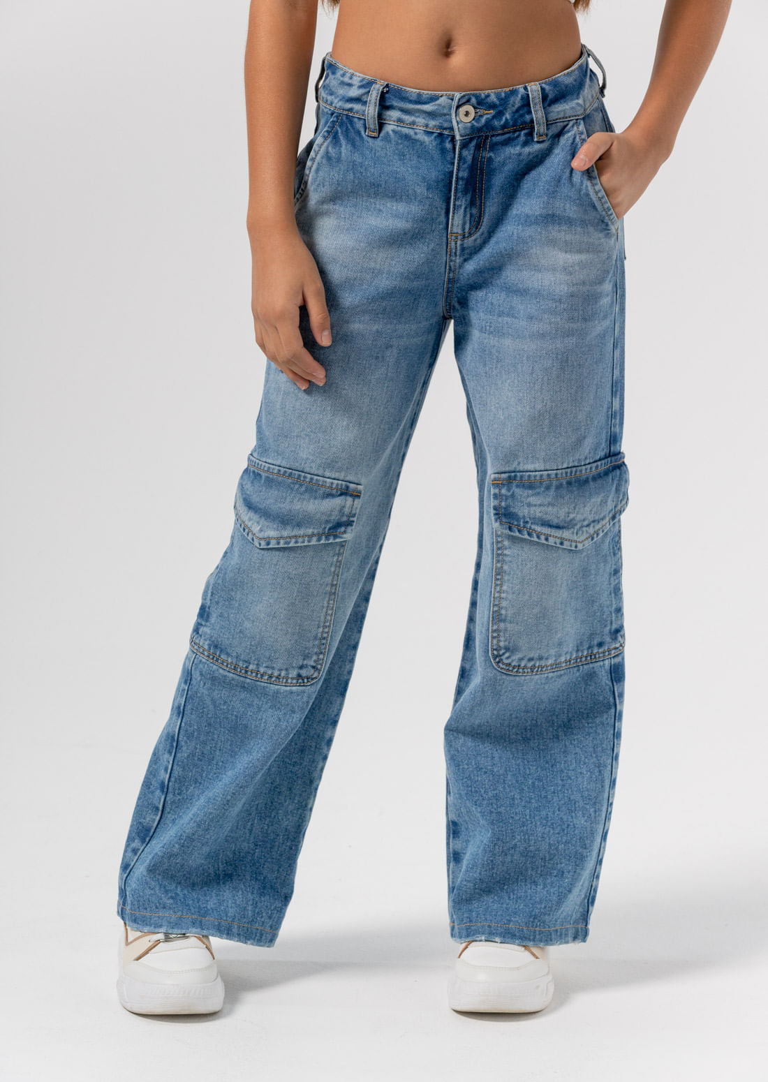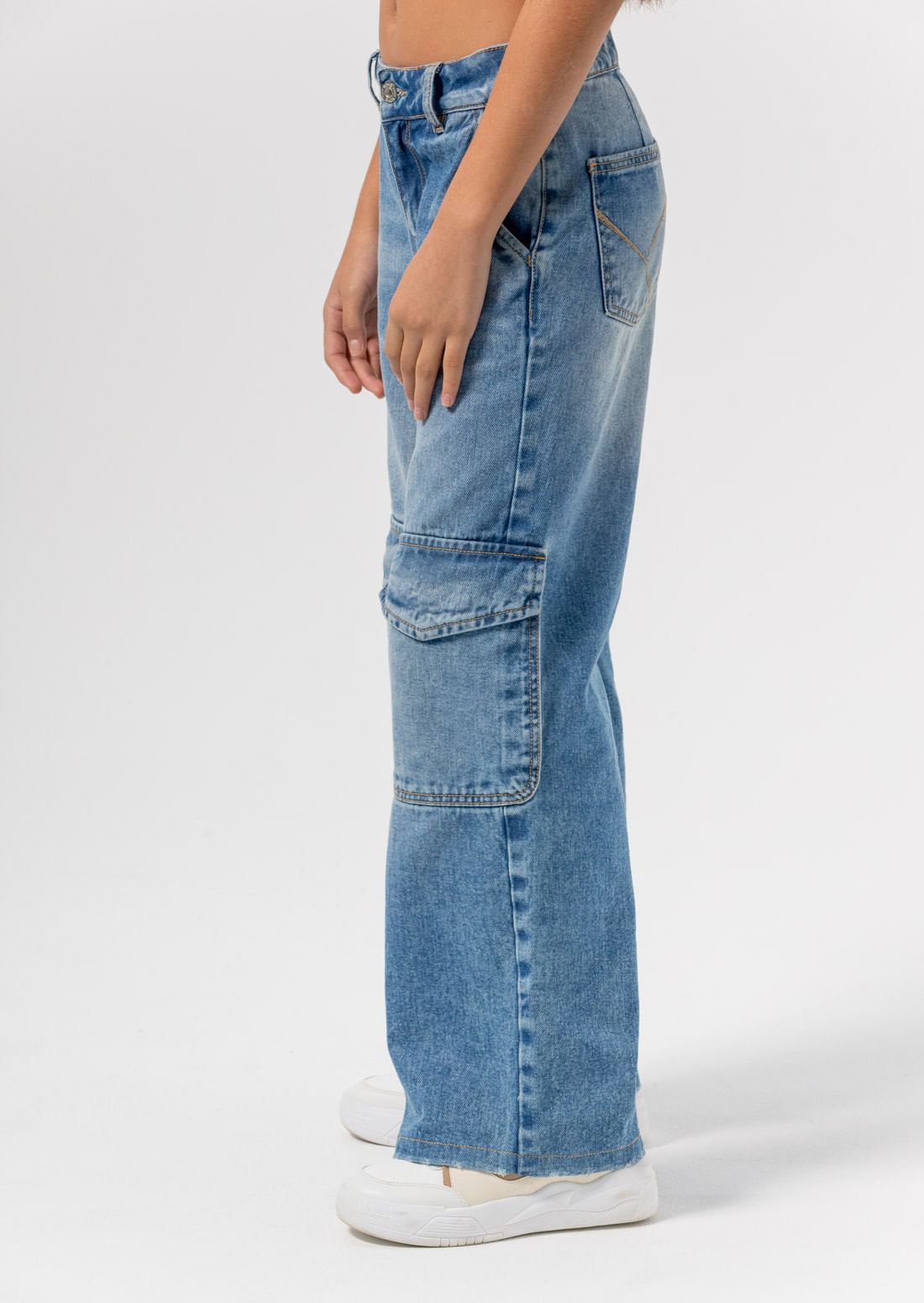 Jean cargo tiro alto, lavado medio y bolsillos en costados con tapas para niñas.