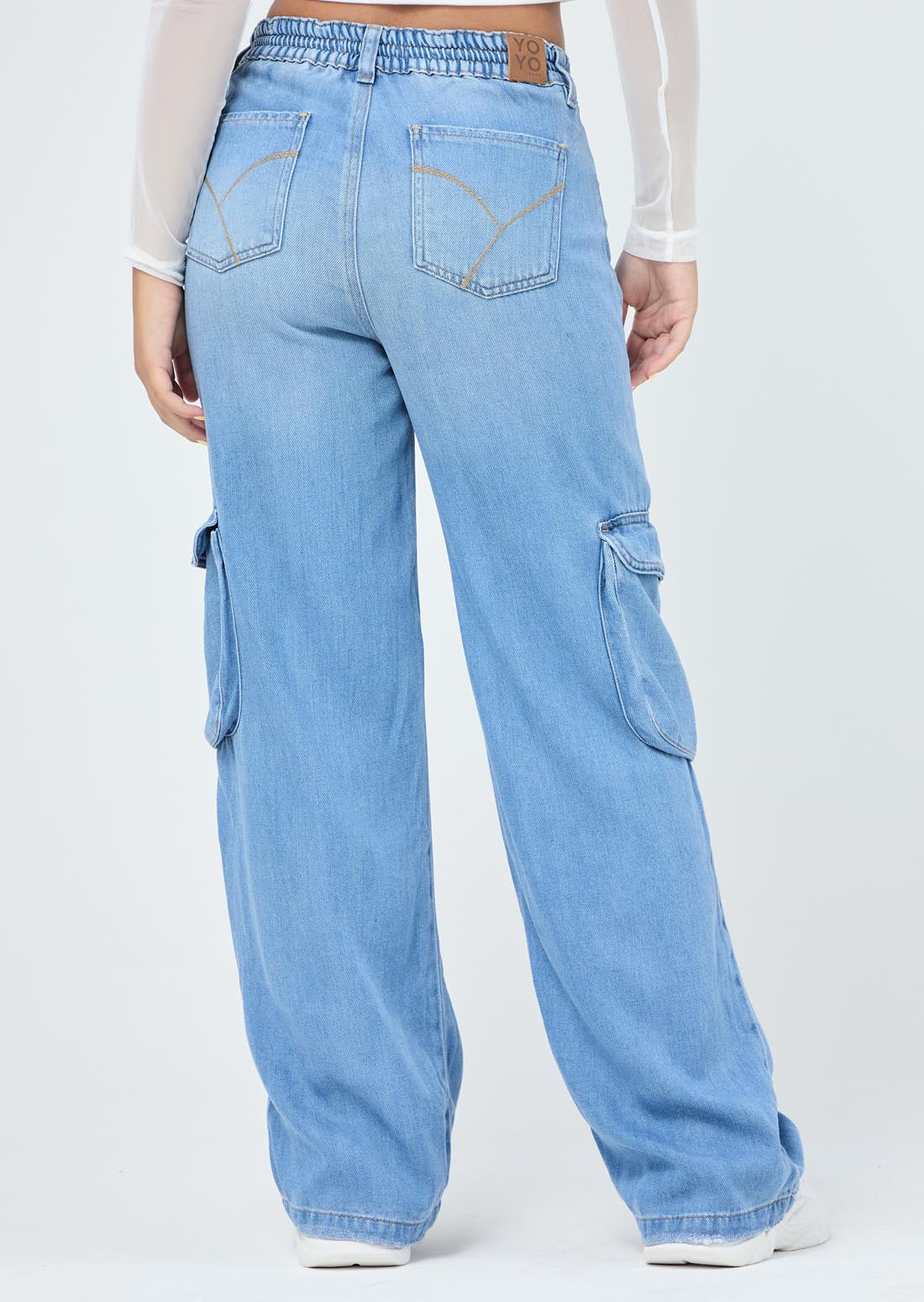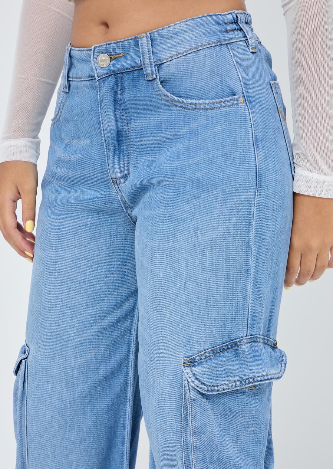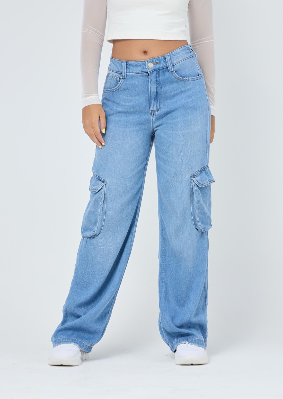 Jean cargo, tiro alto, lavado medio, bolsillos funcionales y fondo entero para adolescentes.