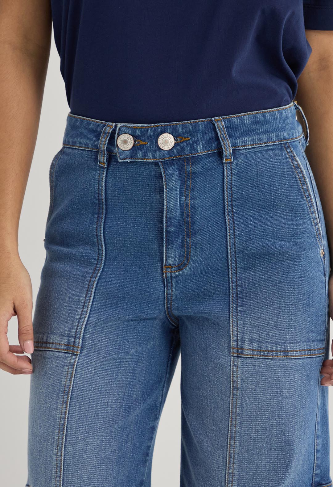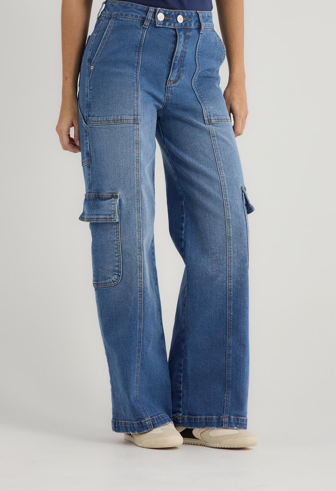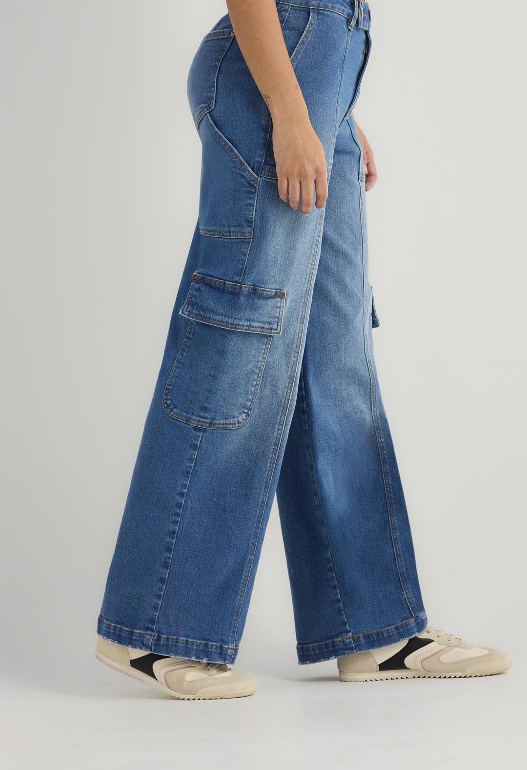 Jean cargo, tiro alto, lavado medio, con cortes, fondo entero y bolsillos funcionales para mujer.