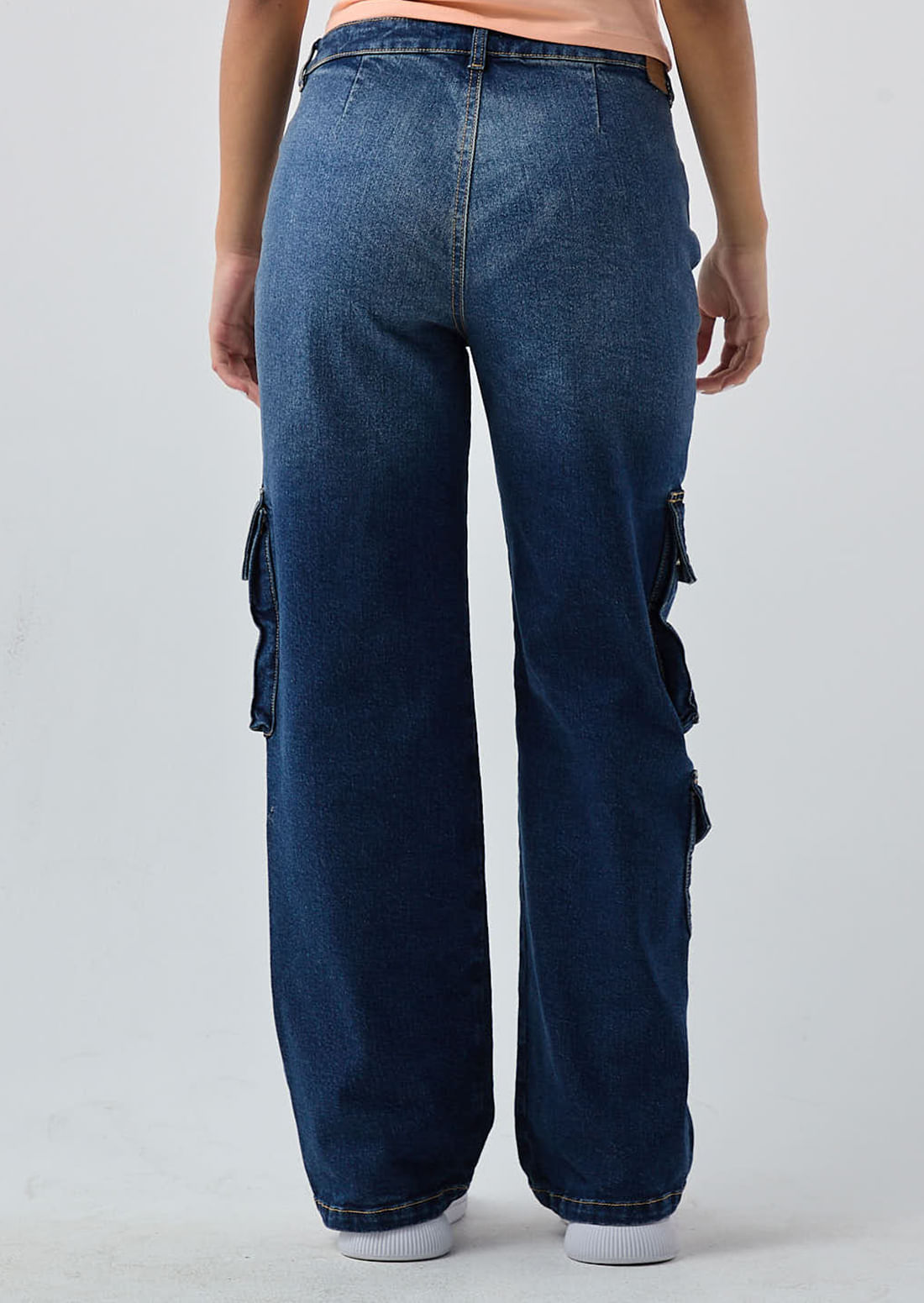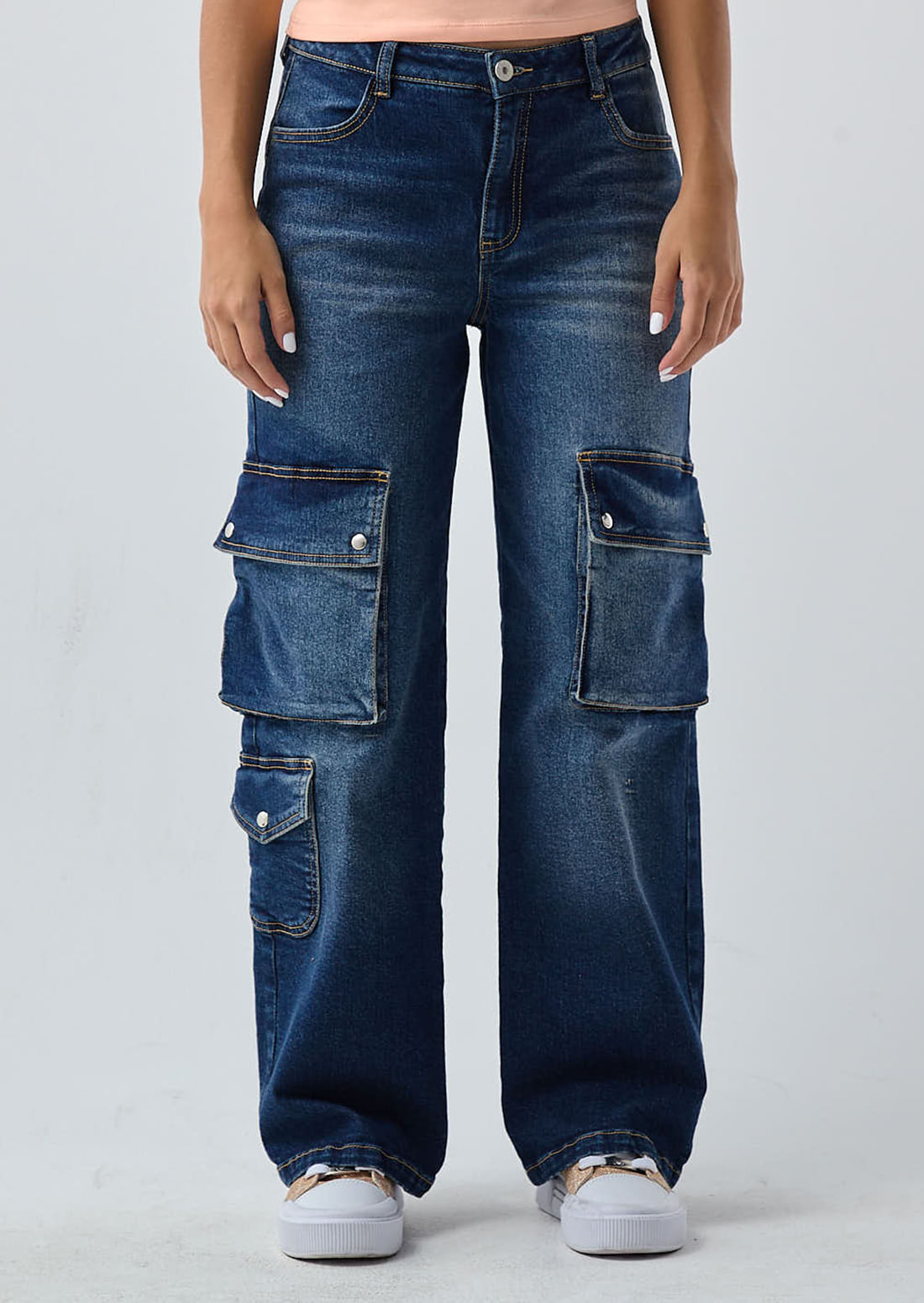 Jean cargo tiro alto, lavado medio oscuro, elástico en cintura y bolsillos tipo cargo con tapas y broches para jóvenes.