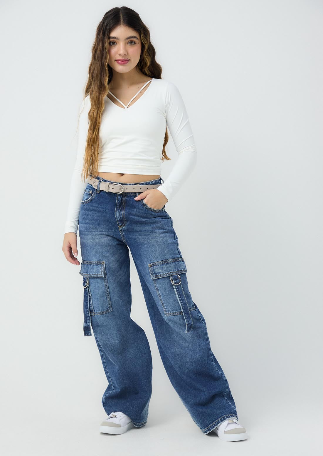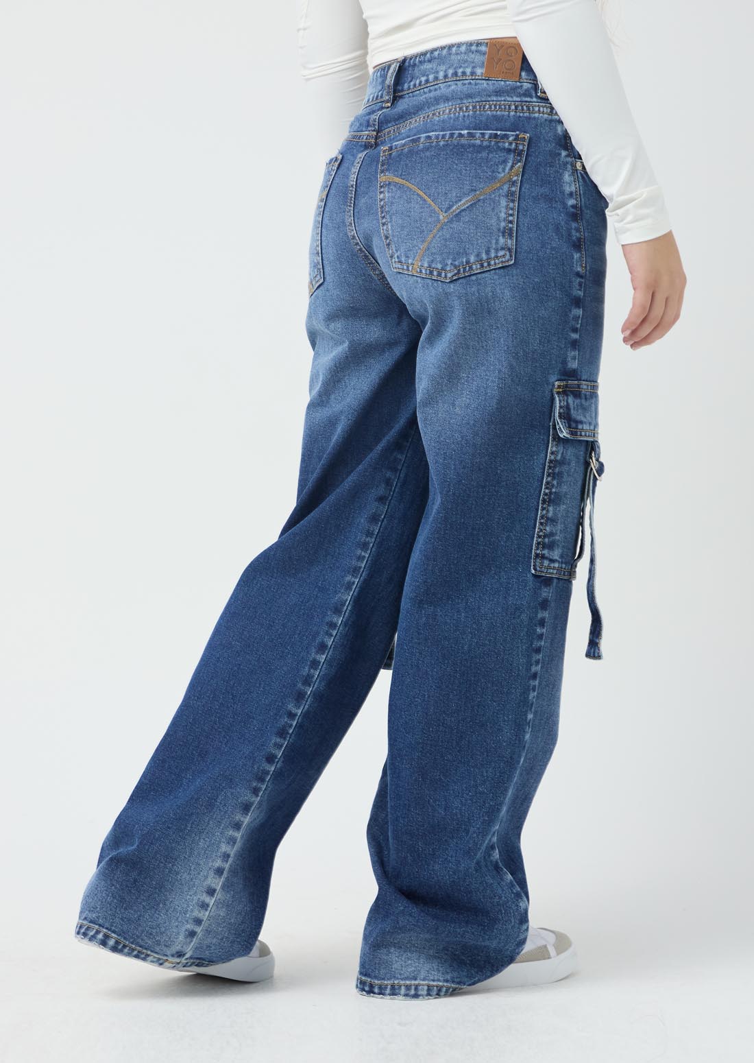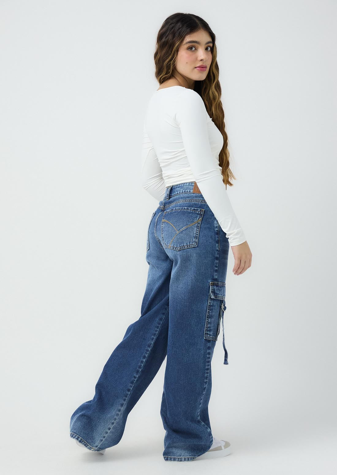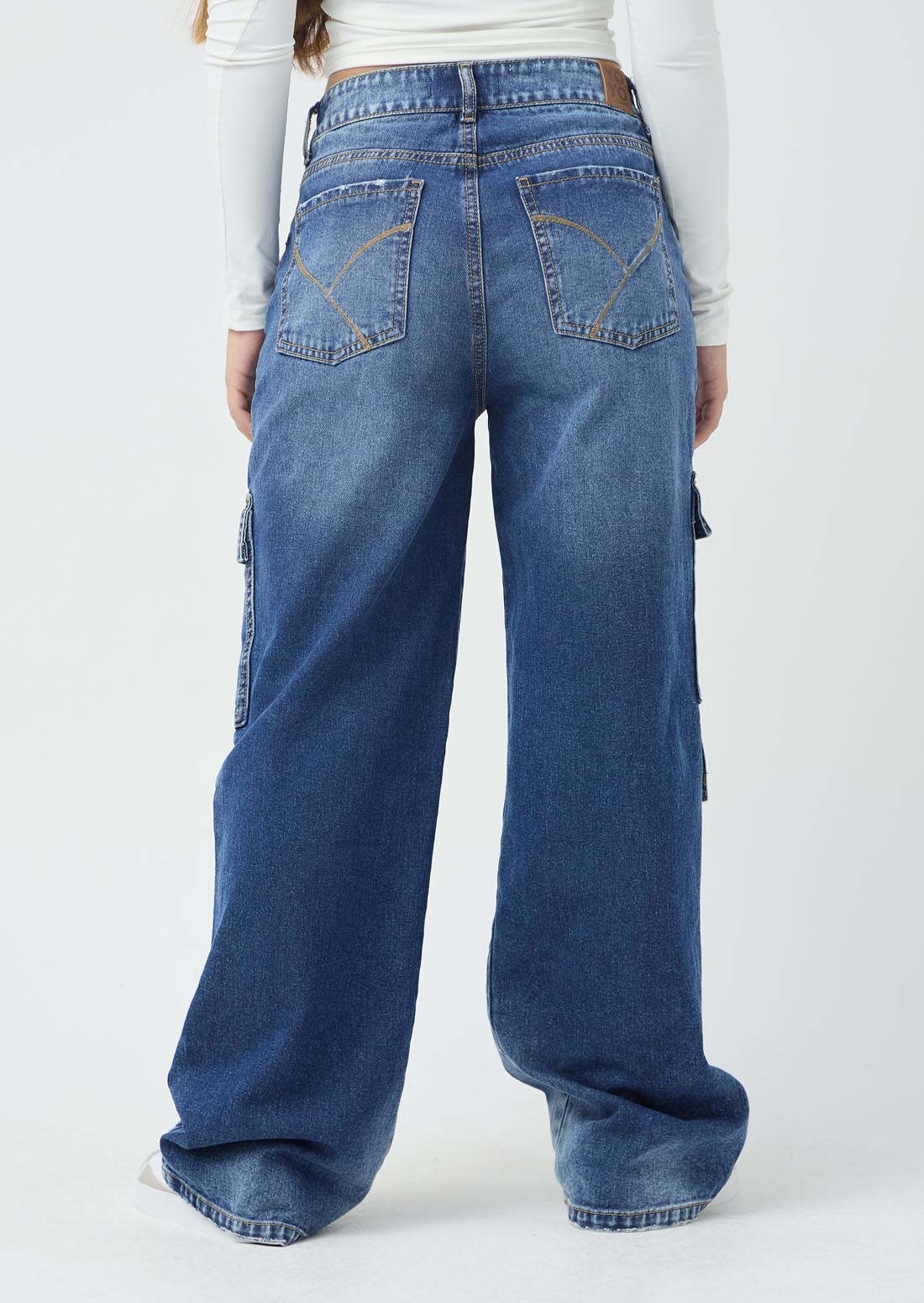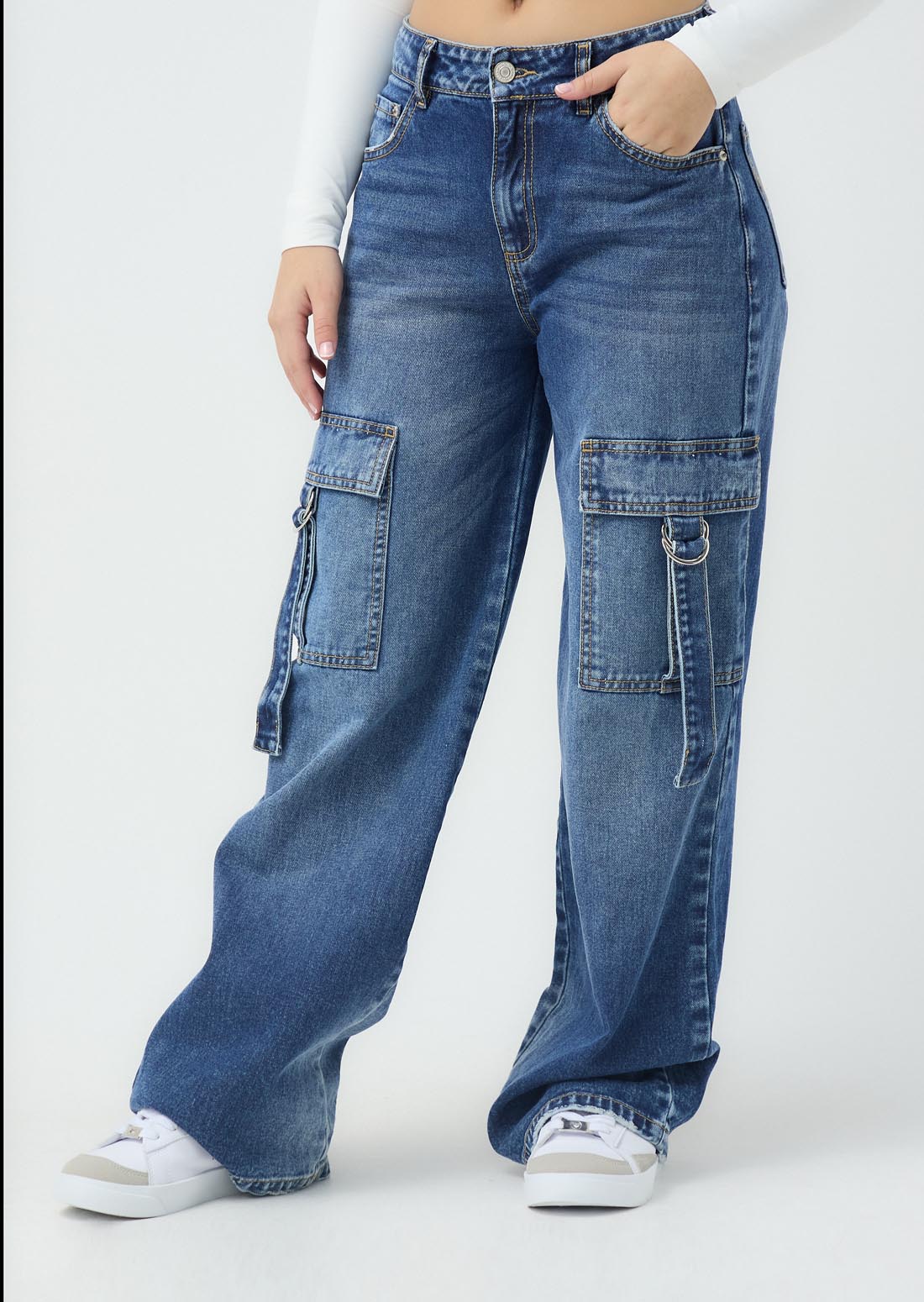 Jean cargo, tiro alto, lavado medio oscuro, fondo entero y con bolsillos para jóvenes.