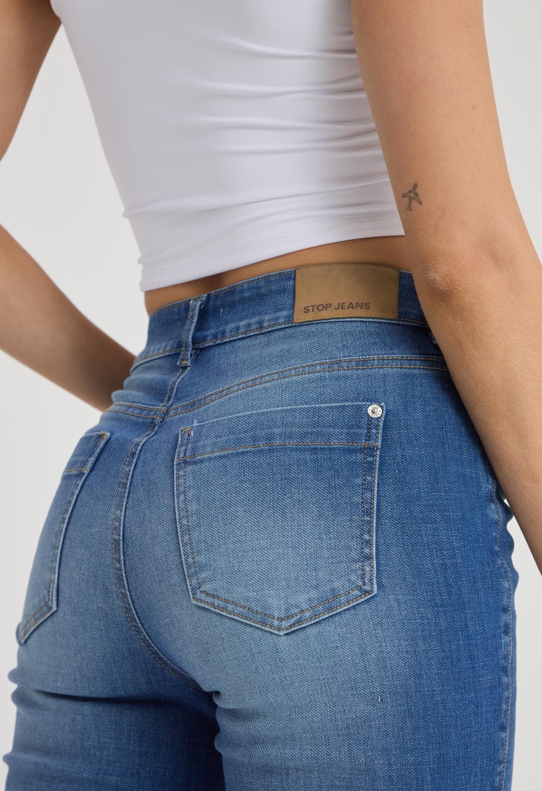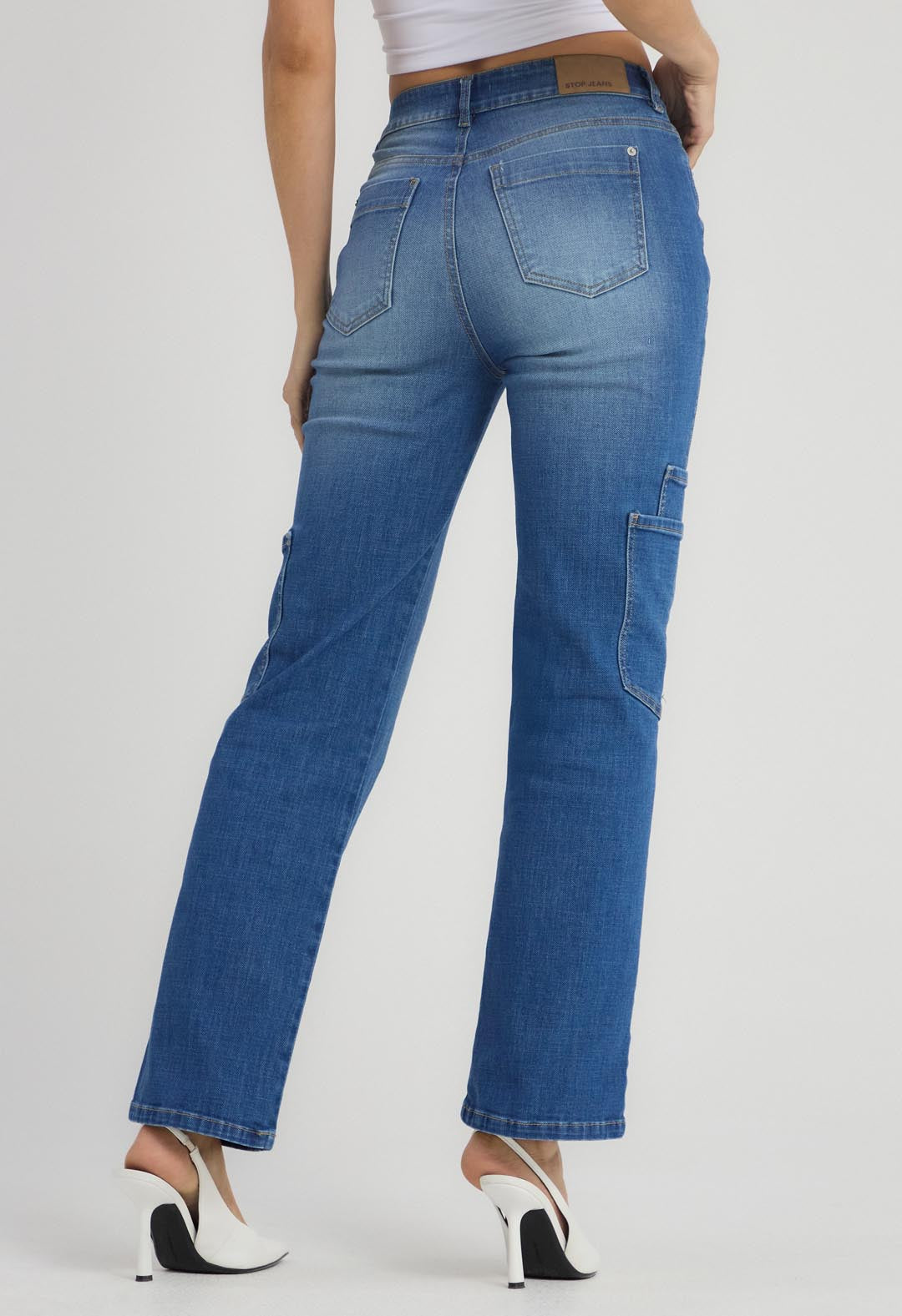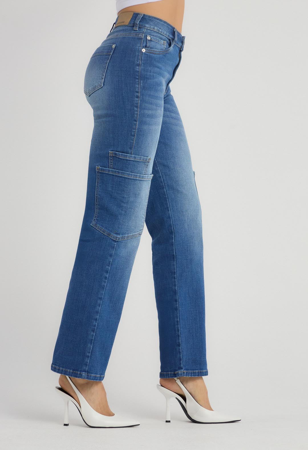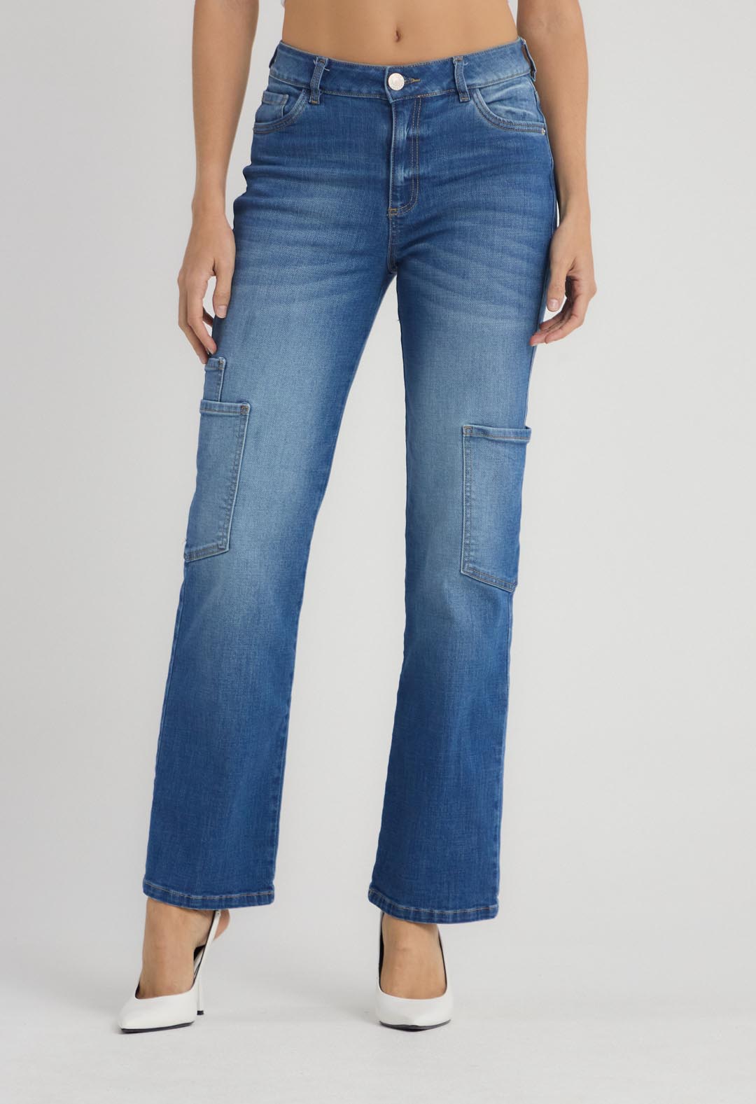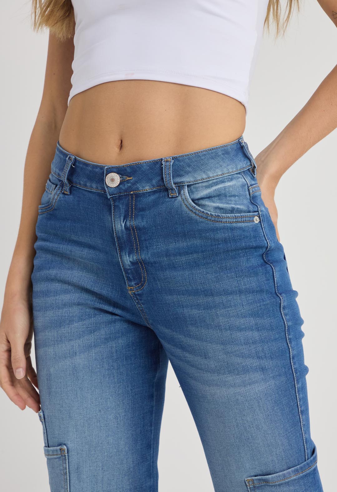 Jean cargo, tiro alto, lavado medio oscuro y fondo entero para mujeres.
