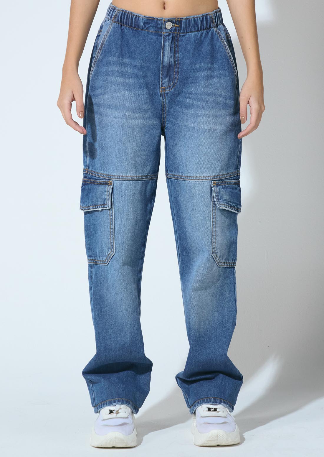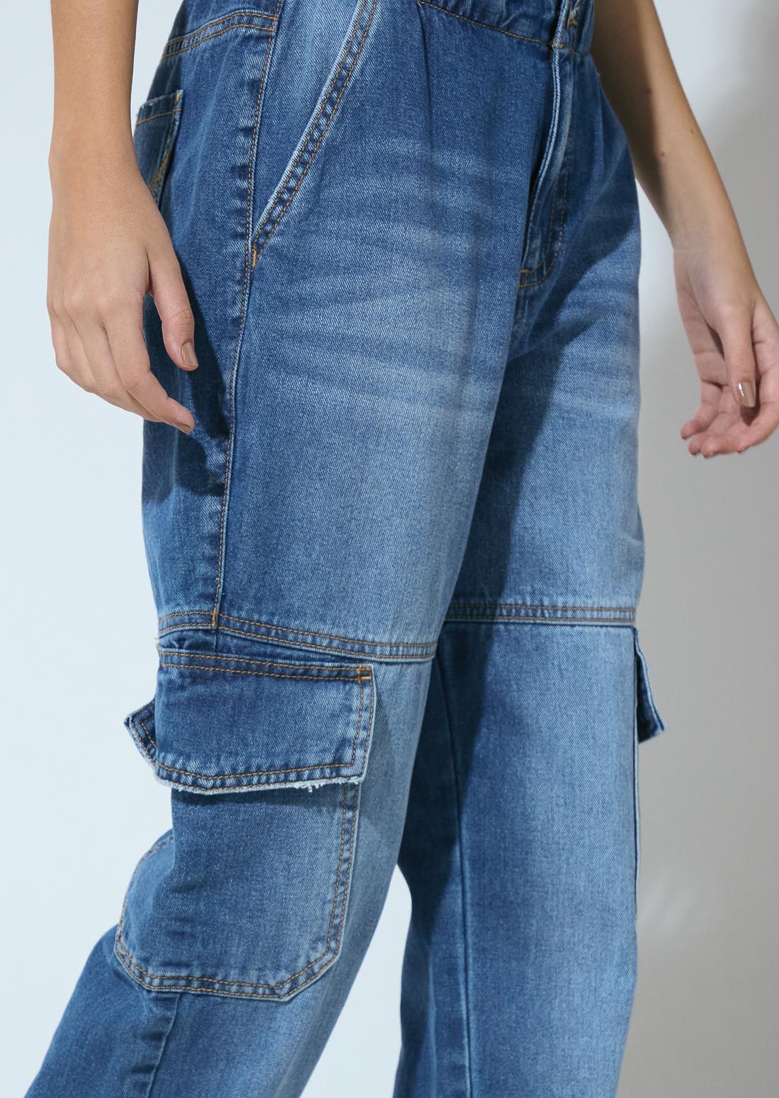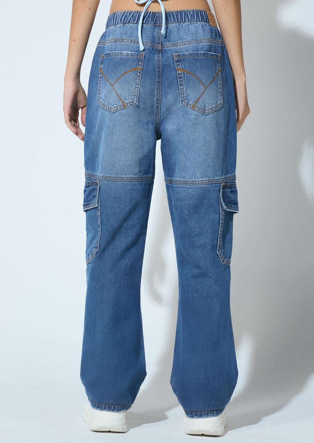 Jean cargo, tiro alto, lavado medio oscuro, en denim y fondo entero para adolescentes