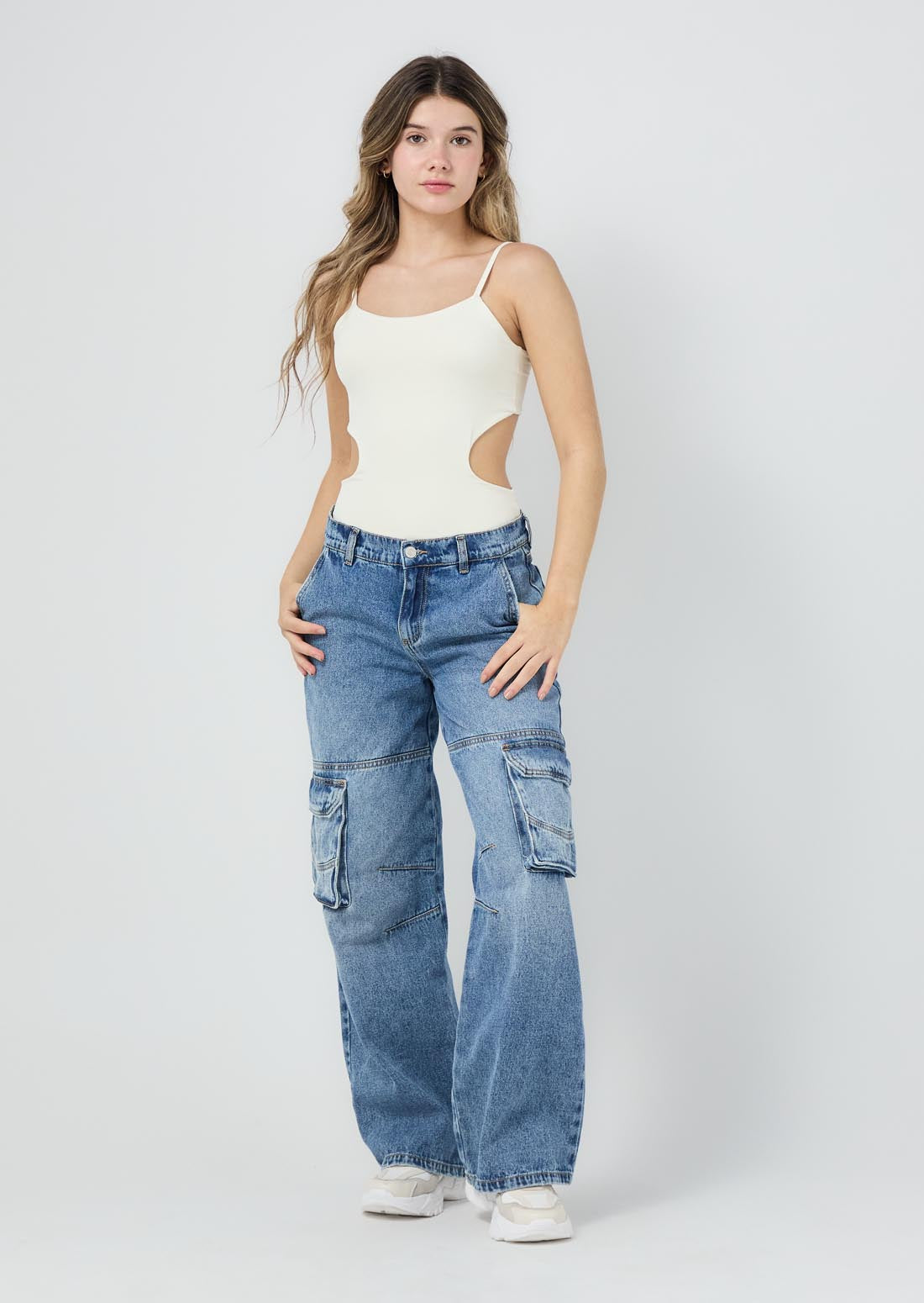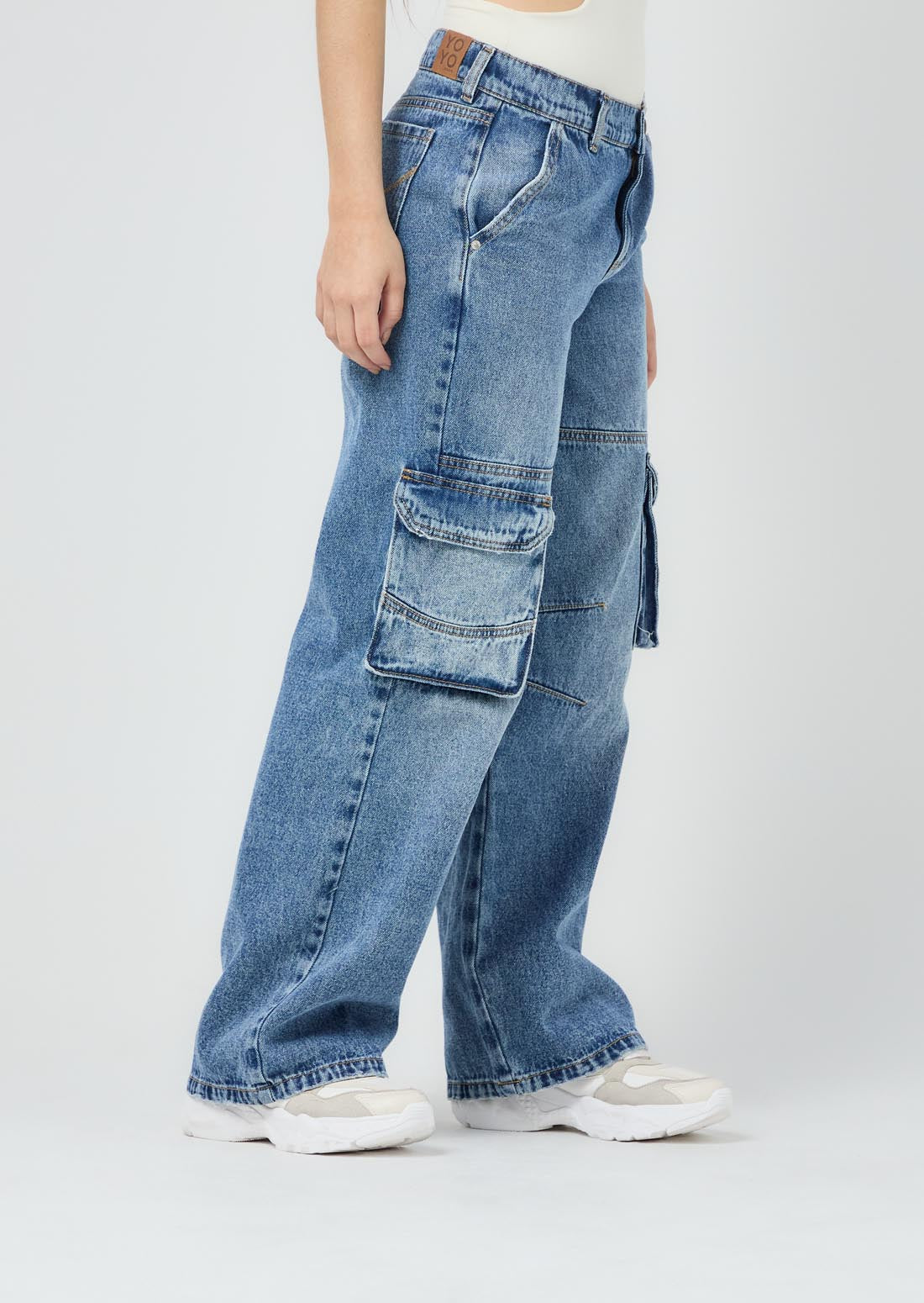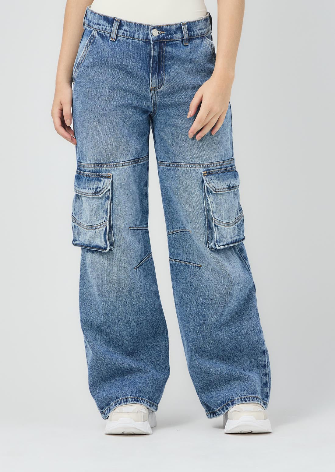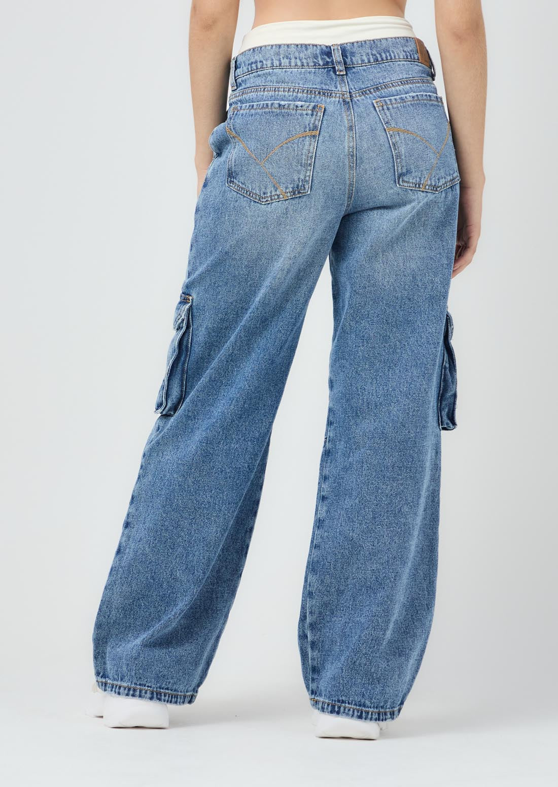 Jean cargo, tiro medio, lavado medio oscuro, fondo entero y bota recta para jóvenes.