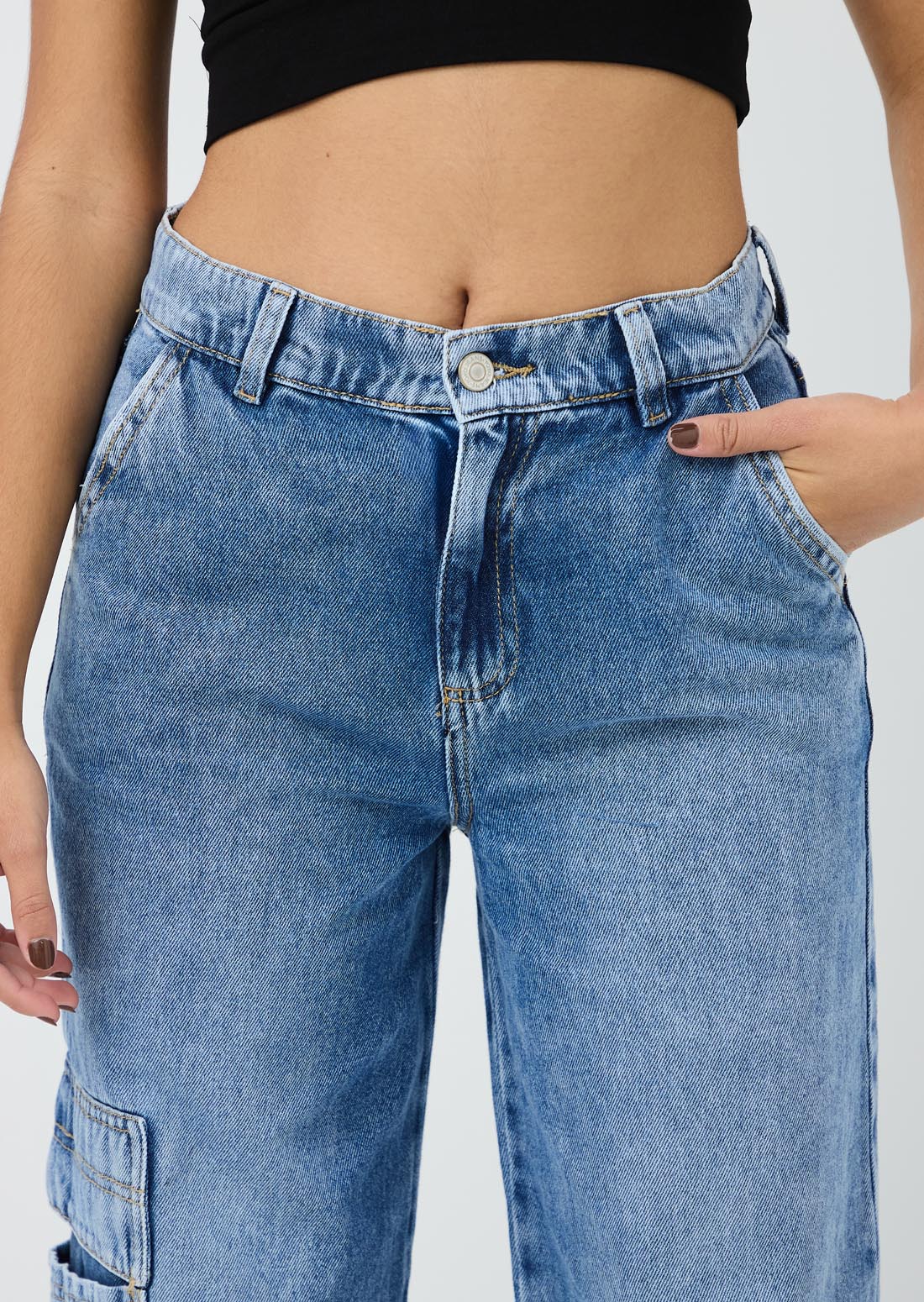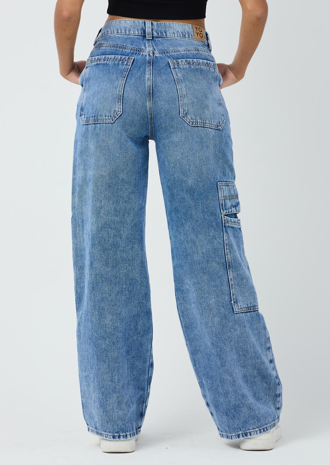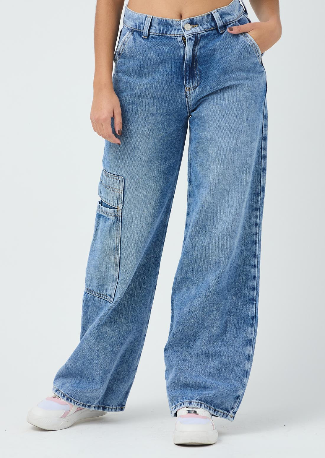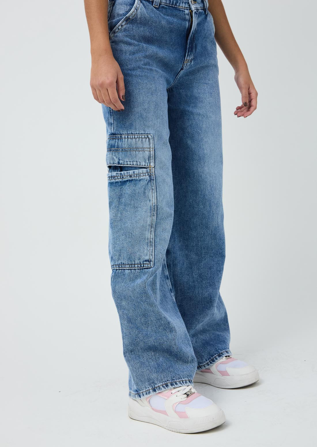 Jean cargo, tiro alto, lavado medio, bolsillos funcionales y fondo entero para jóvenes.
