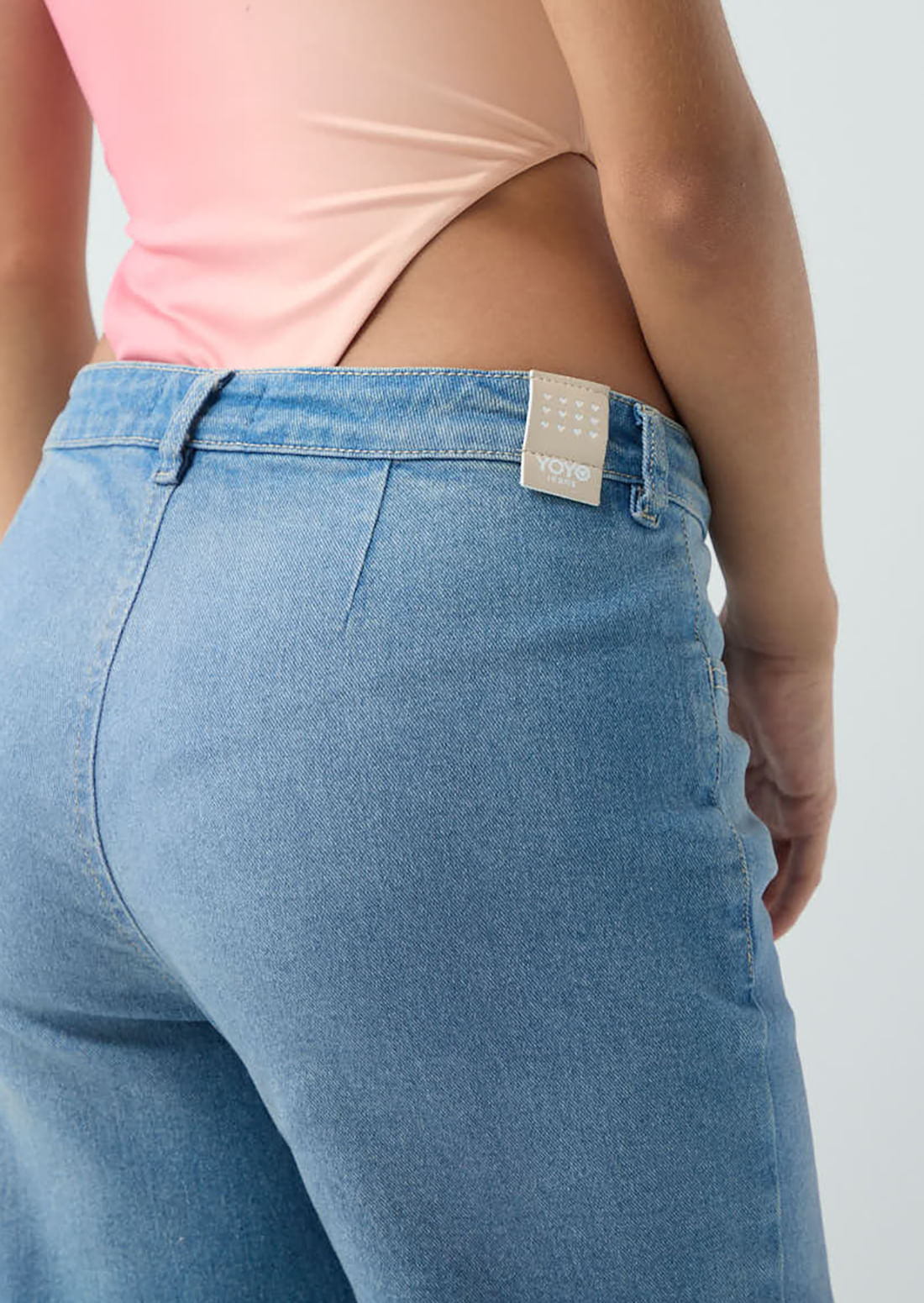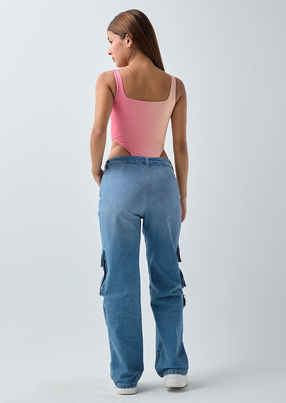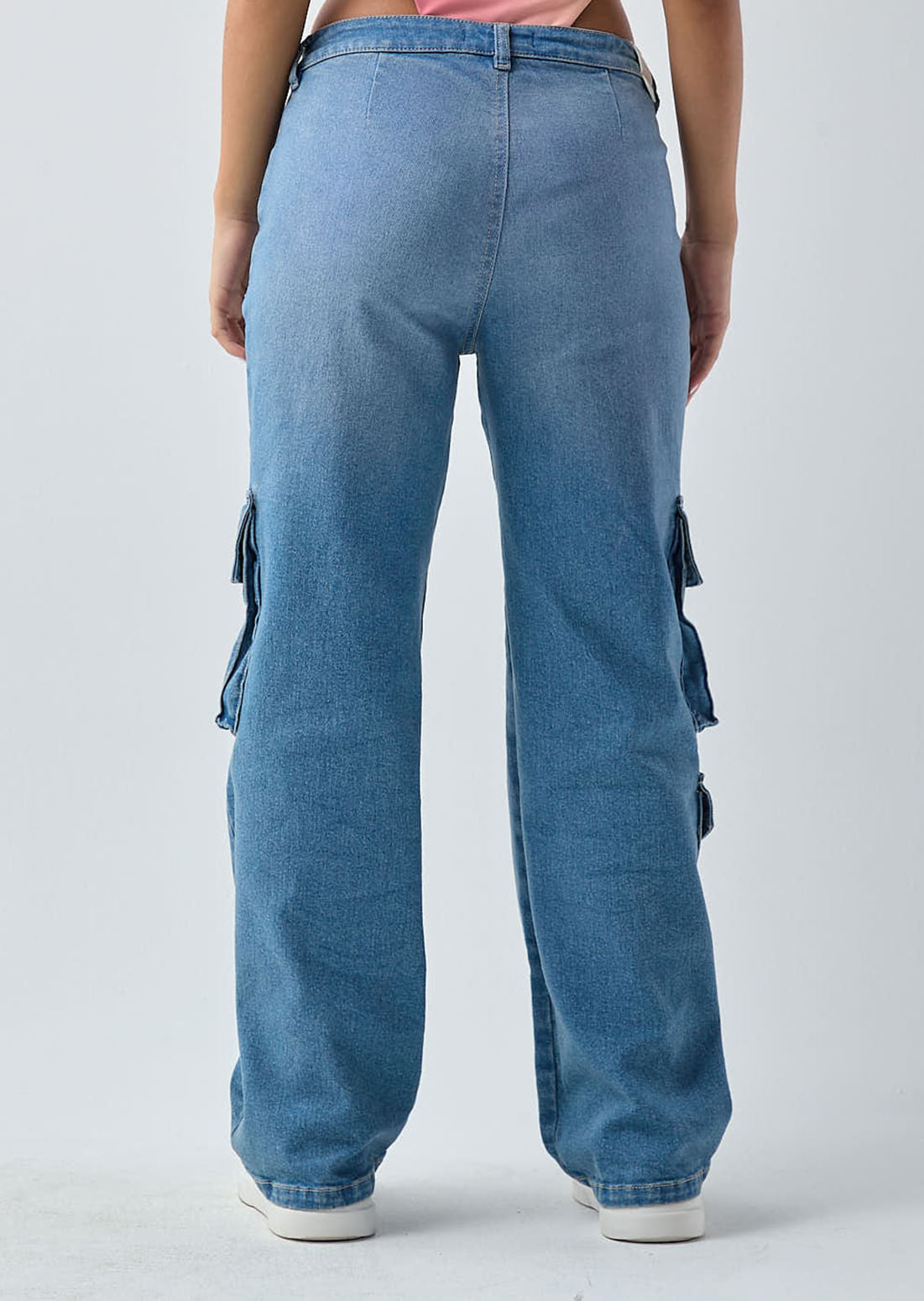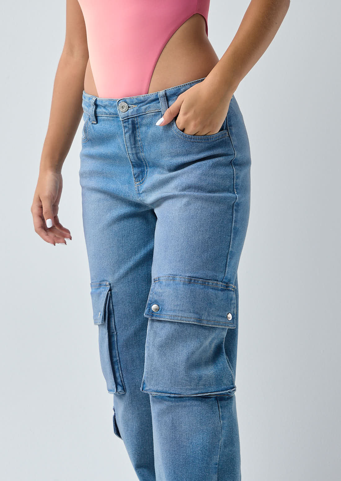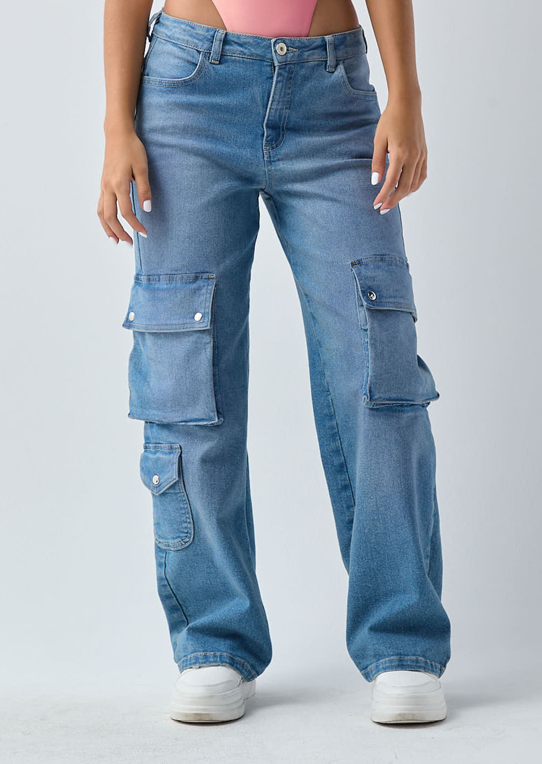 Jean cargo, tiro alto, lavado medio, bolsillos en costados con tapas y broches para adolescentes.
