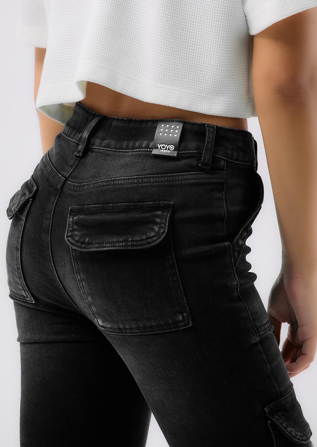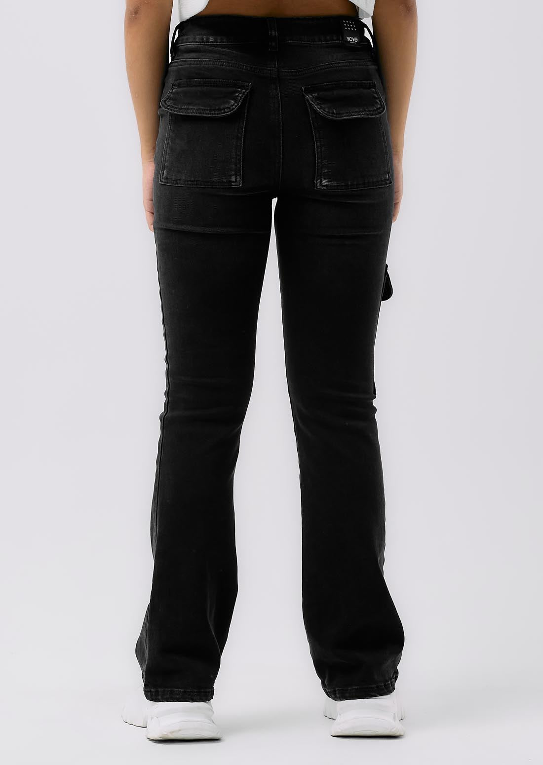 Jean cargo, tiro alto, lavado negro, elástico en cintura, fondo entero, bolsillo de costado con tapa y hebilla para jóvenes.