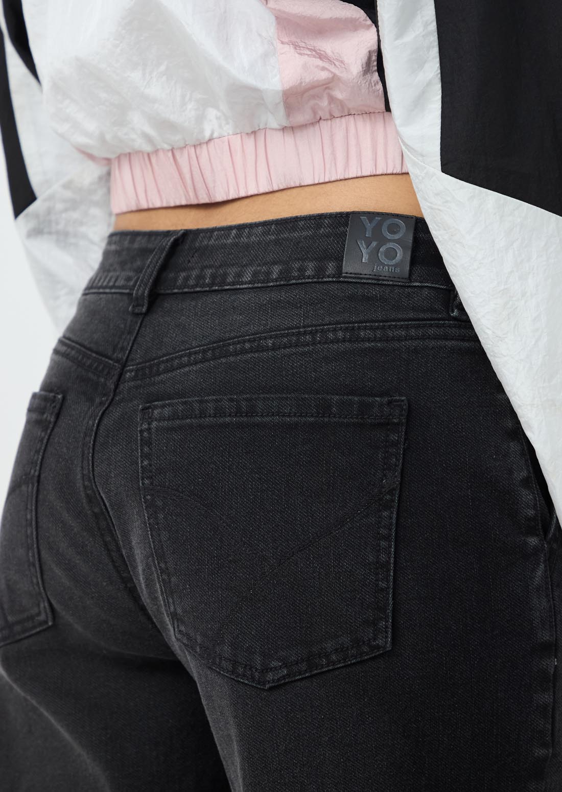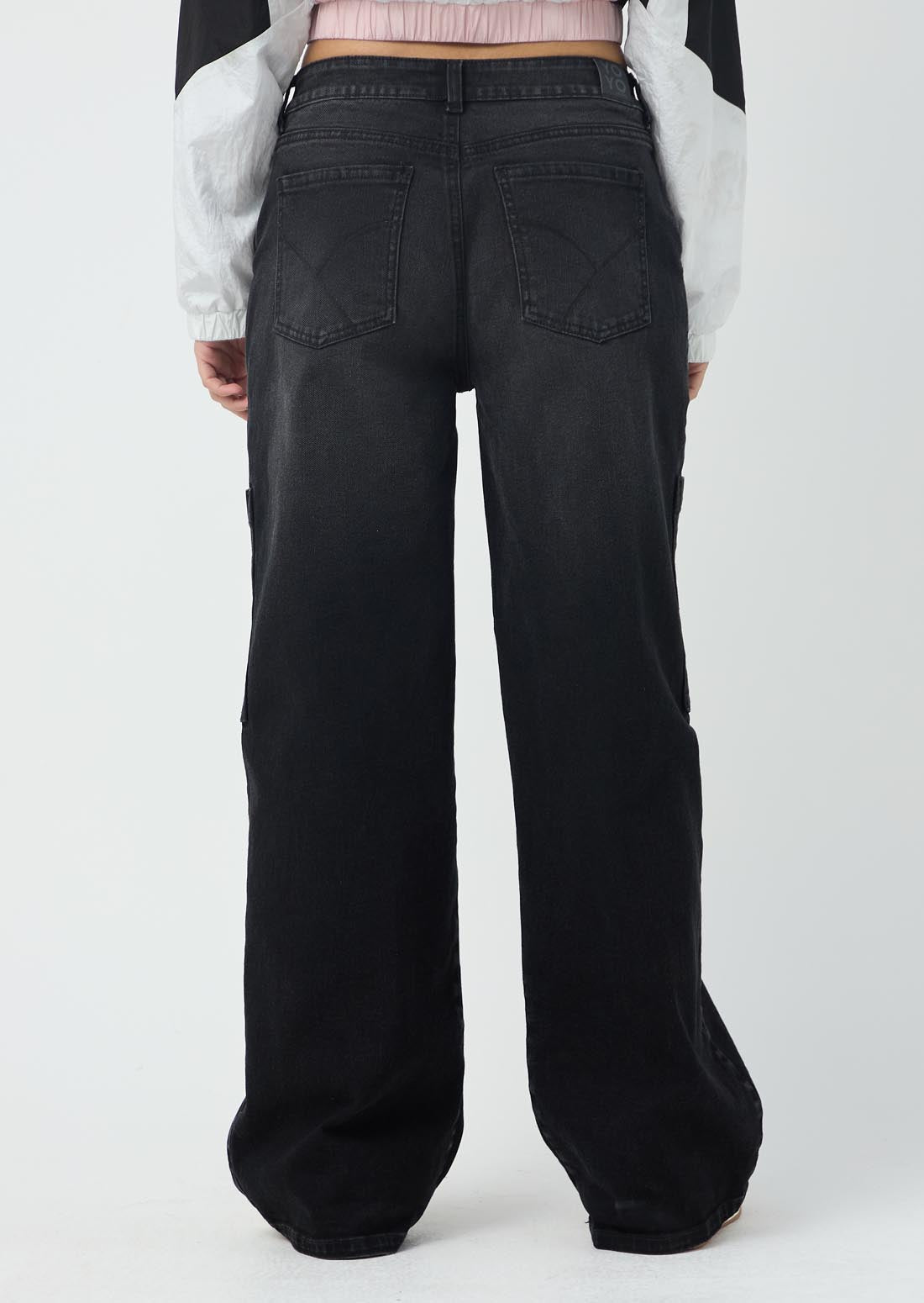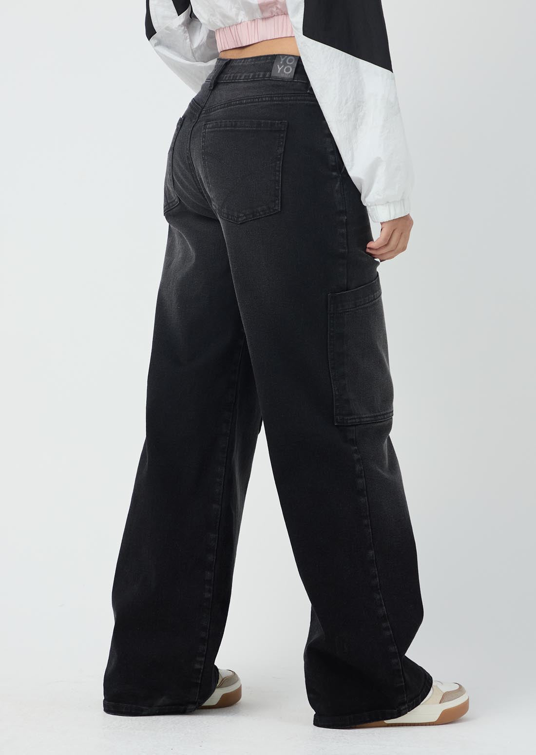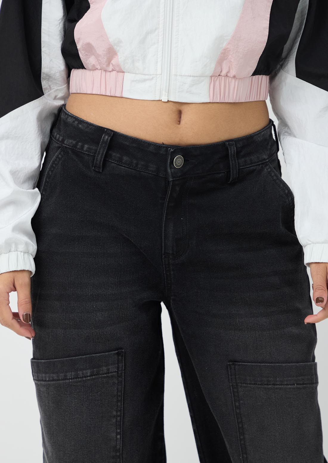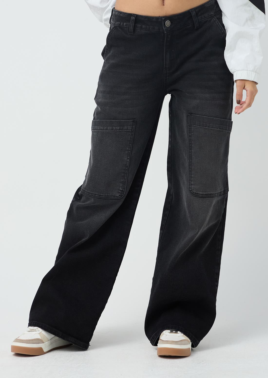 Jean cargo, tiro bajo, lavado negro y fondo entero para jóvenes