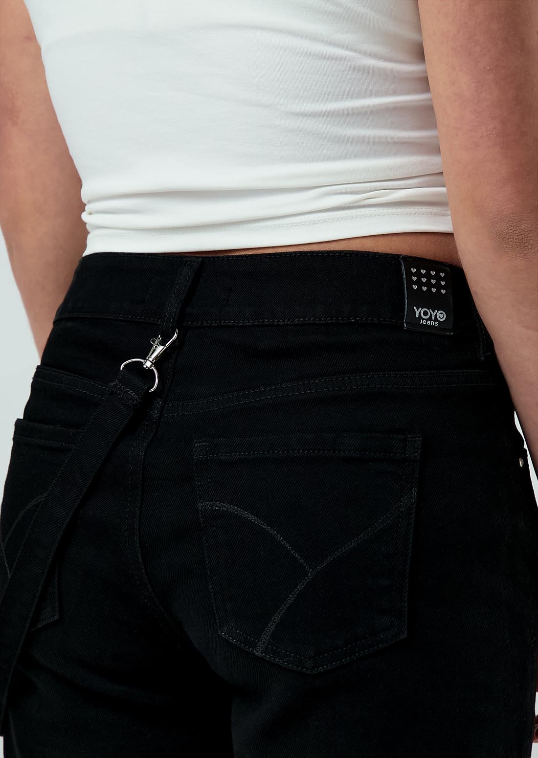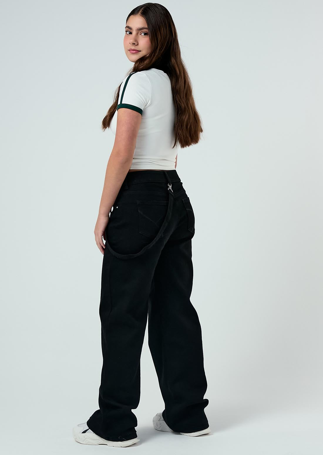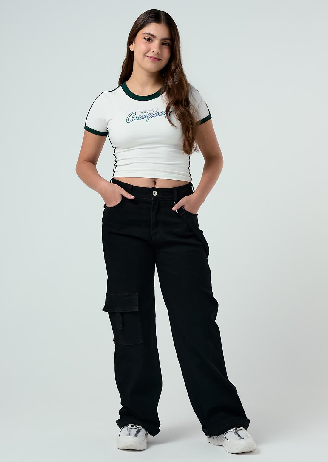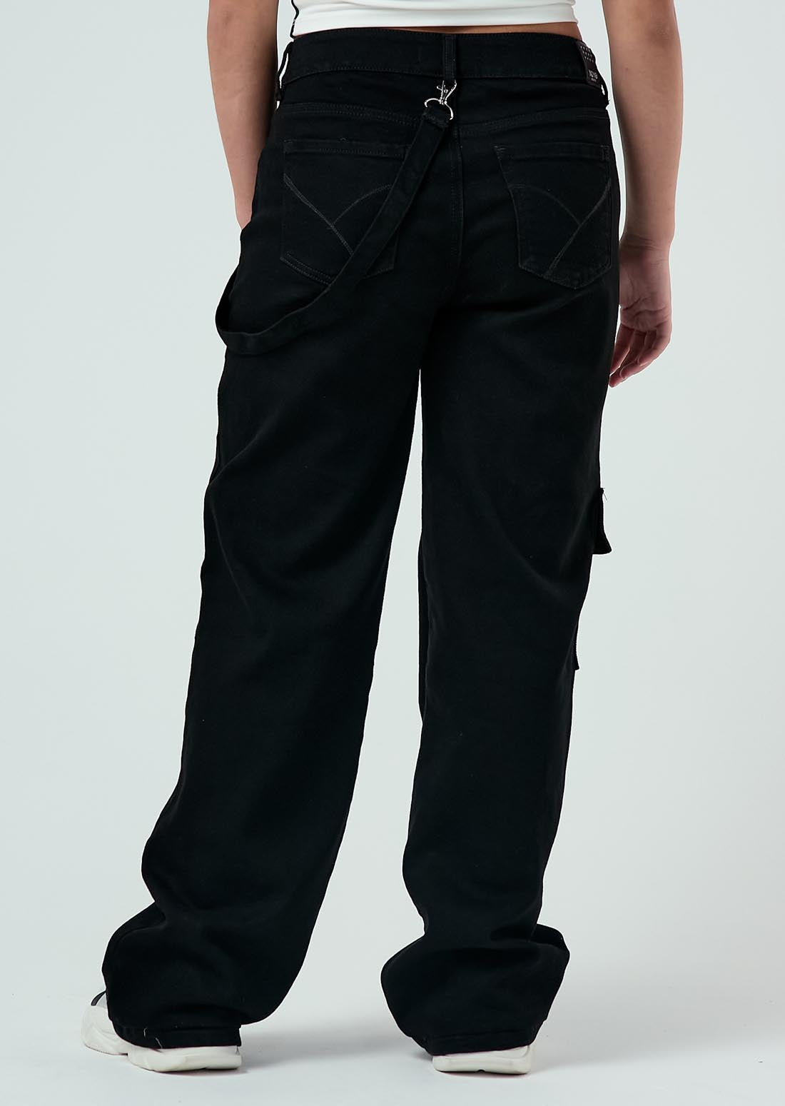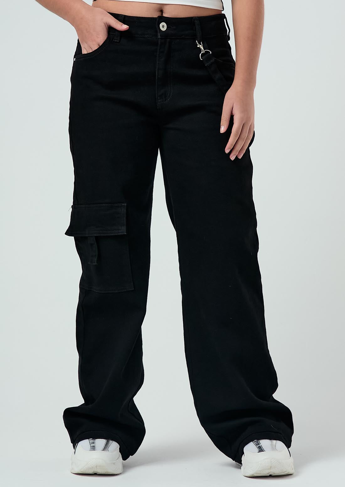 Jean cargo, tiro alto, color negro, fondo entero y bolsillos para adolescentes.
