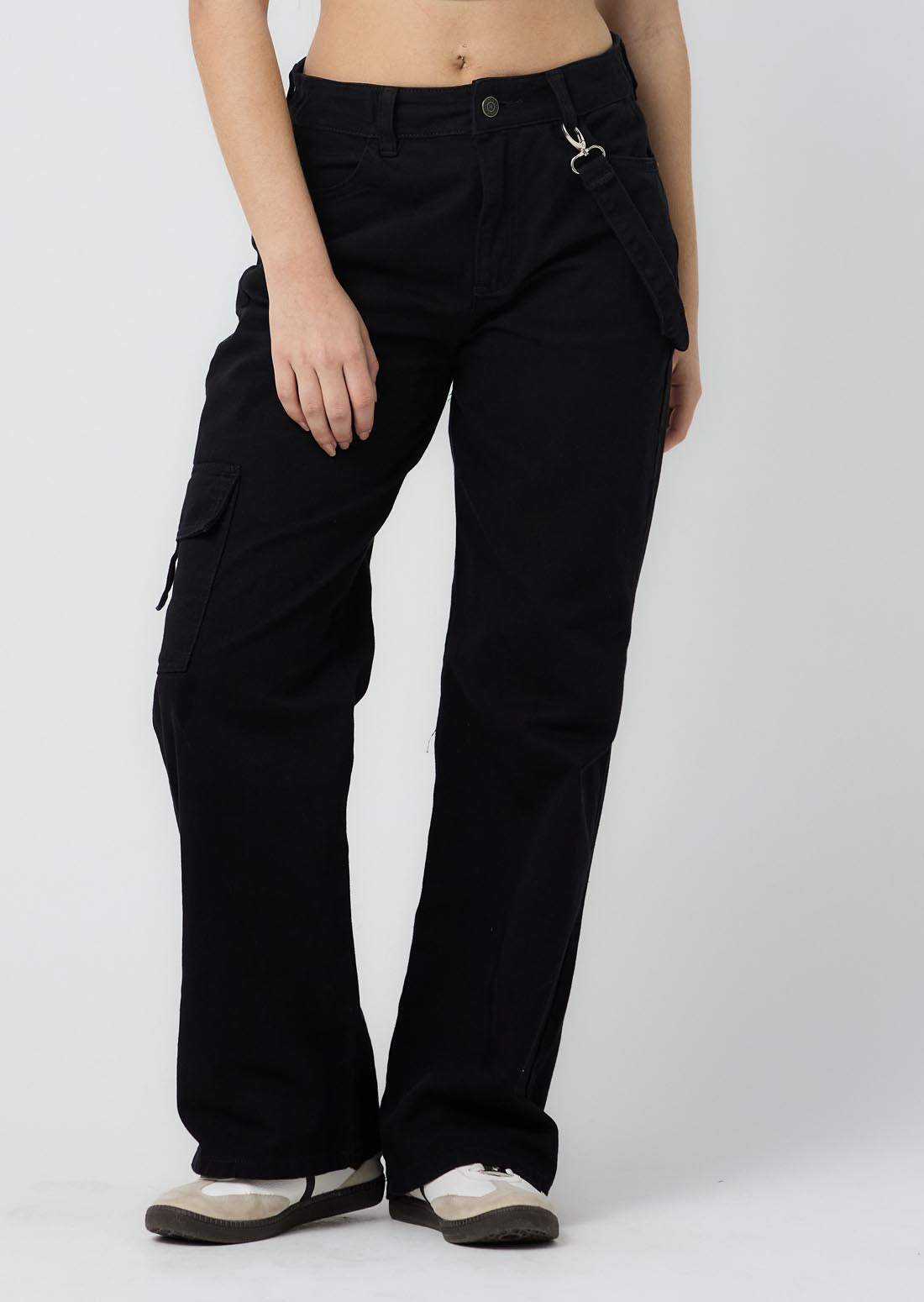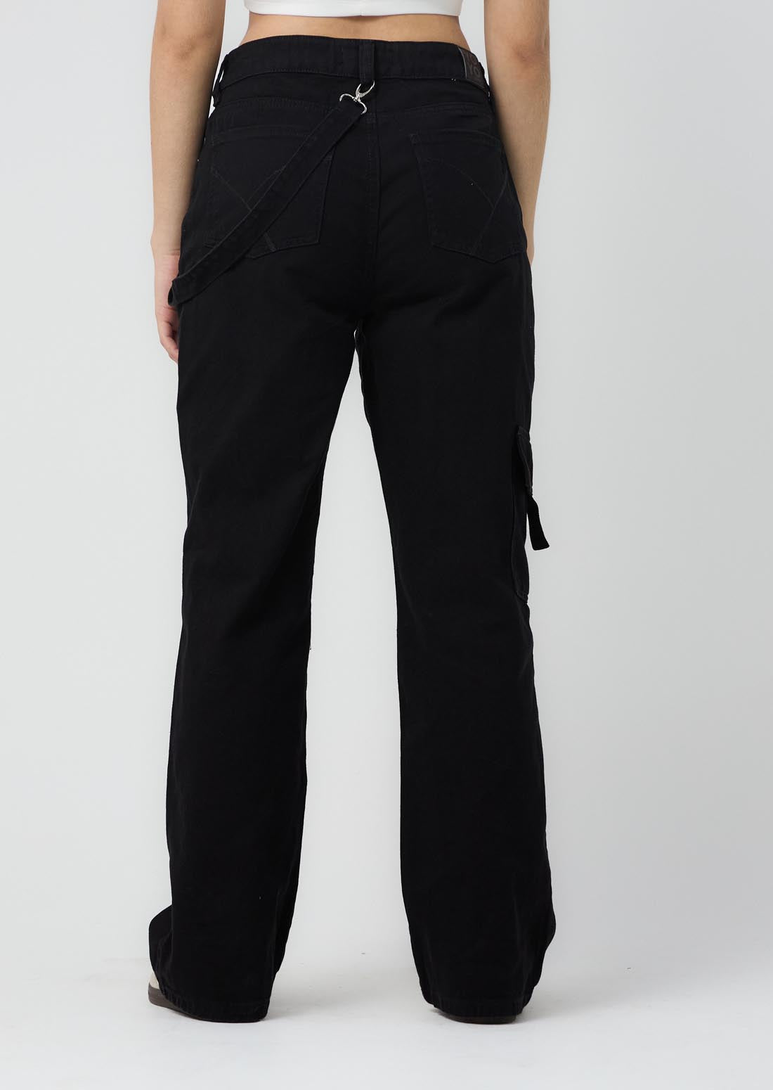 Jean cargo, tiro alto, lavado negro, bolsillos funcionales y fondo entero para jóvenes.