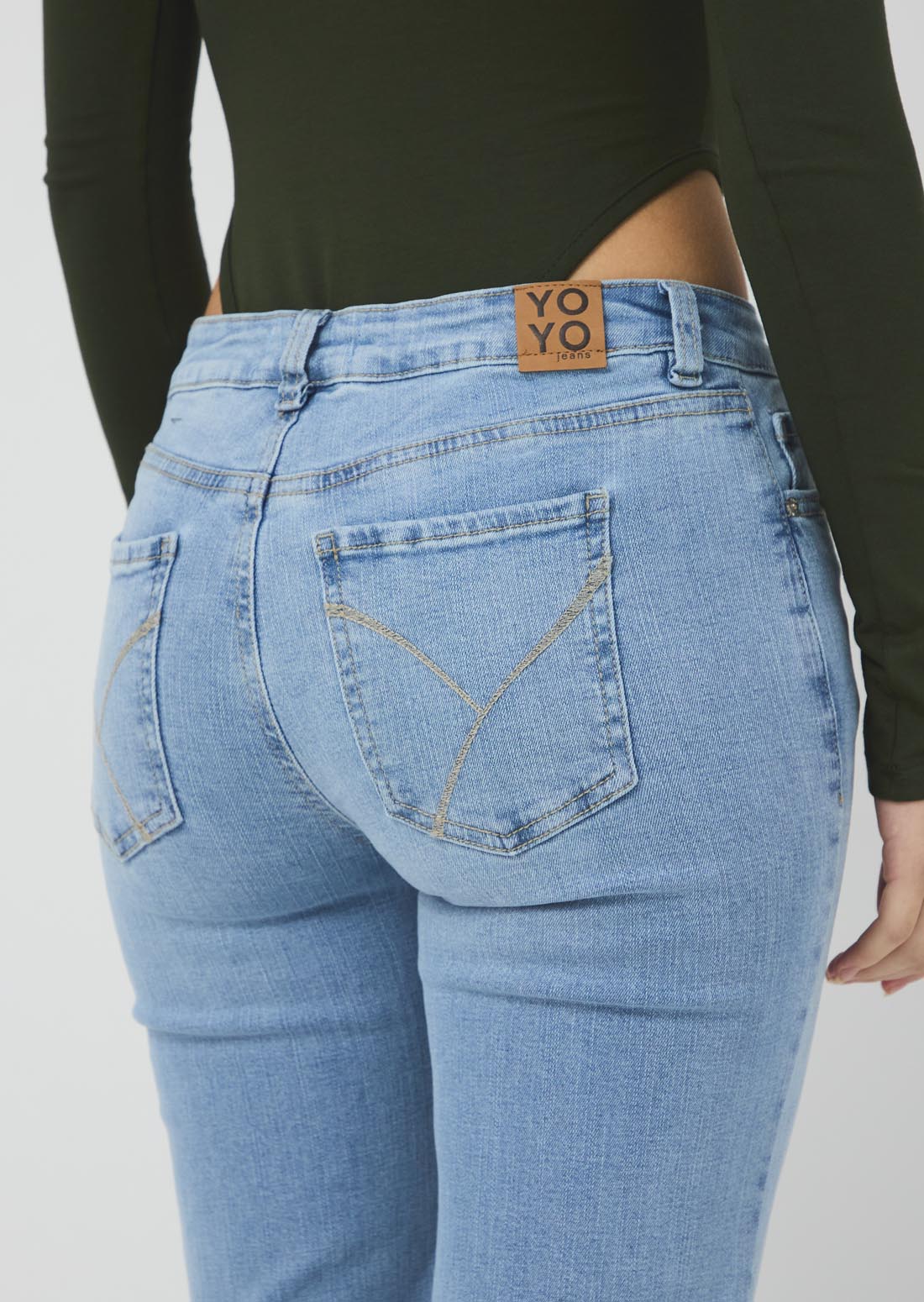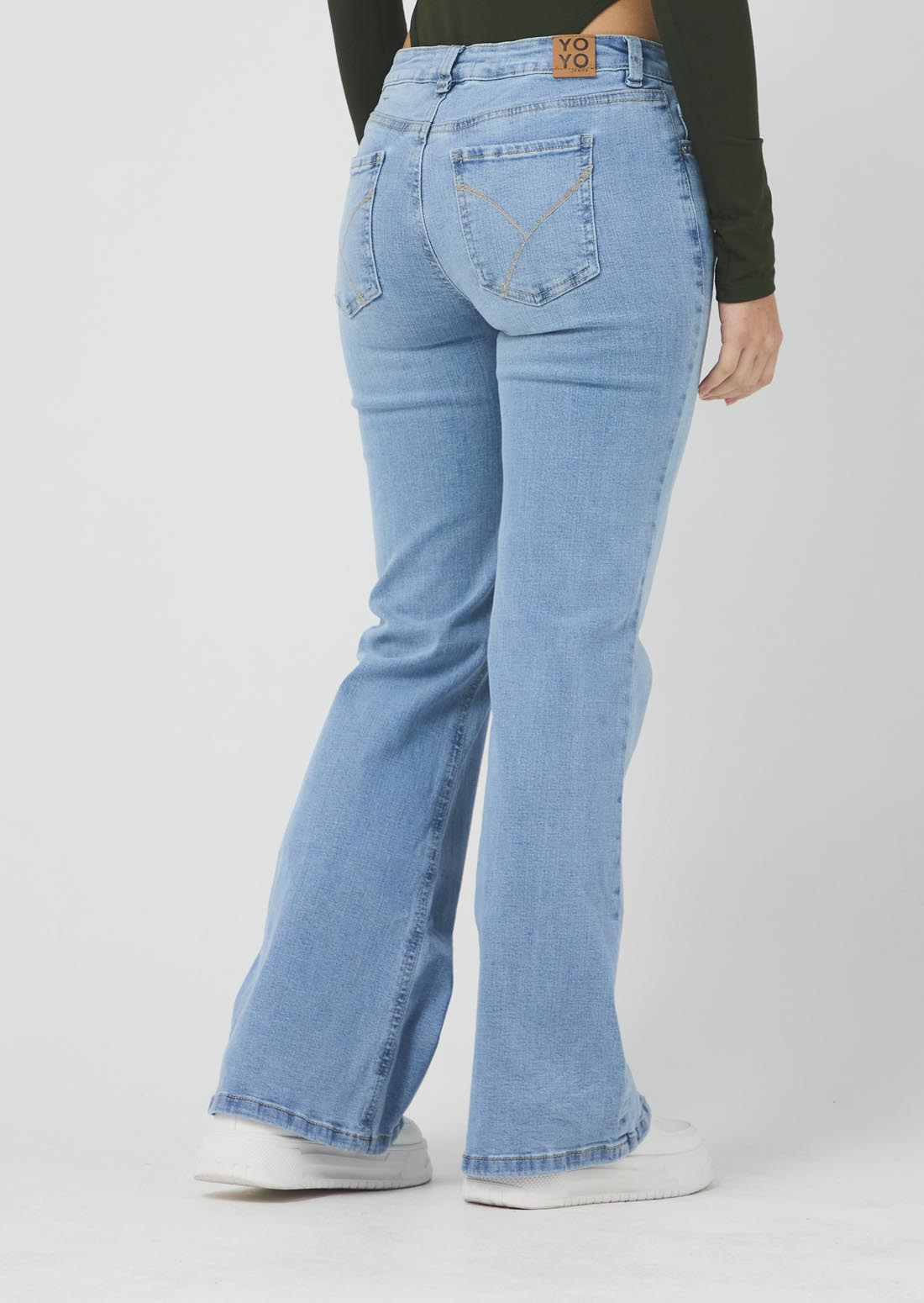 Jean cool tiro bajo, lavado claro, fondo entero y con bolsillos para jóvenes.