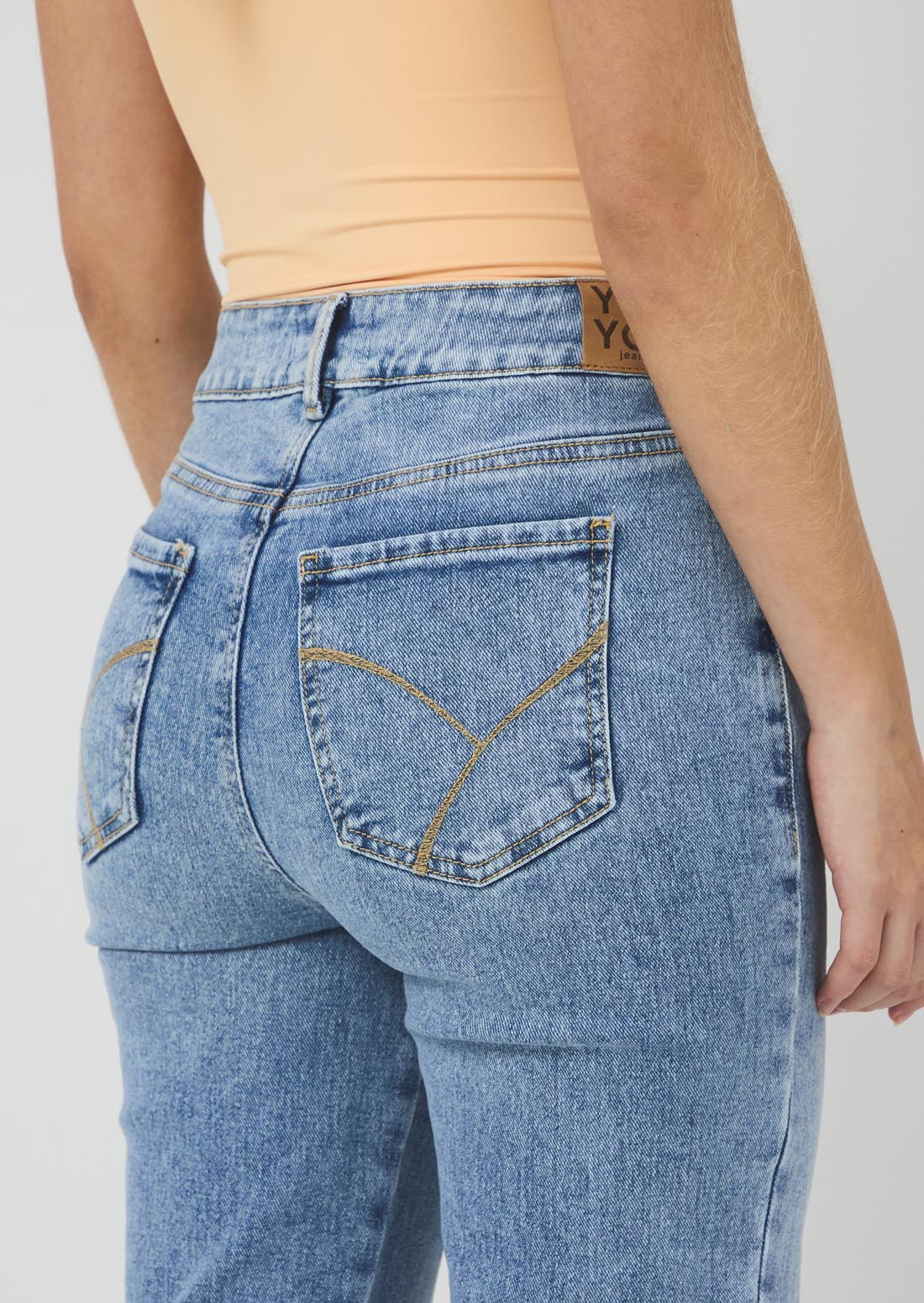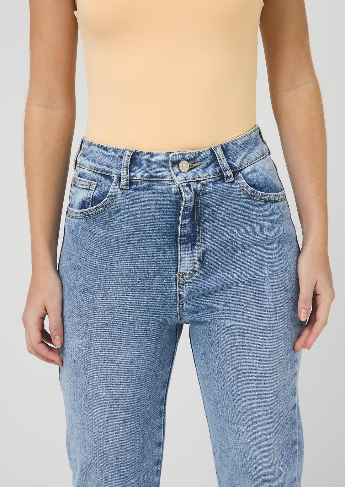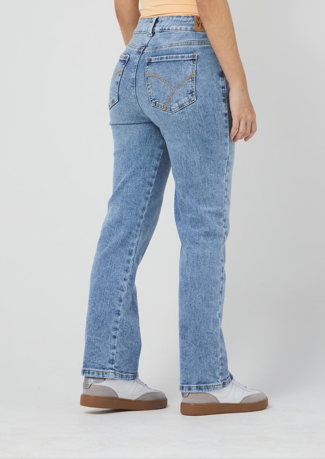 Jean cool tiro alto, lavado medio, bota tubo y fondo entero para jóvenes.