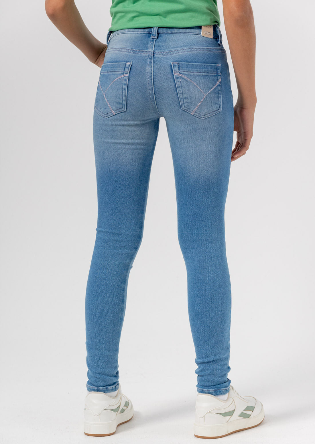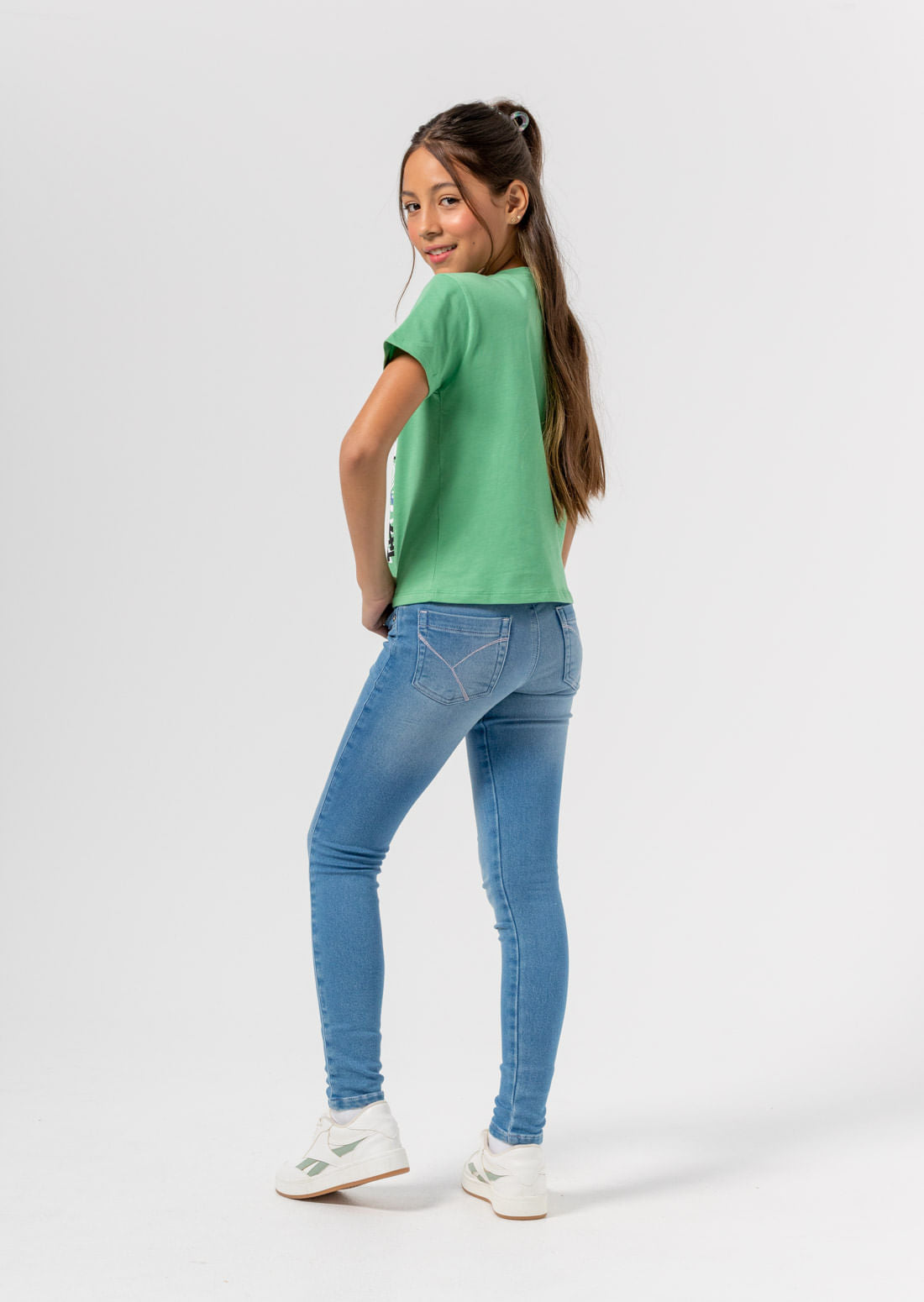 Jean crazy, tiro alto, lavado claro, bolsillos funcionales, elástico en cintura y fondo entero para niñas.