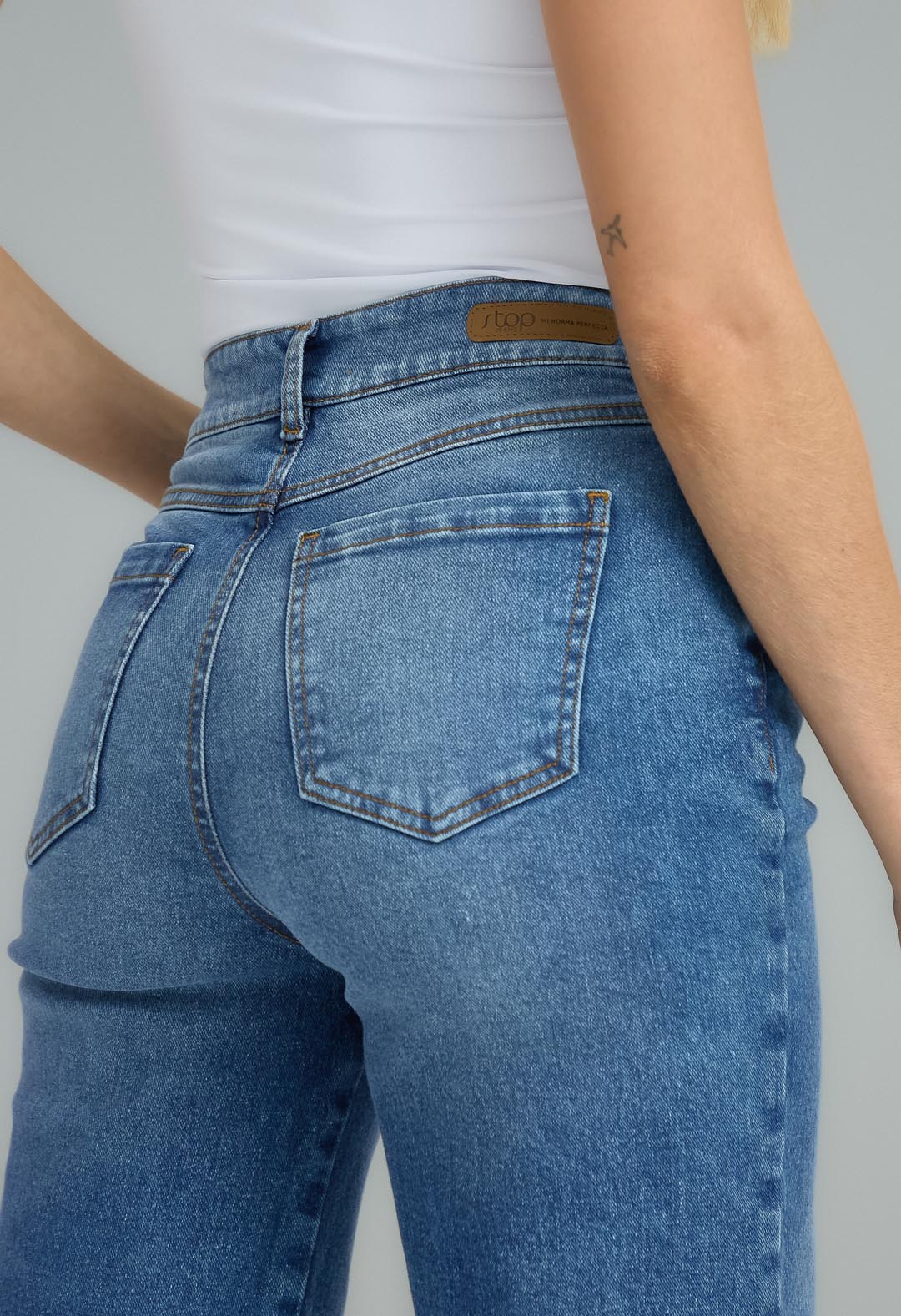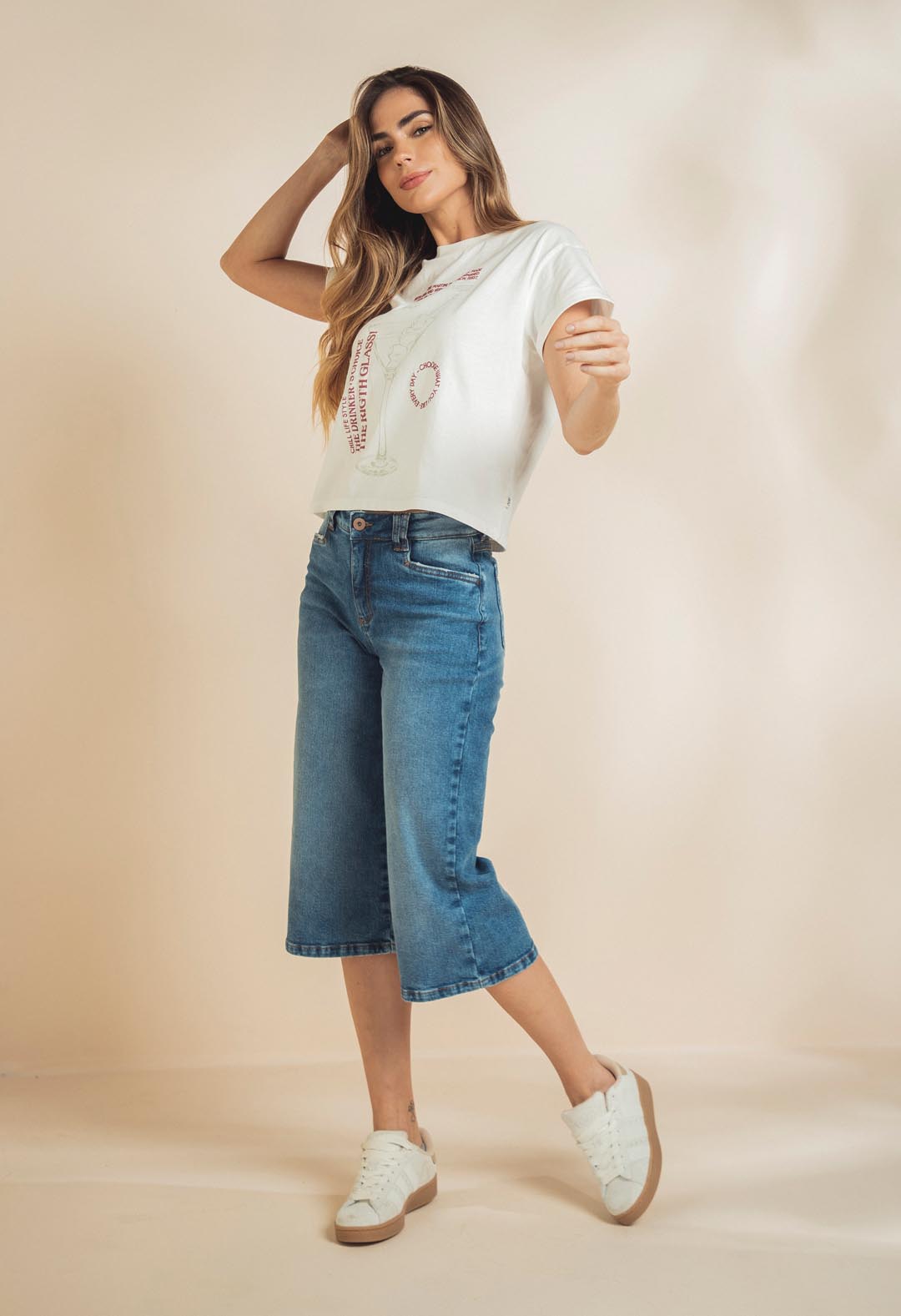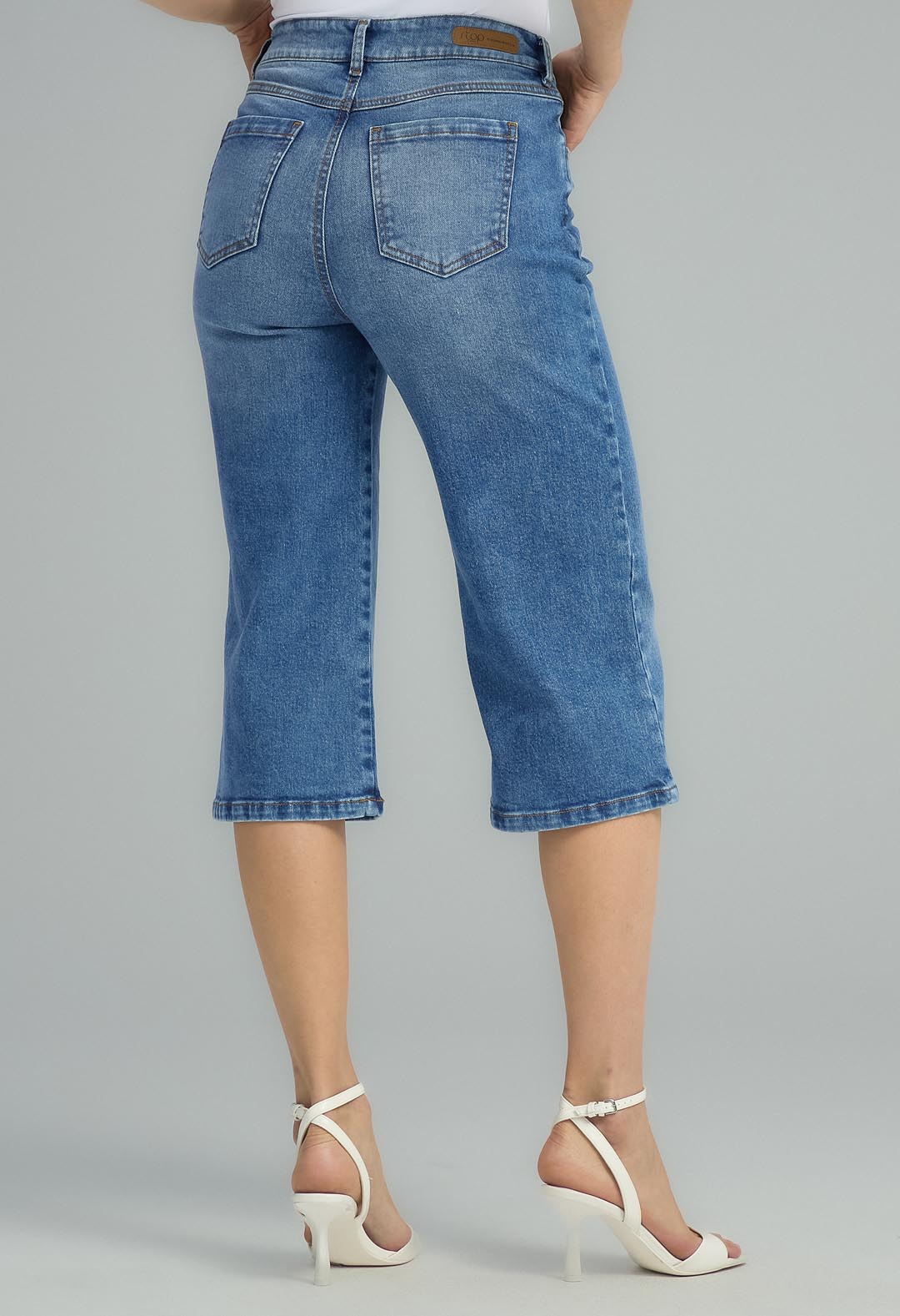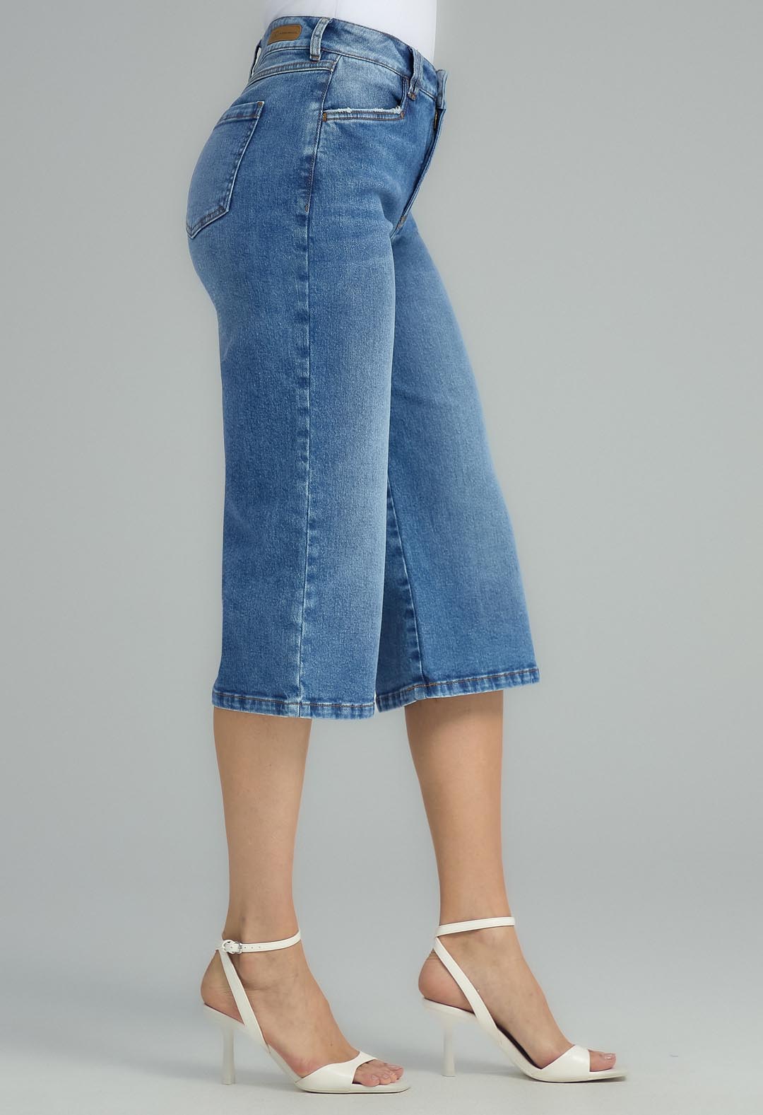 Jean culotte, tiro alto, lavado medio, ruedo amplio, bolsillos y fondo entero para mujeres.